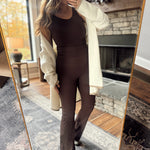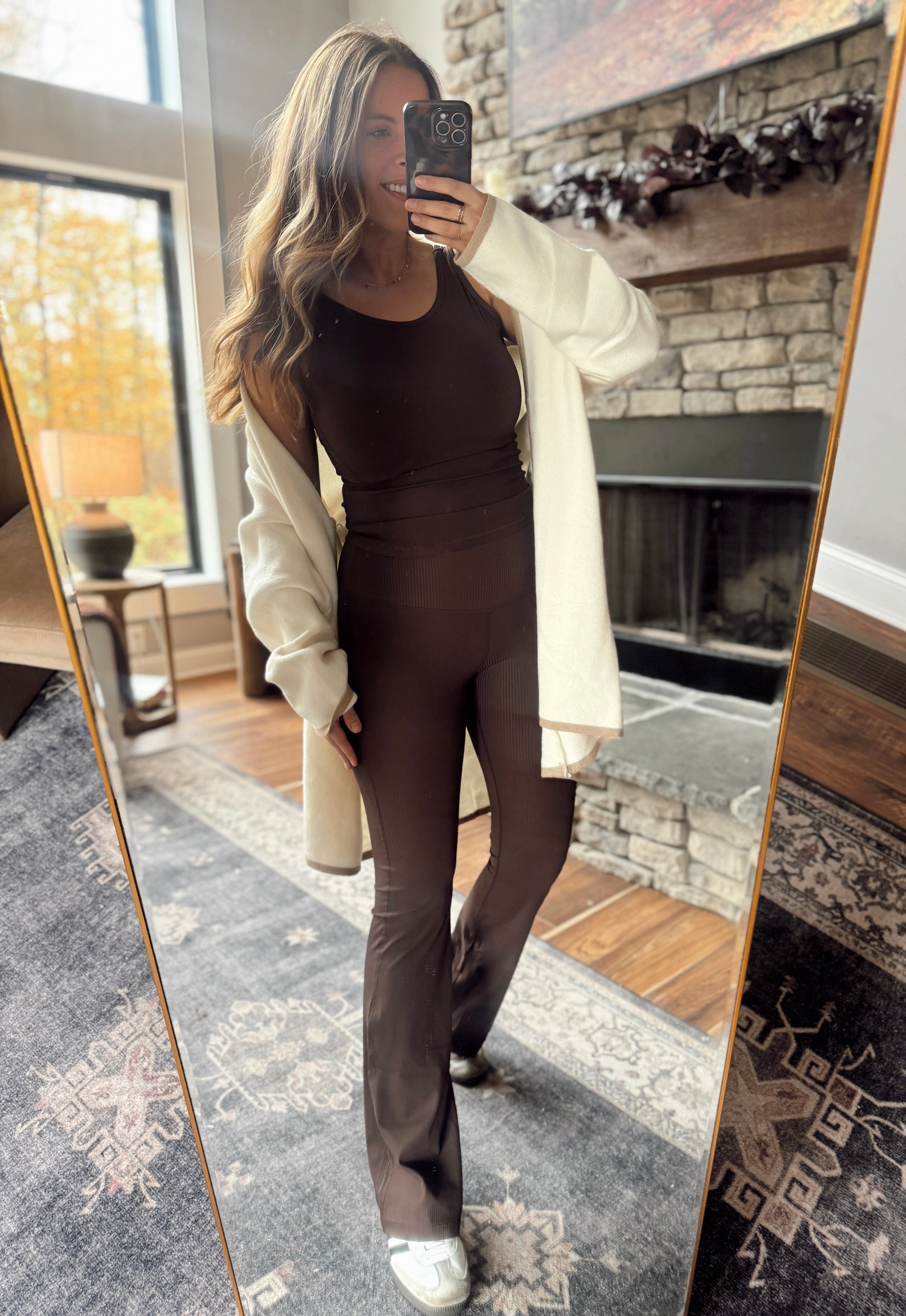 Pair with the matching coffee ribbed tank for a comfy-chic set that’s easy to dress up with a cardigan or denim jacket.