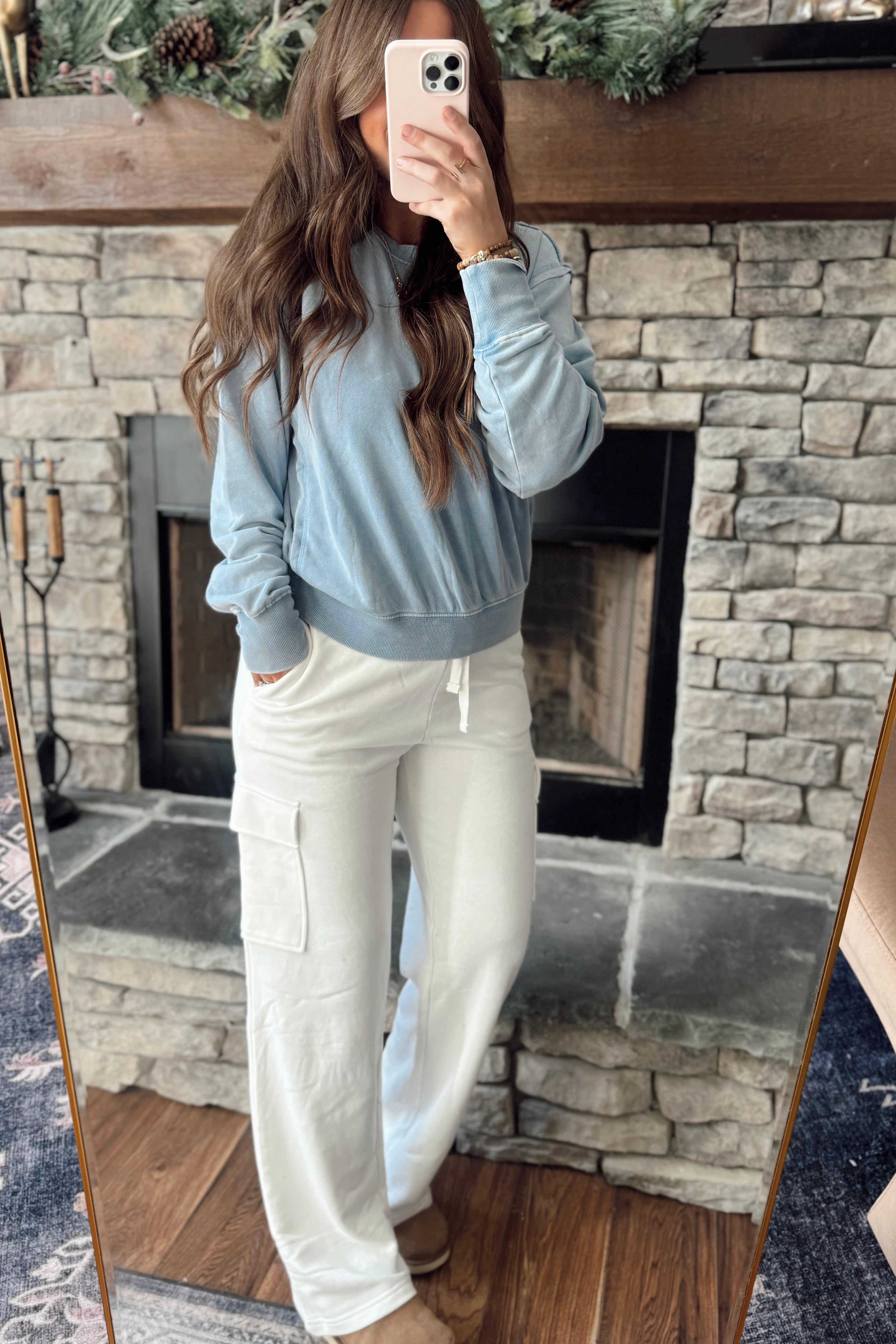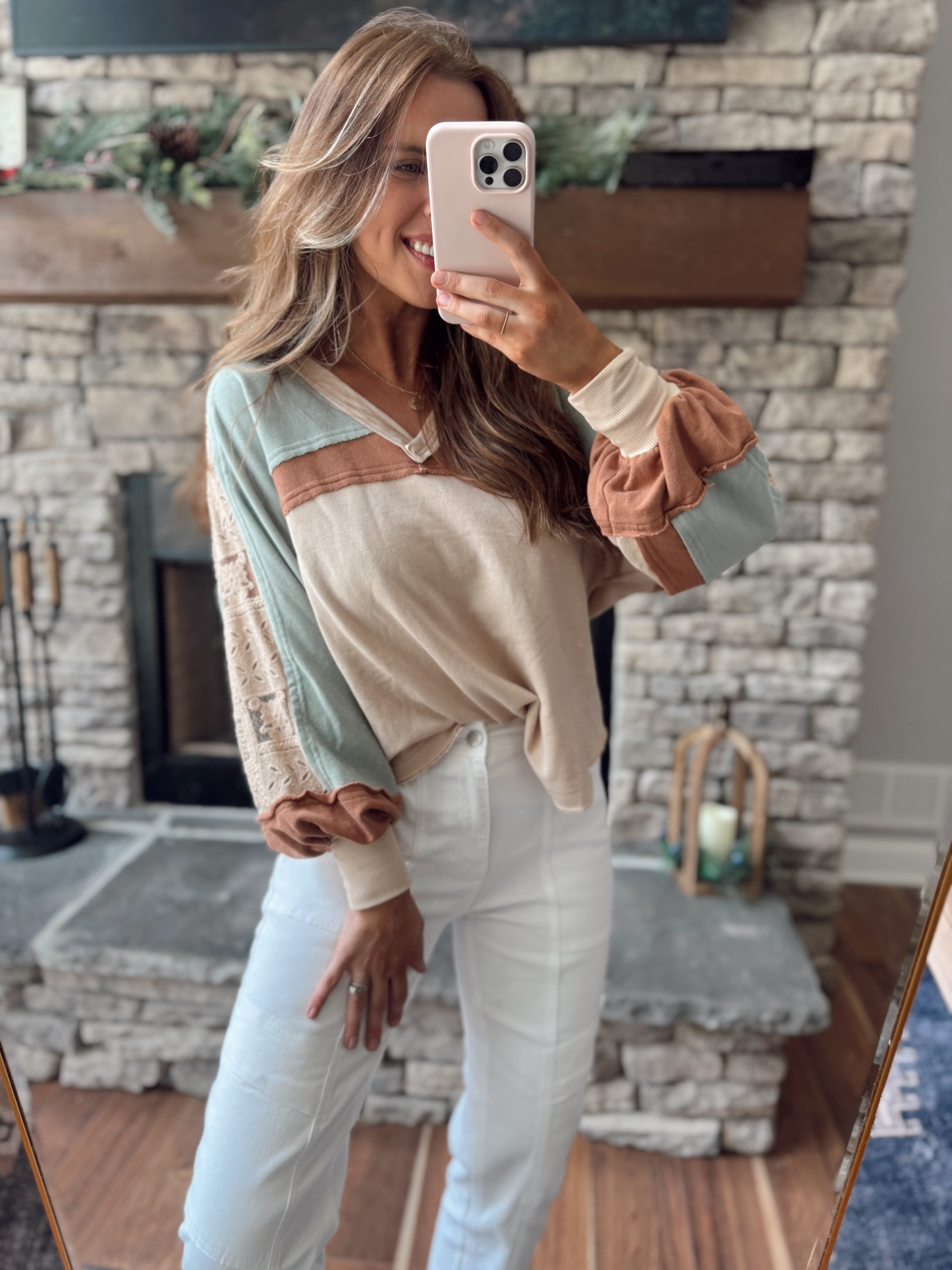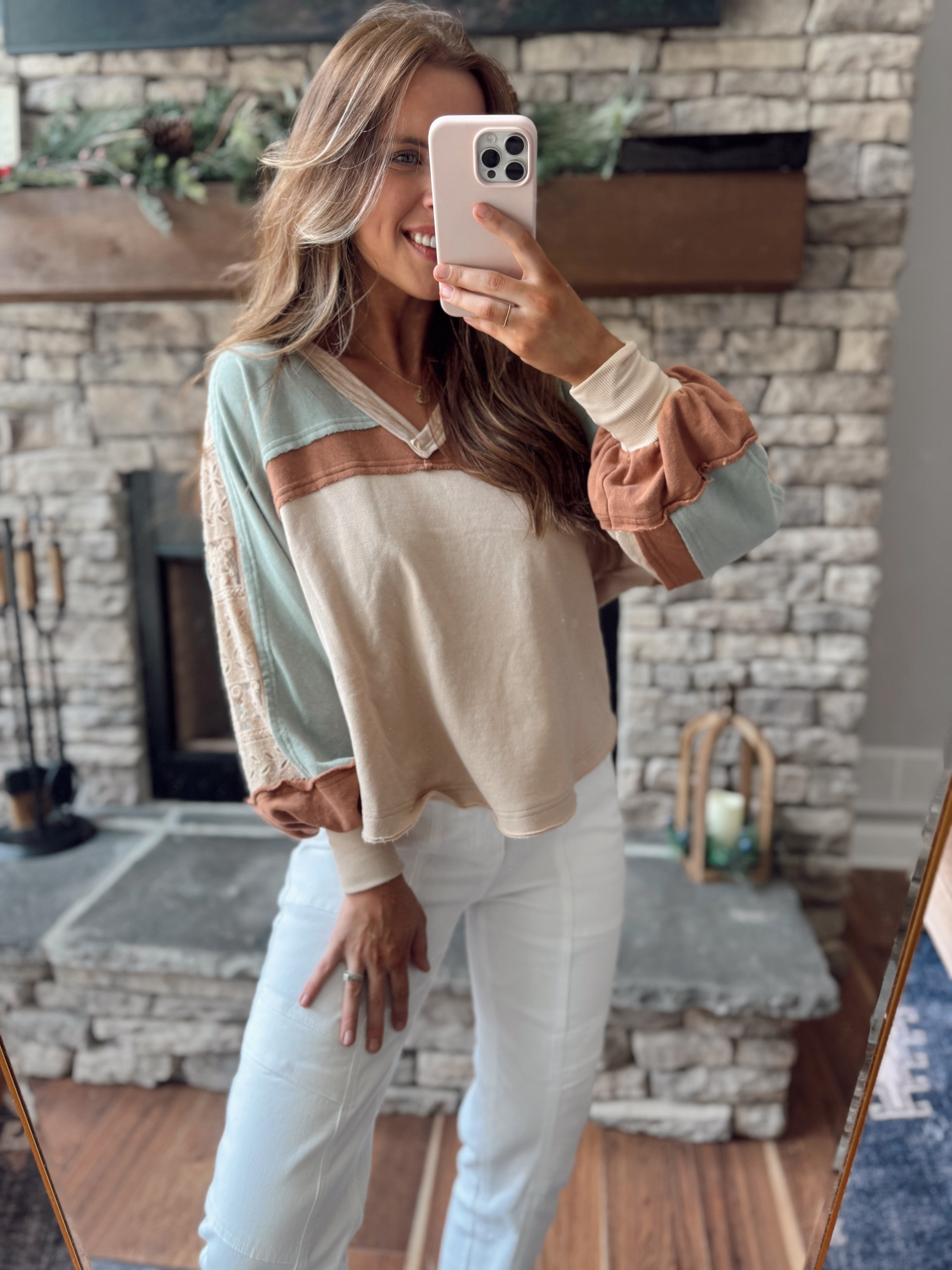 Oatmilk Multi V-Neck French Terry Colorblock & Lace Long Sleeve