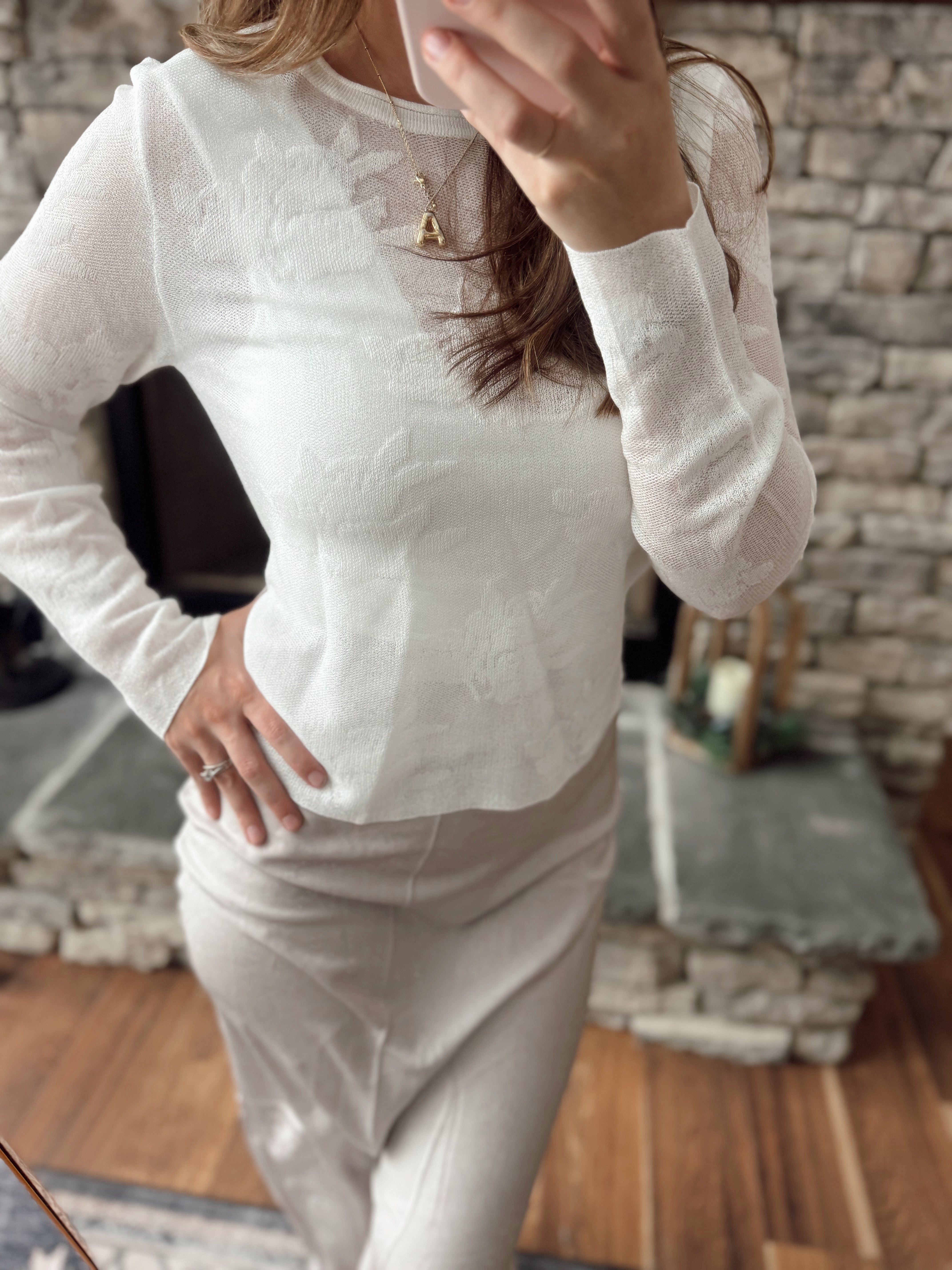 Off White Floral Pattern Sheer Knit Top