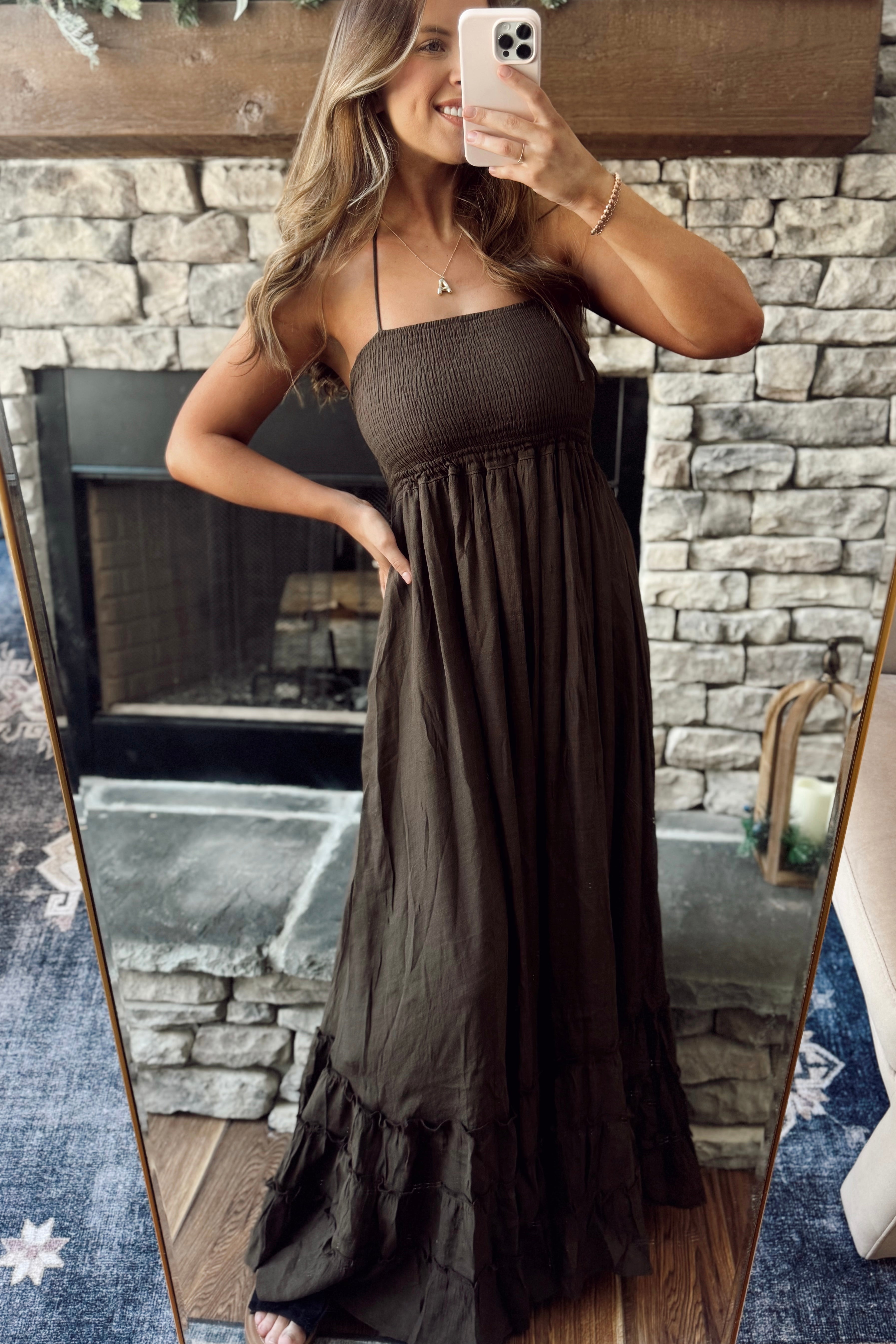 On My Level Mocha Open Back Smocked Tiered Maxi