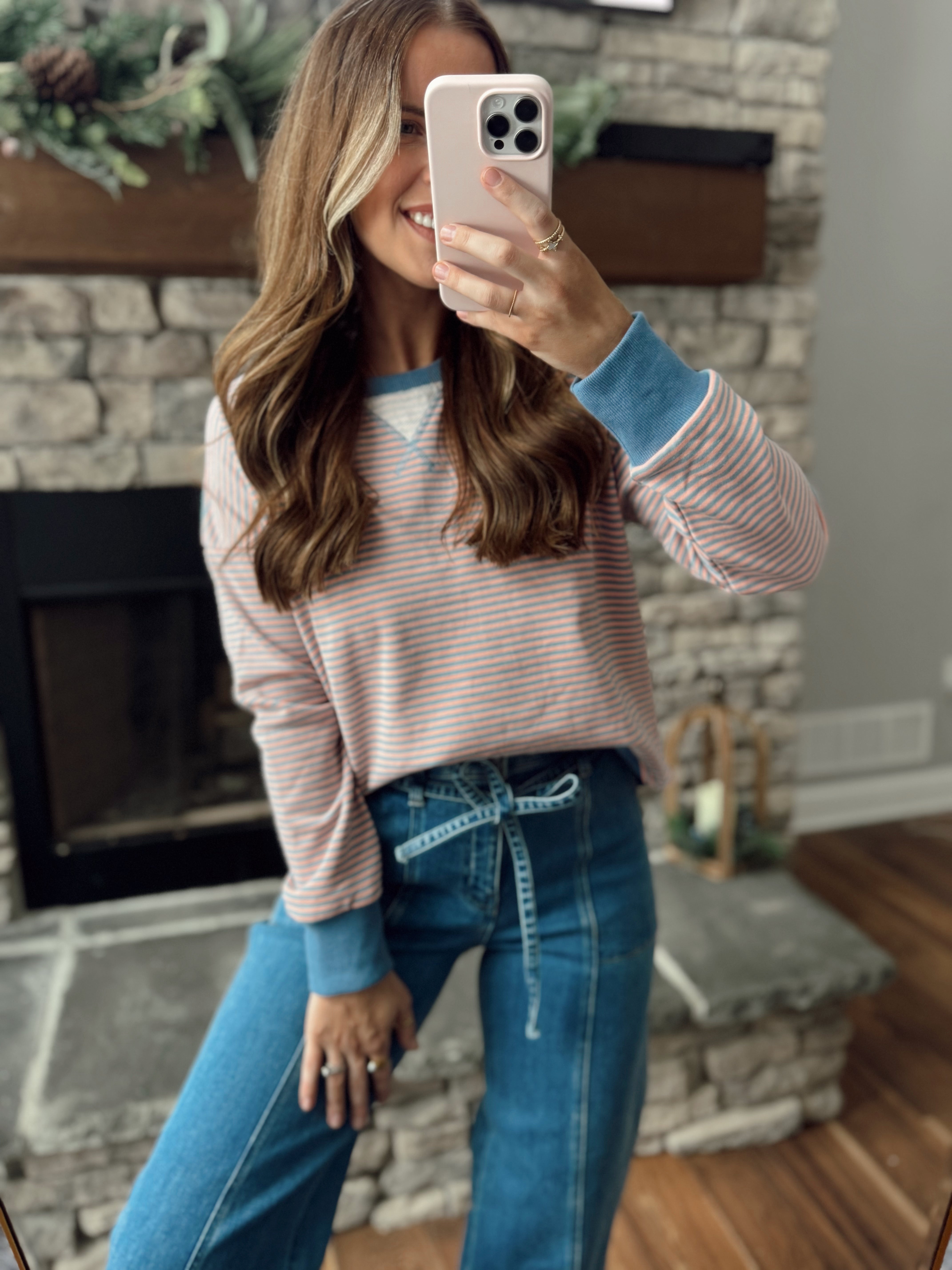 On Point Ocean Blue/Coral Mini Stripe Oversized Crew