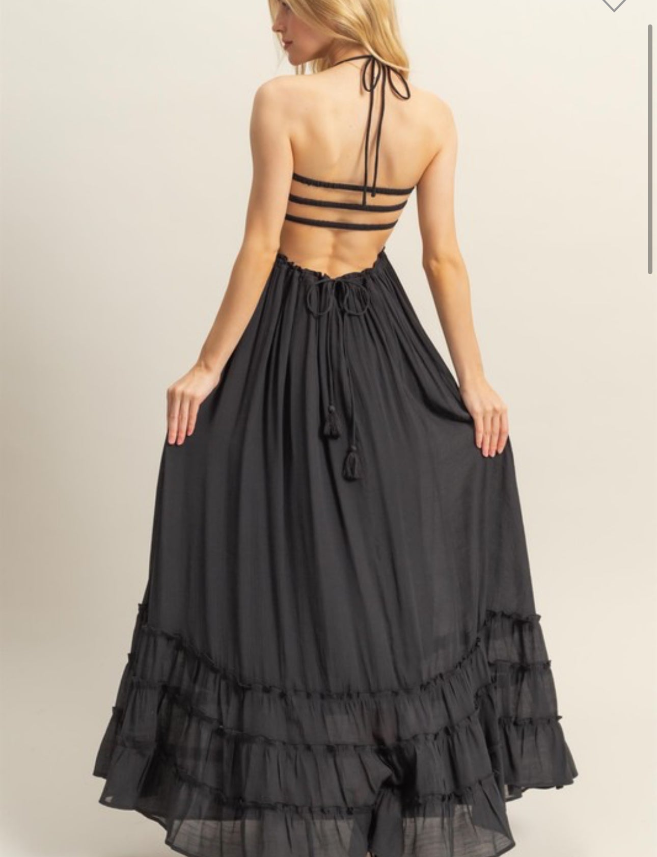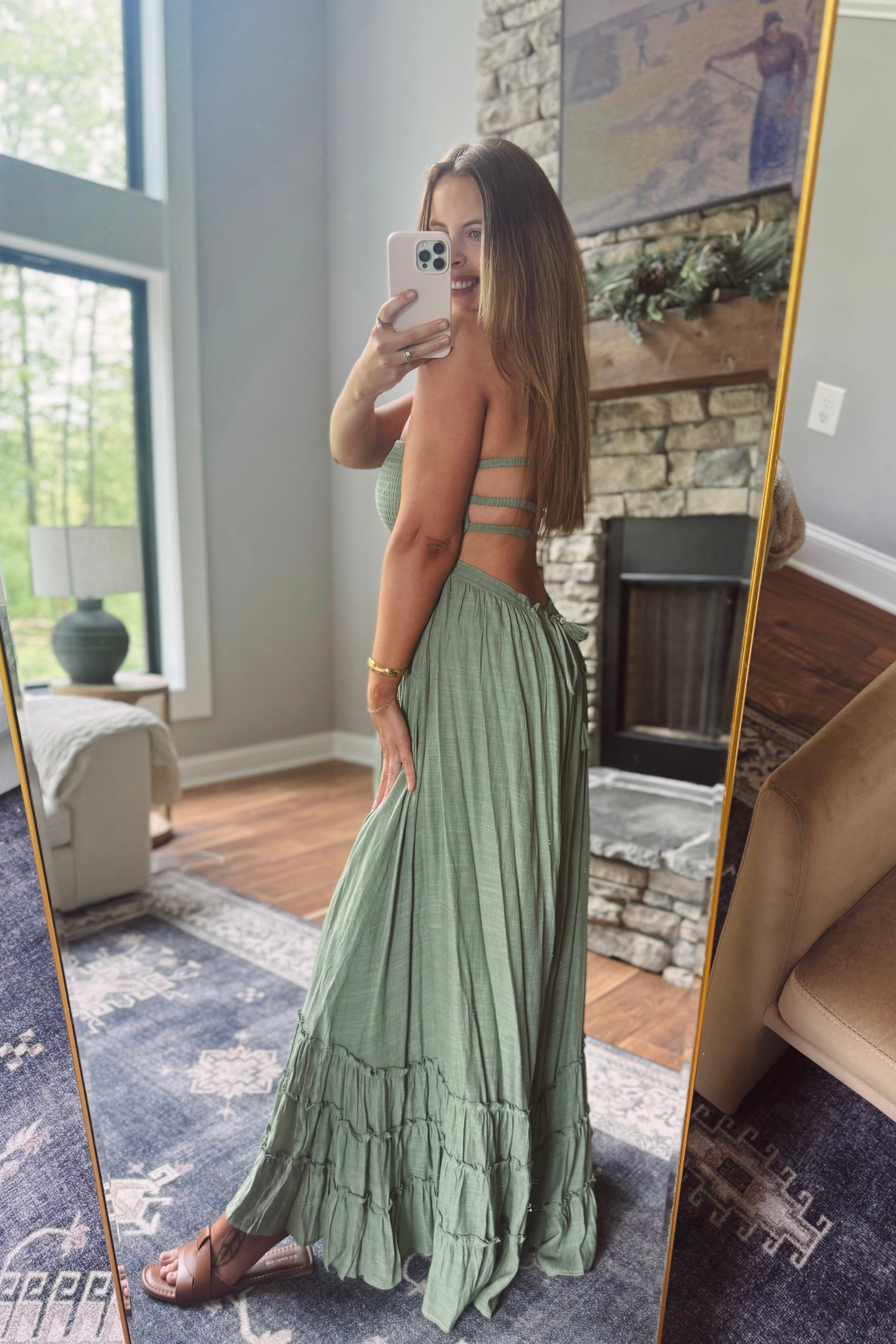 On My Level L.Olive Open Back Smocked Tiered Maxi