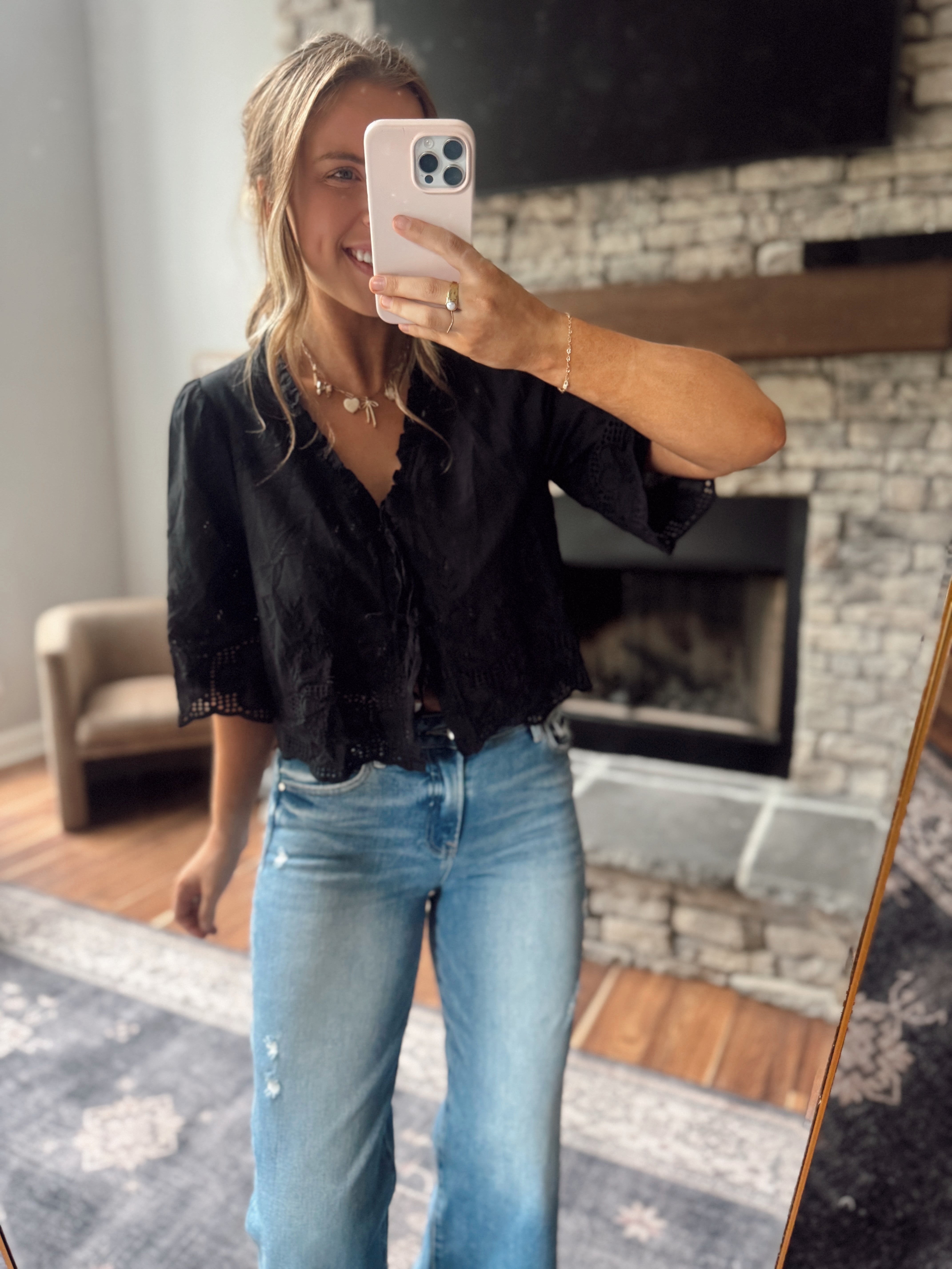 Black Azalea Floral Embroidered Tie Front Blouse