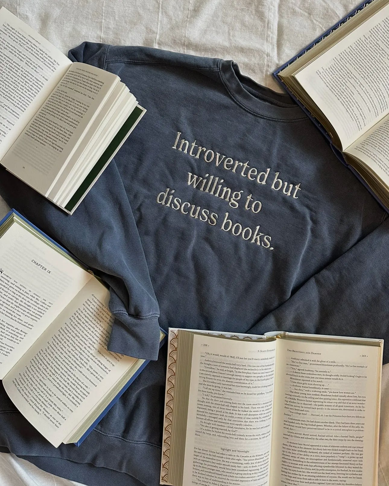 Smoky Blue Introverted But Willing to Discuss Books Embroidered Crew