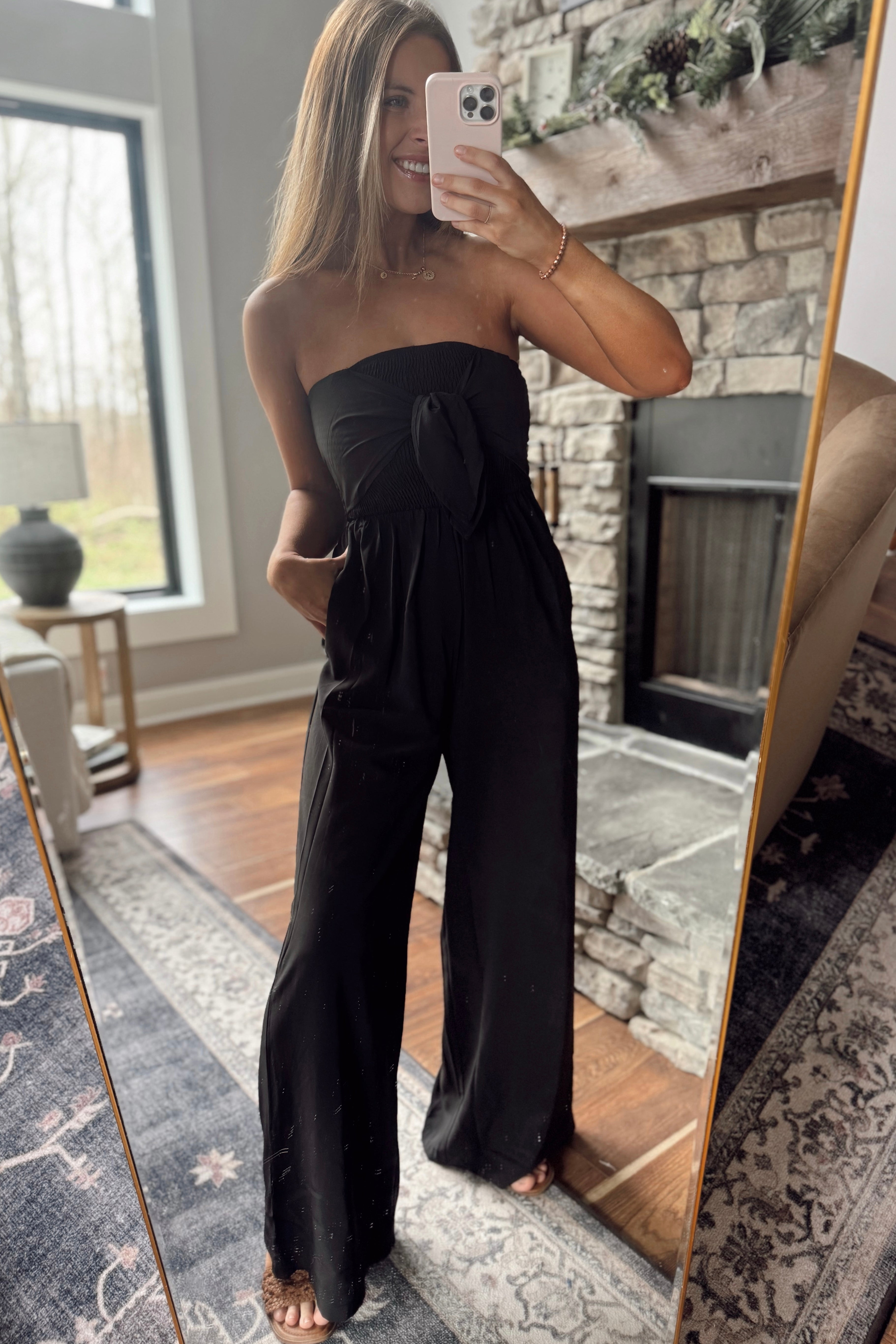 Straight To The Top Black Strapless Front Tie Jumpsuit