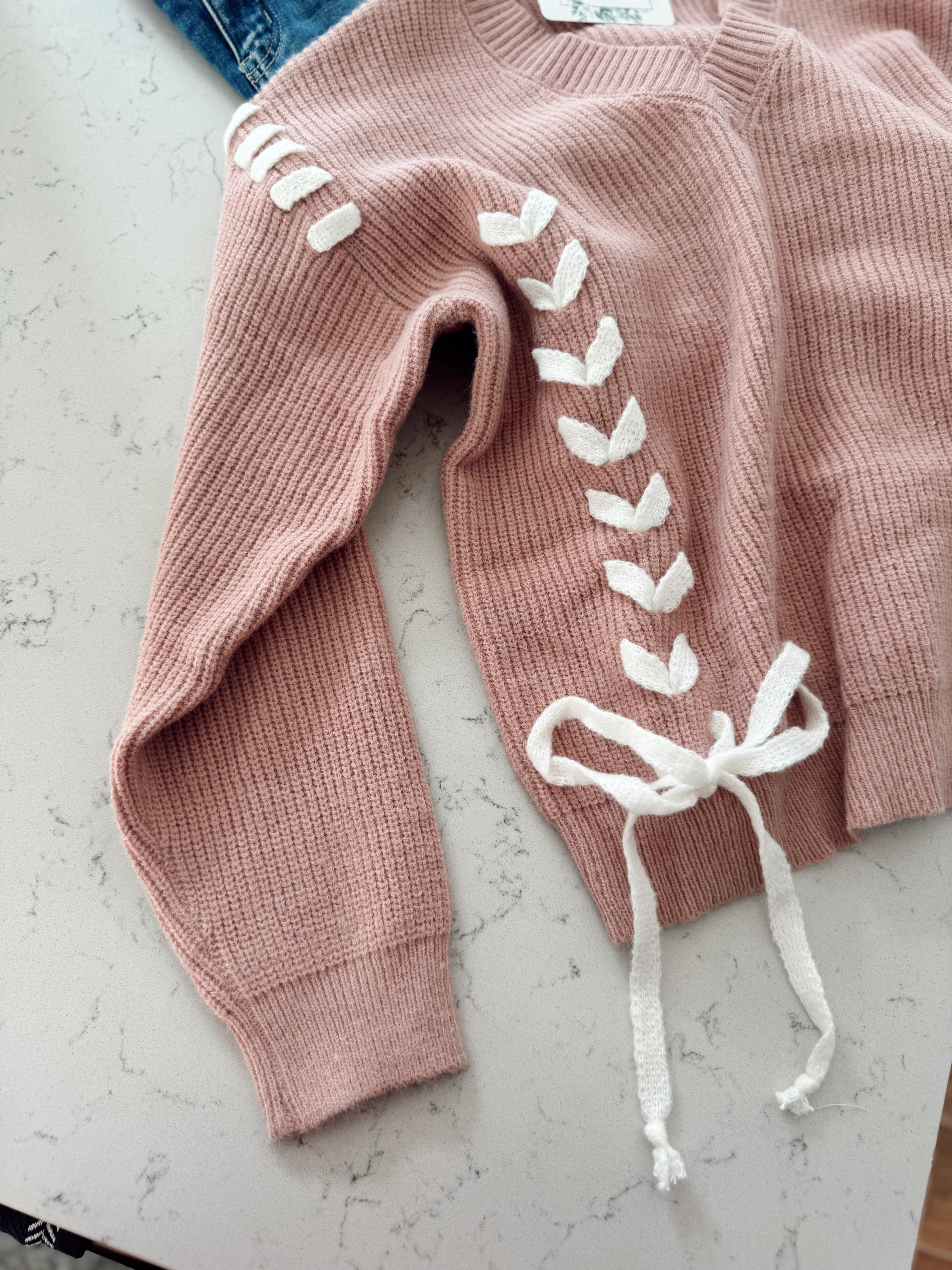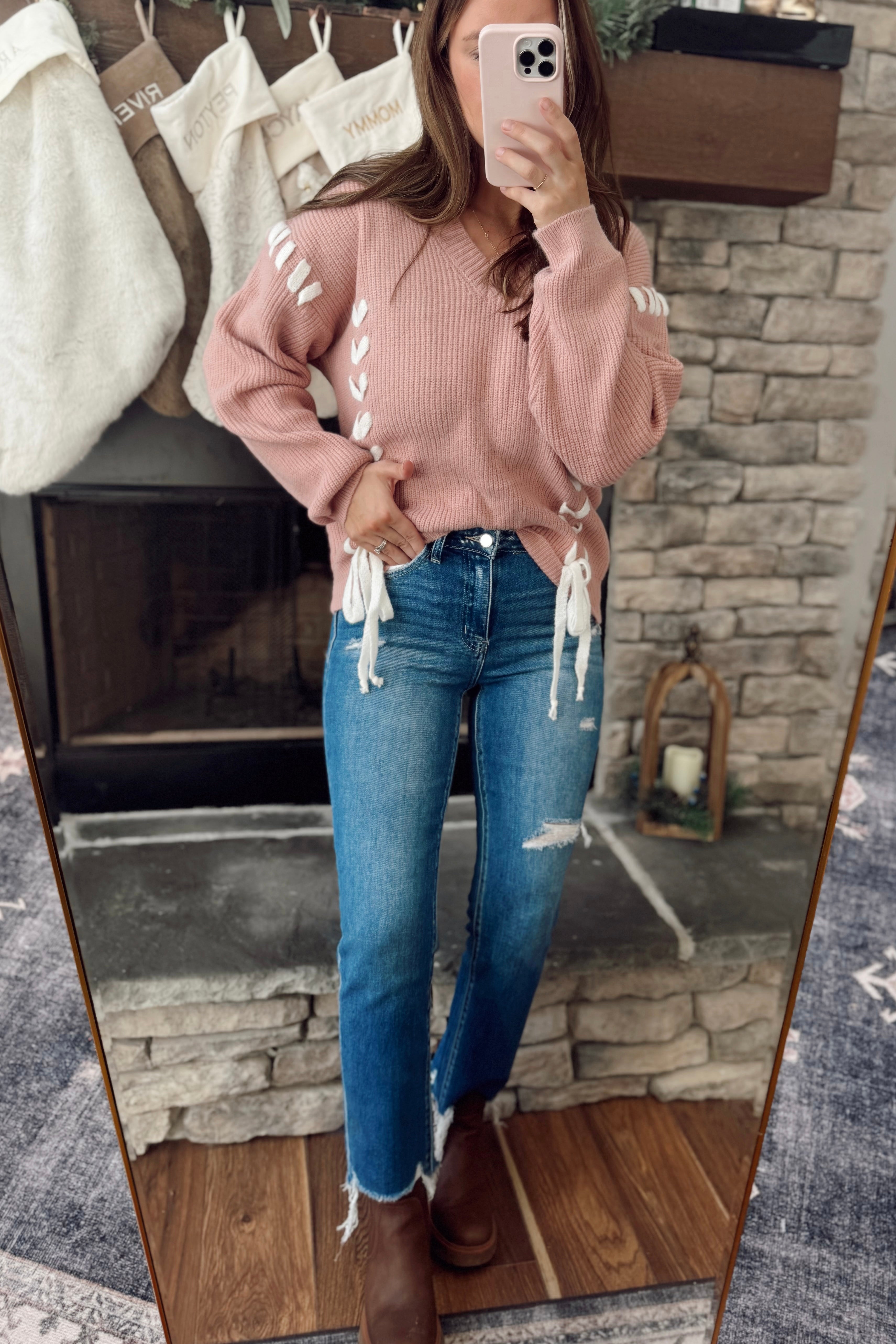 Sweet Ease Dusty Pink V Neck Lace Up Knit Sweater