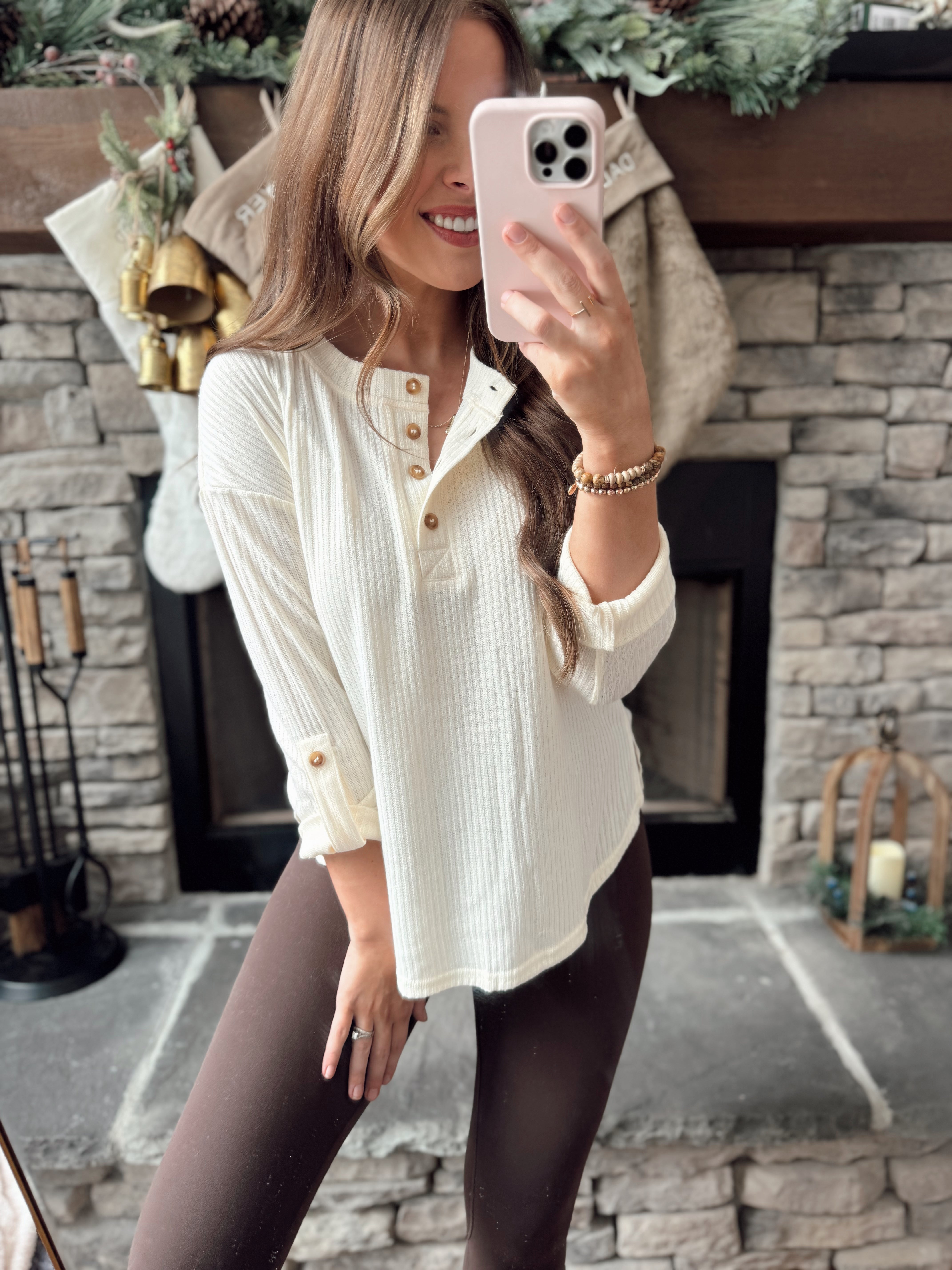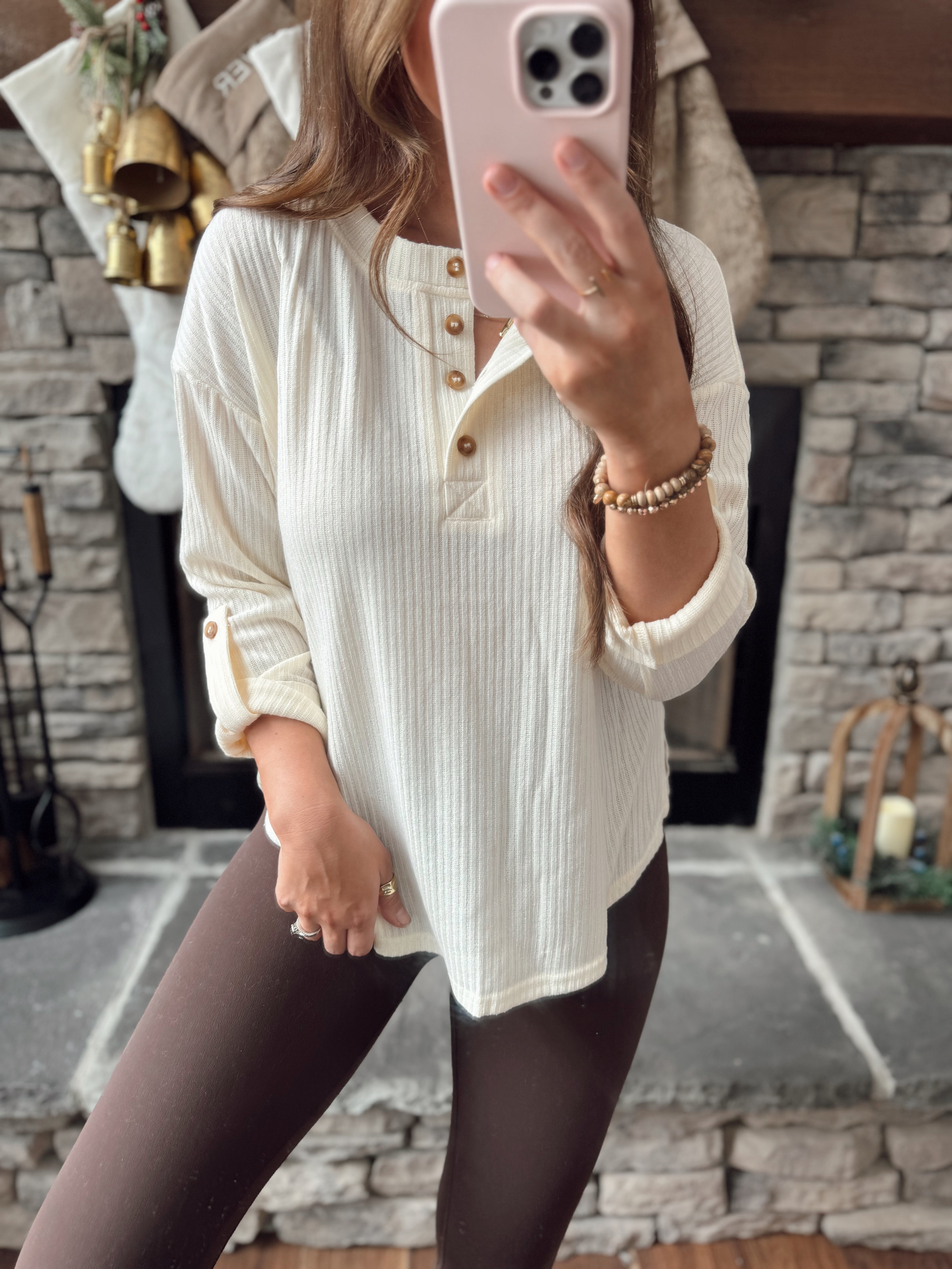 Tammy Cream 3/4 Tab Sleeve Henley Knit Top