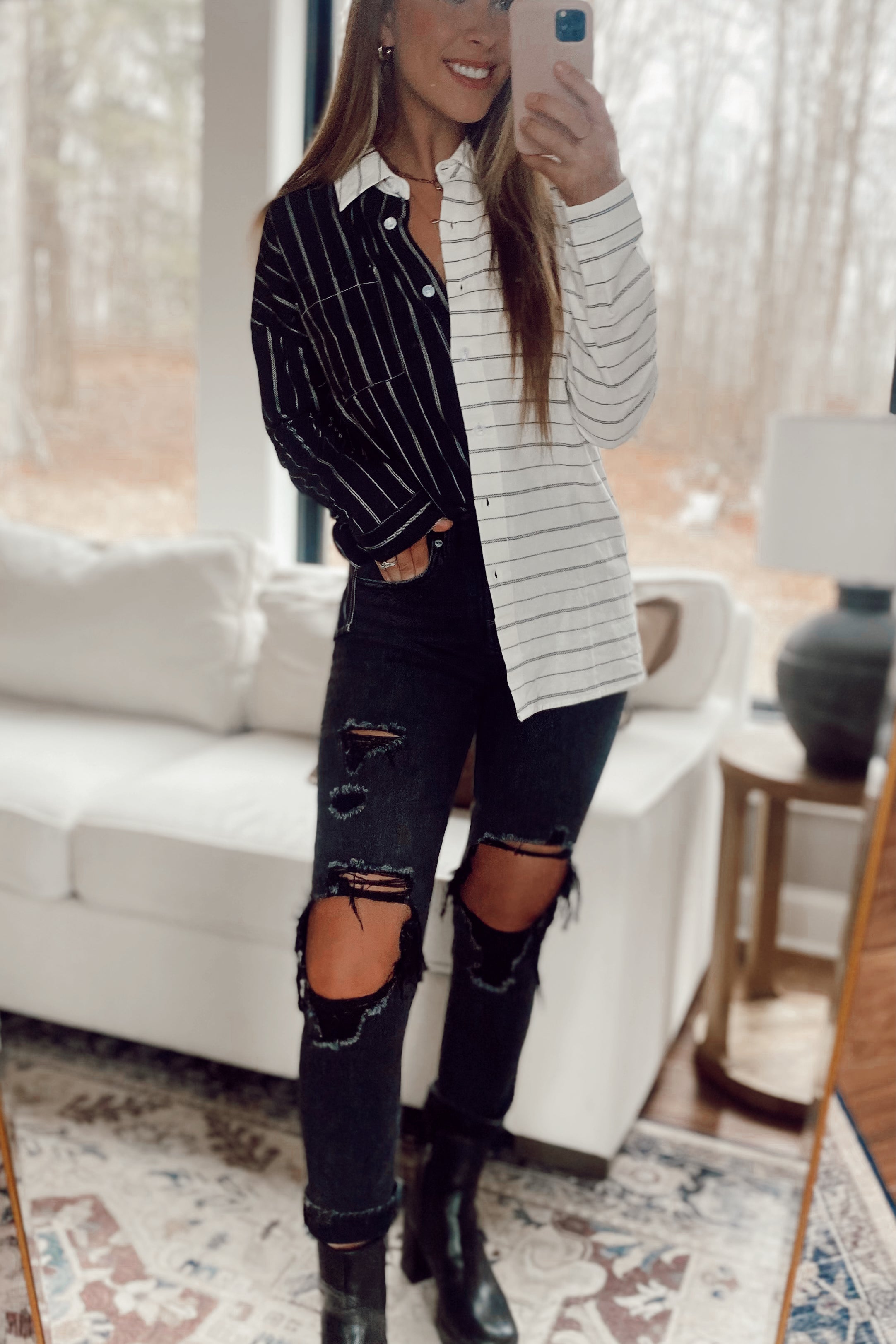Switching Sides White/ Black Stripe Colorblock Button-up