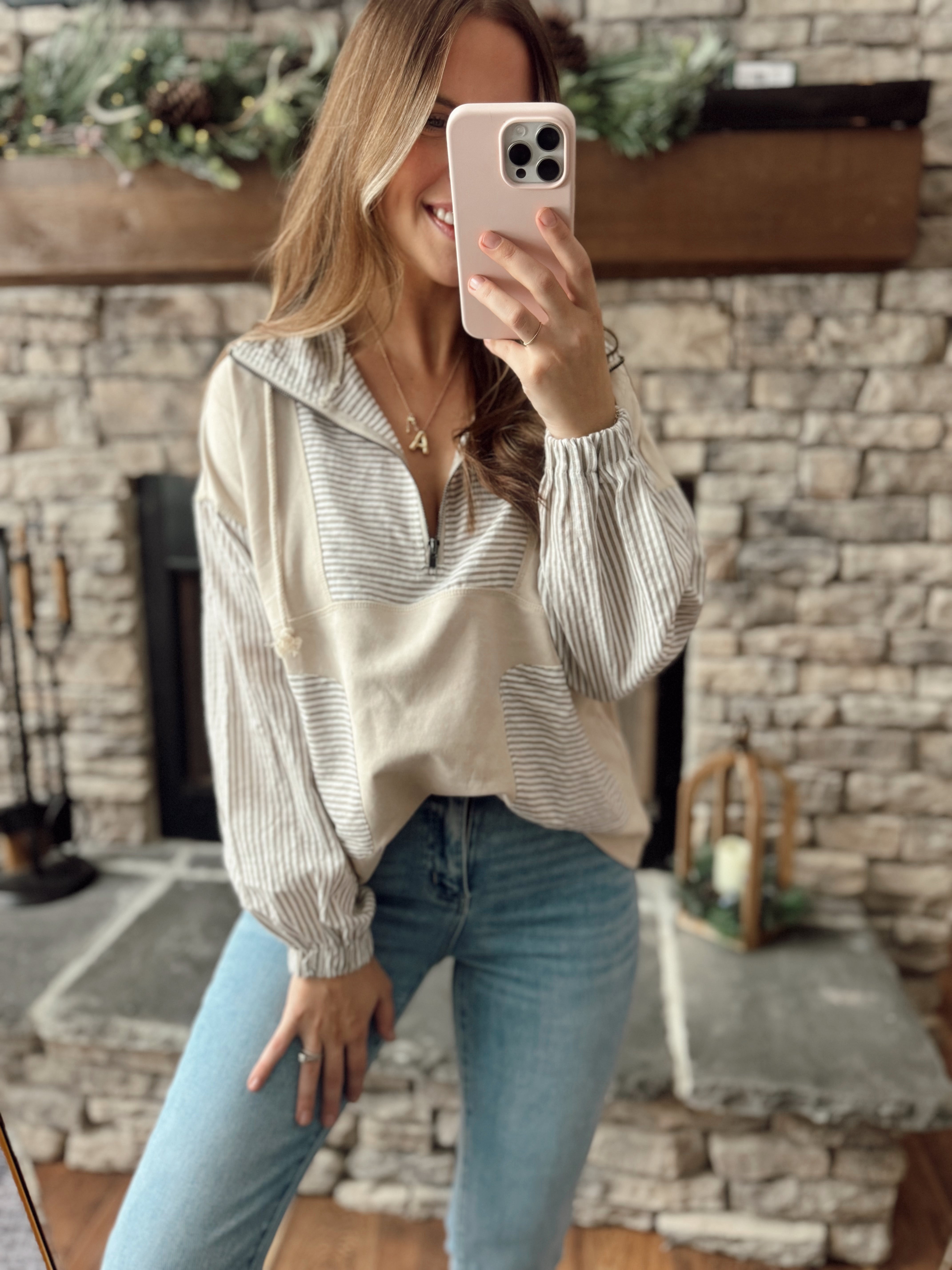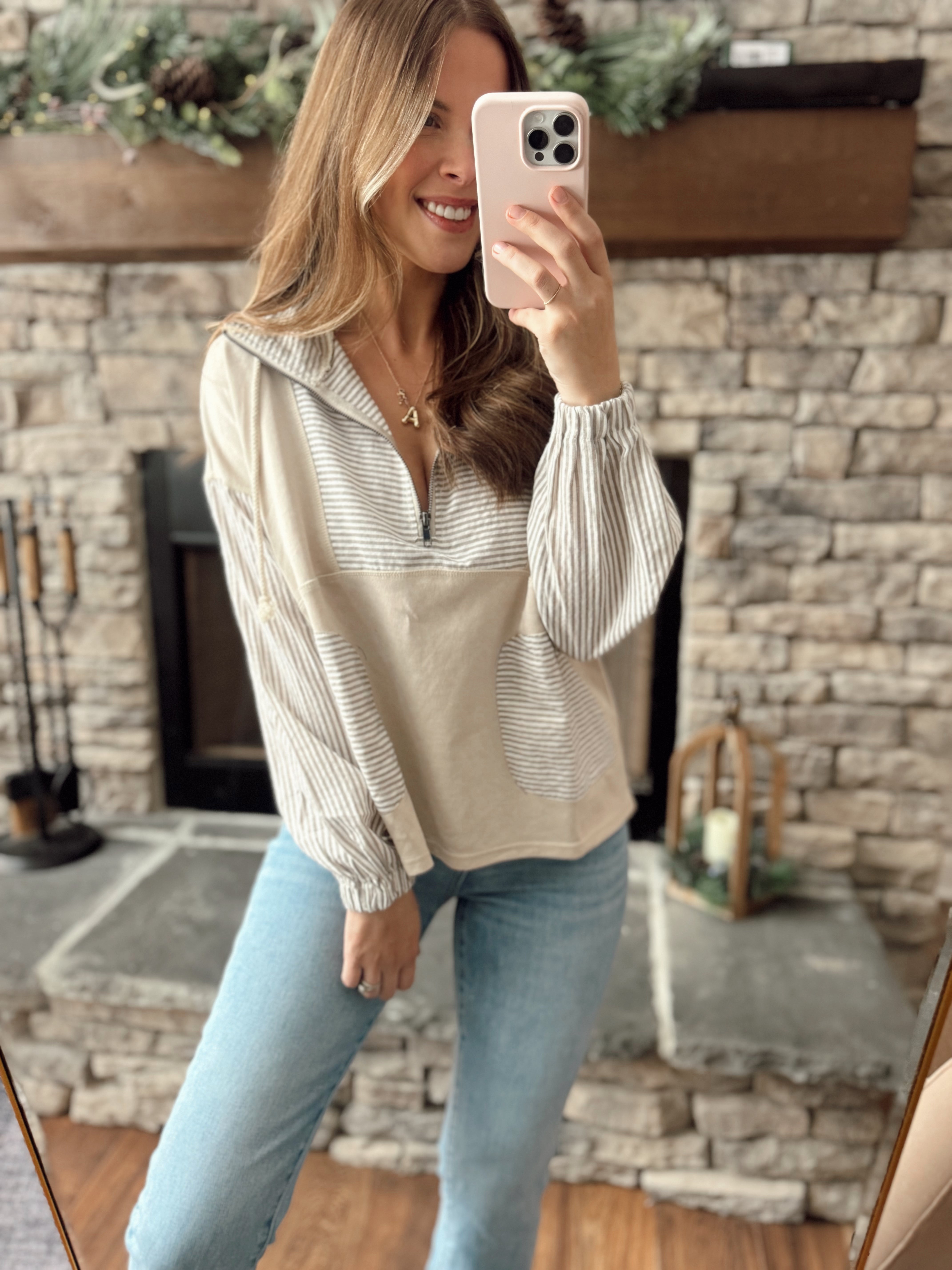 Taupe Coast Line Stripe Mix French Terry Half Zip