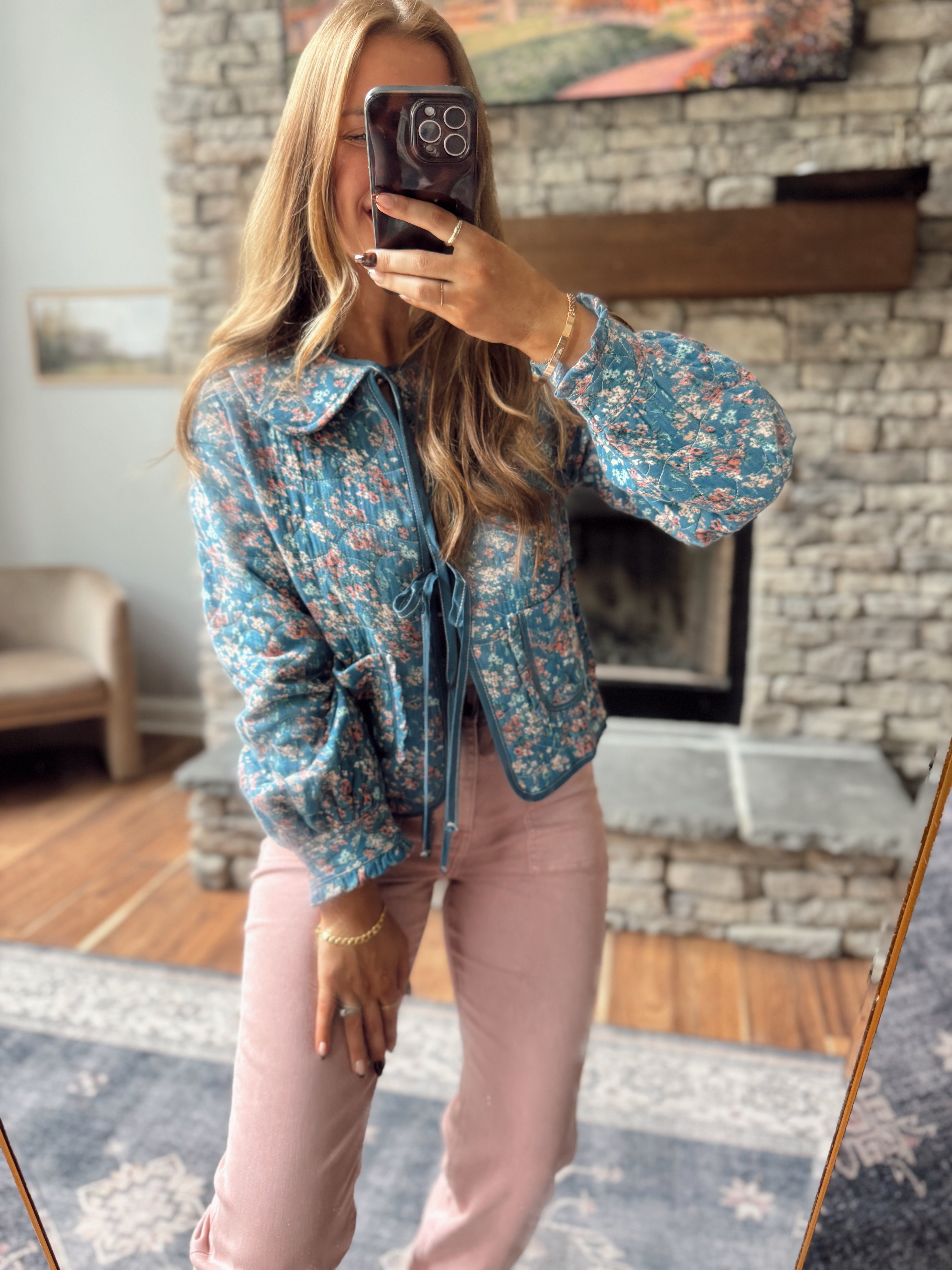 Teal Grannies Love Floral Heart Stitching Quilted Tie Jacket