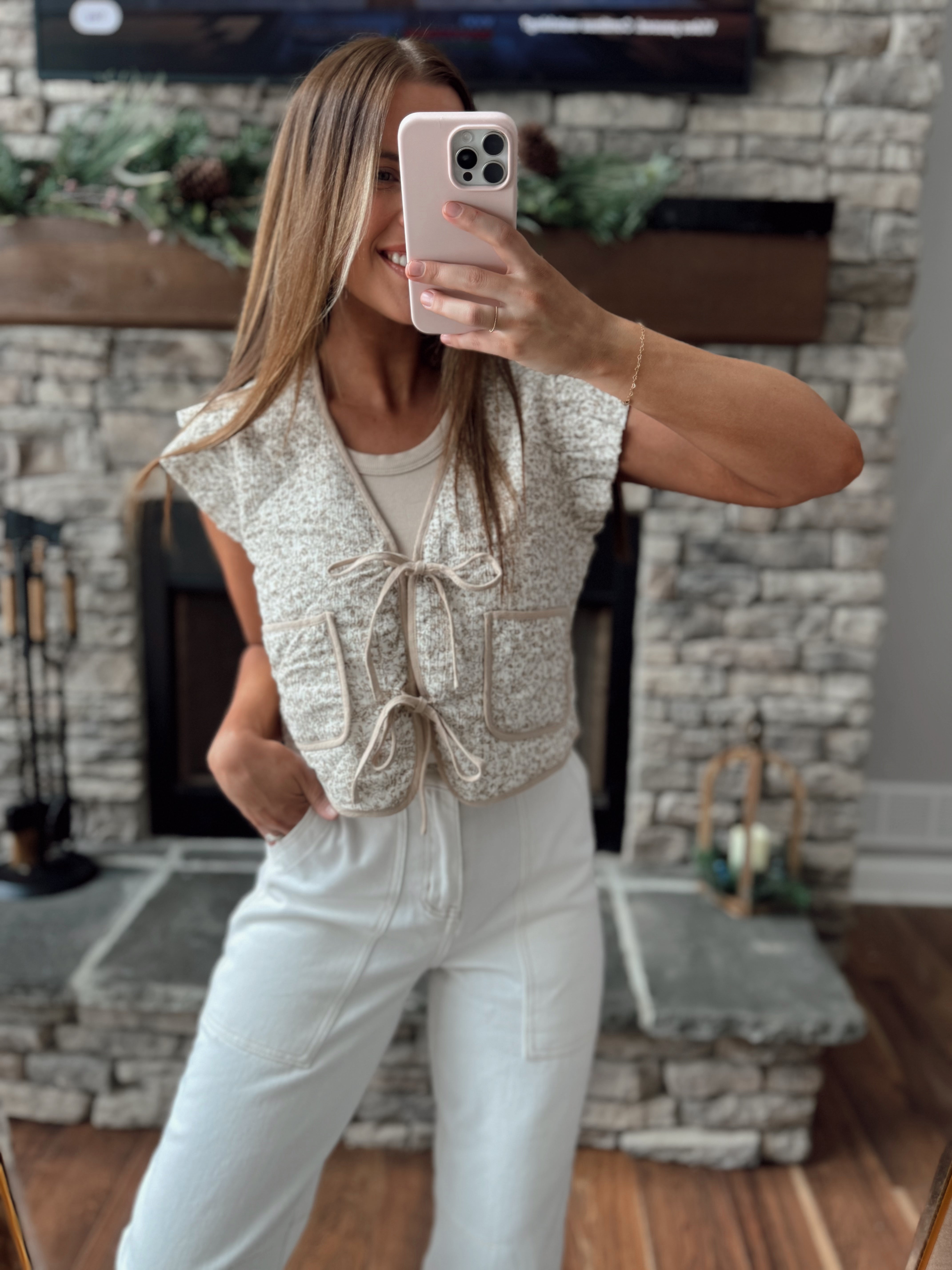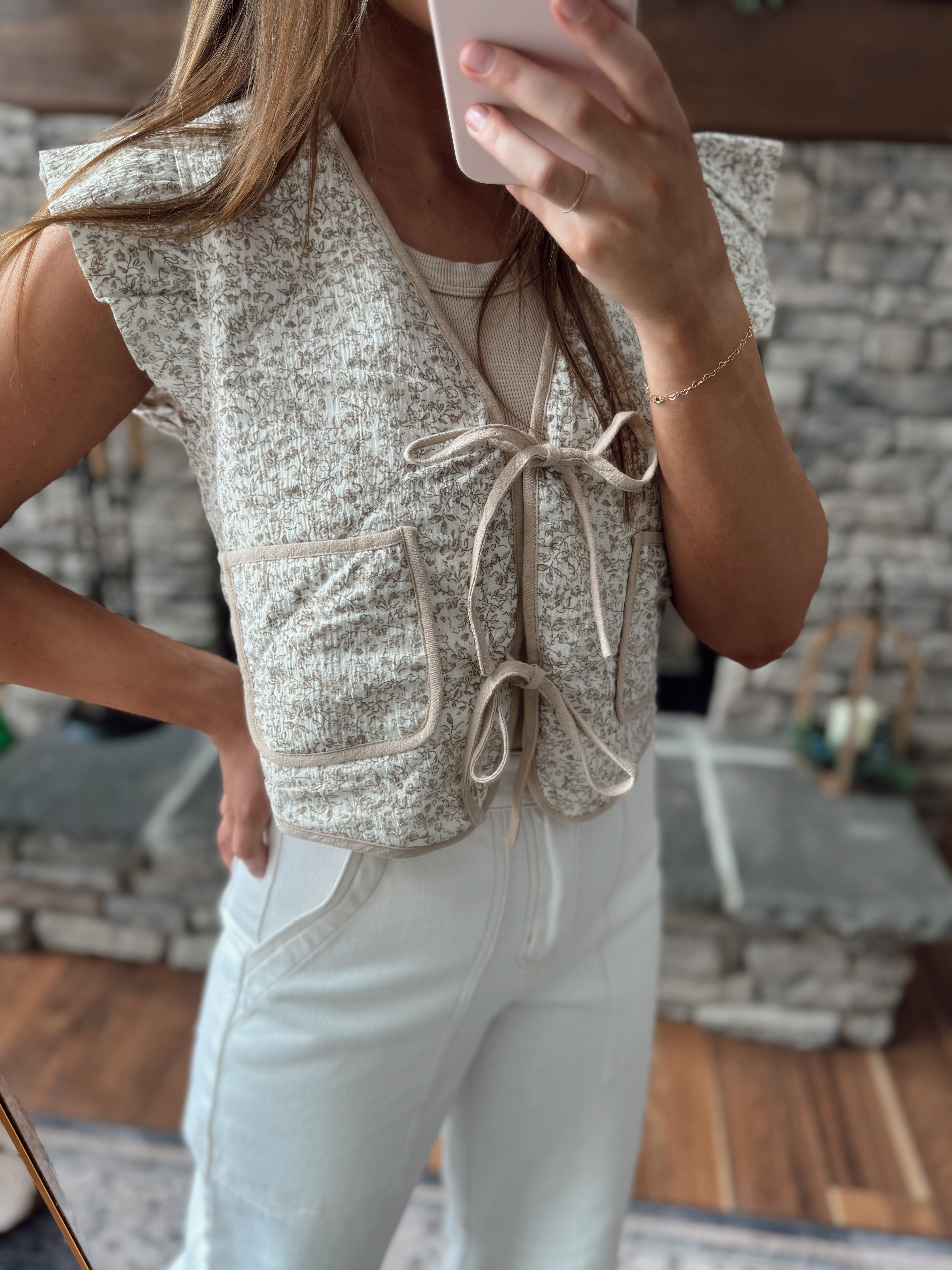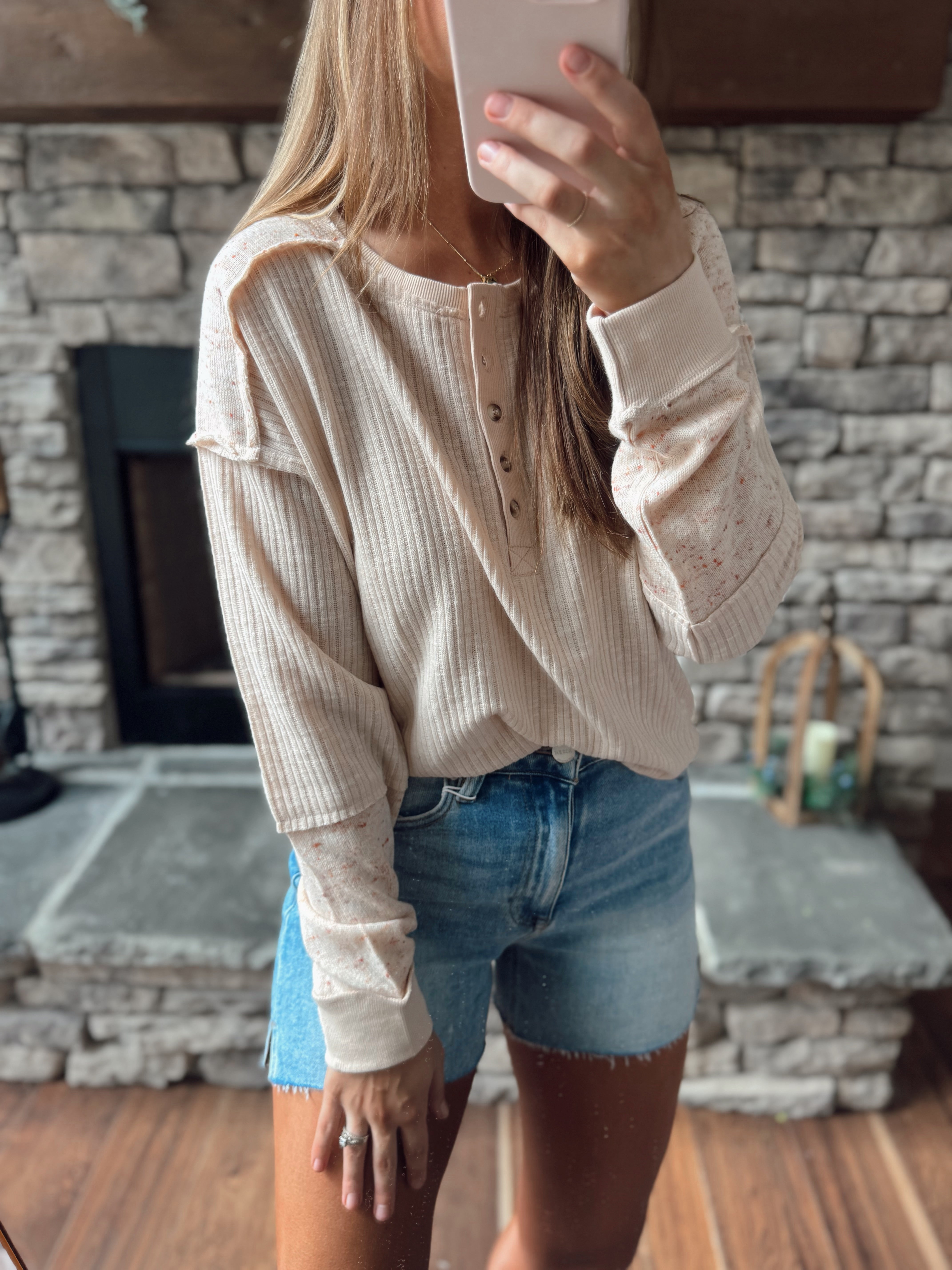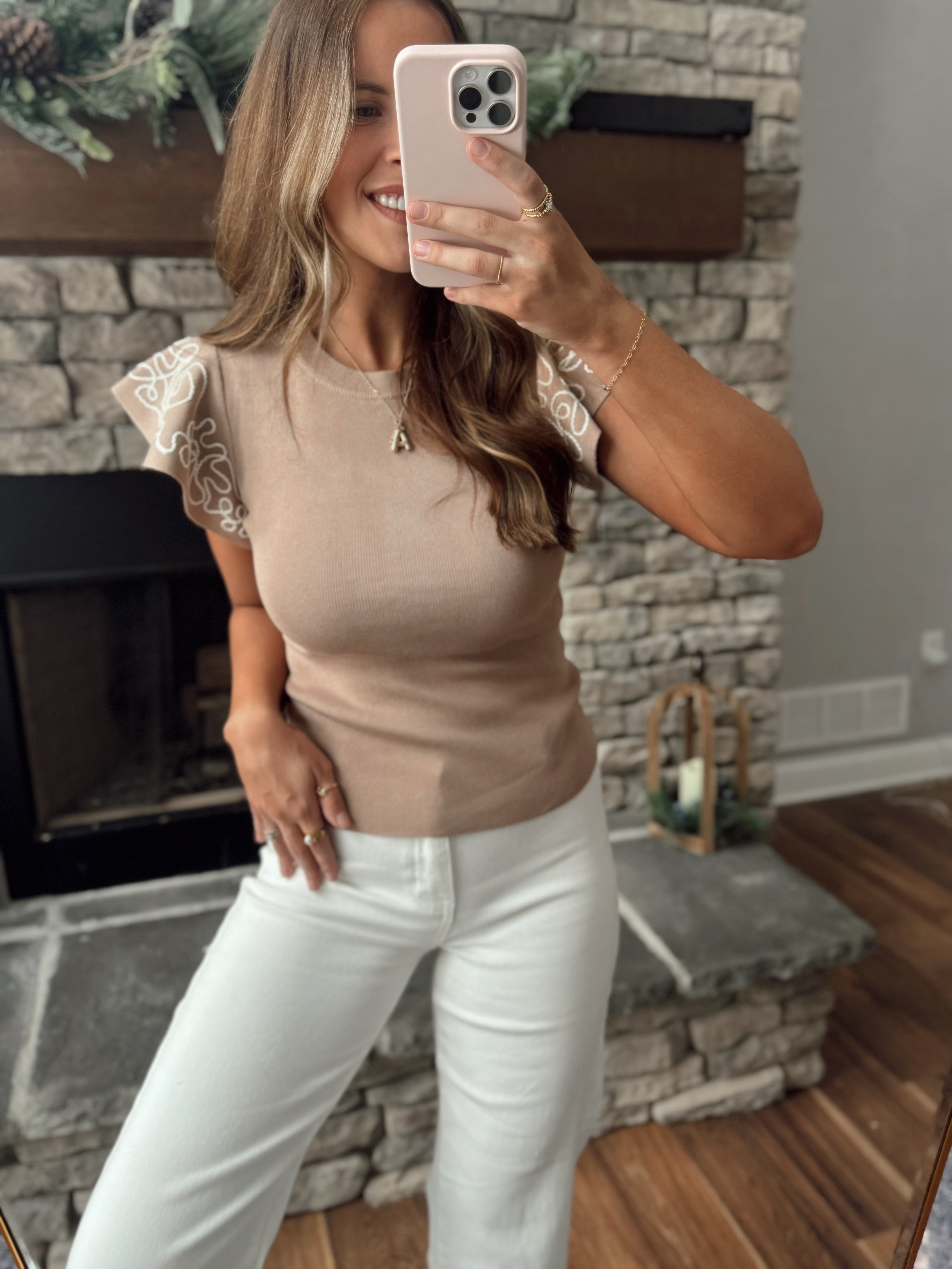 Truth Teller Taupe Embroidered Ruffle Short Sleeve Knit Top
