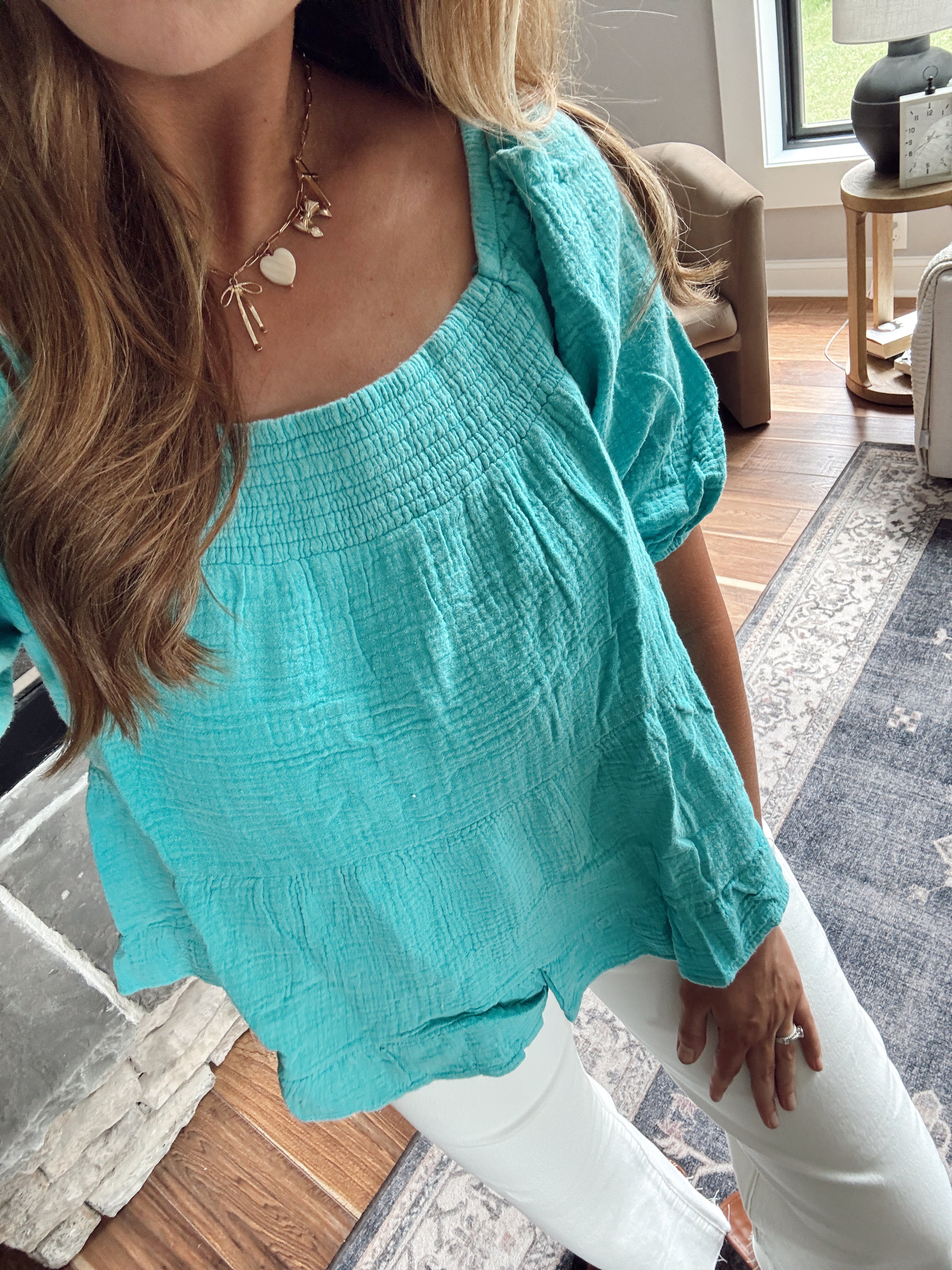 Washed Blue Smocked Puff Sleeve Gauze Top