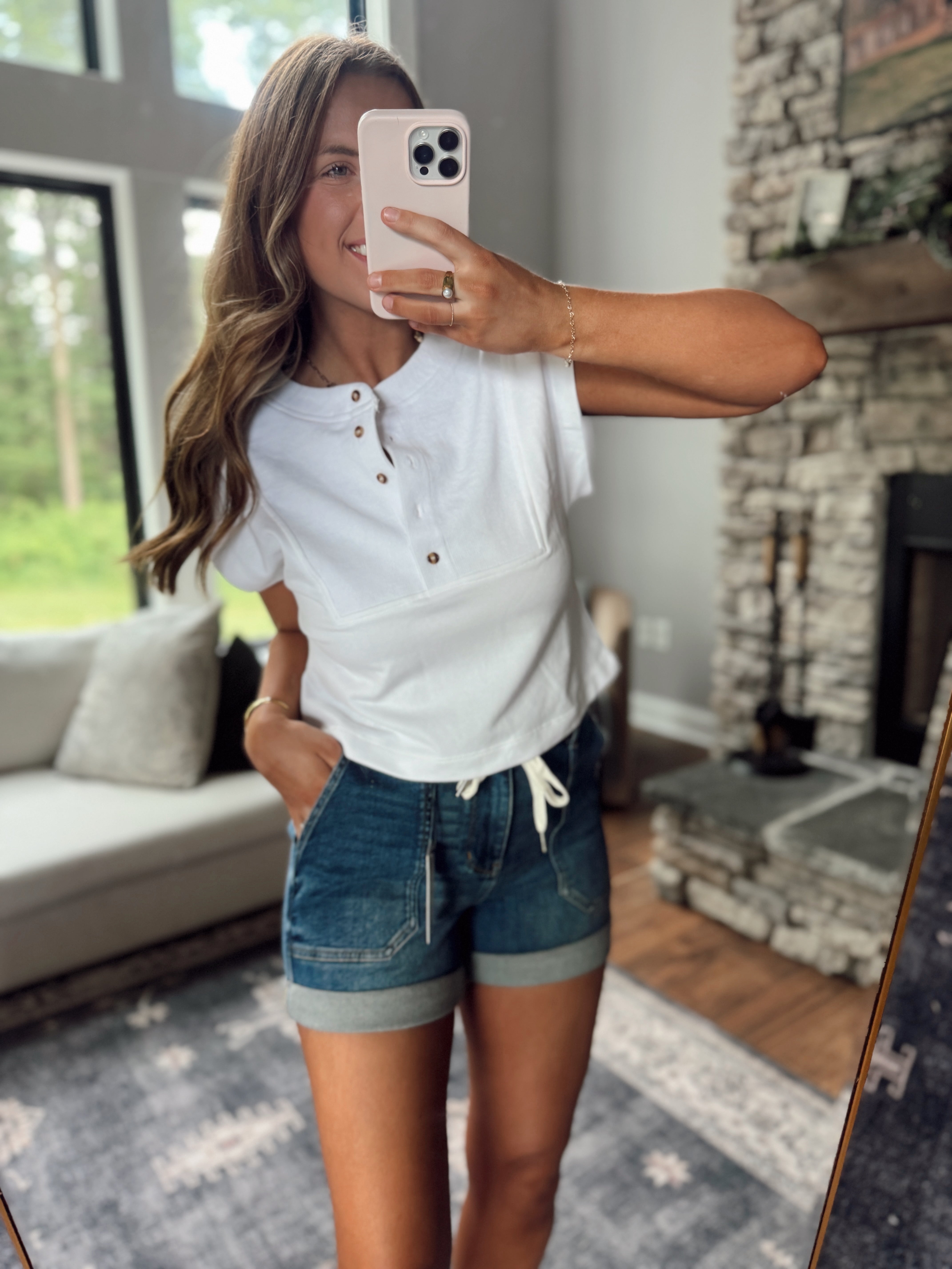 Wheat Waffle Short Sleeve Drawstring Hem Top