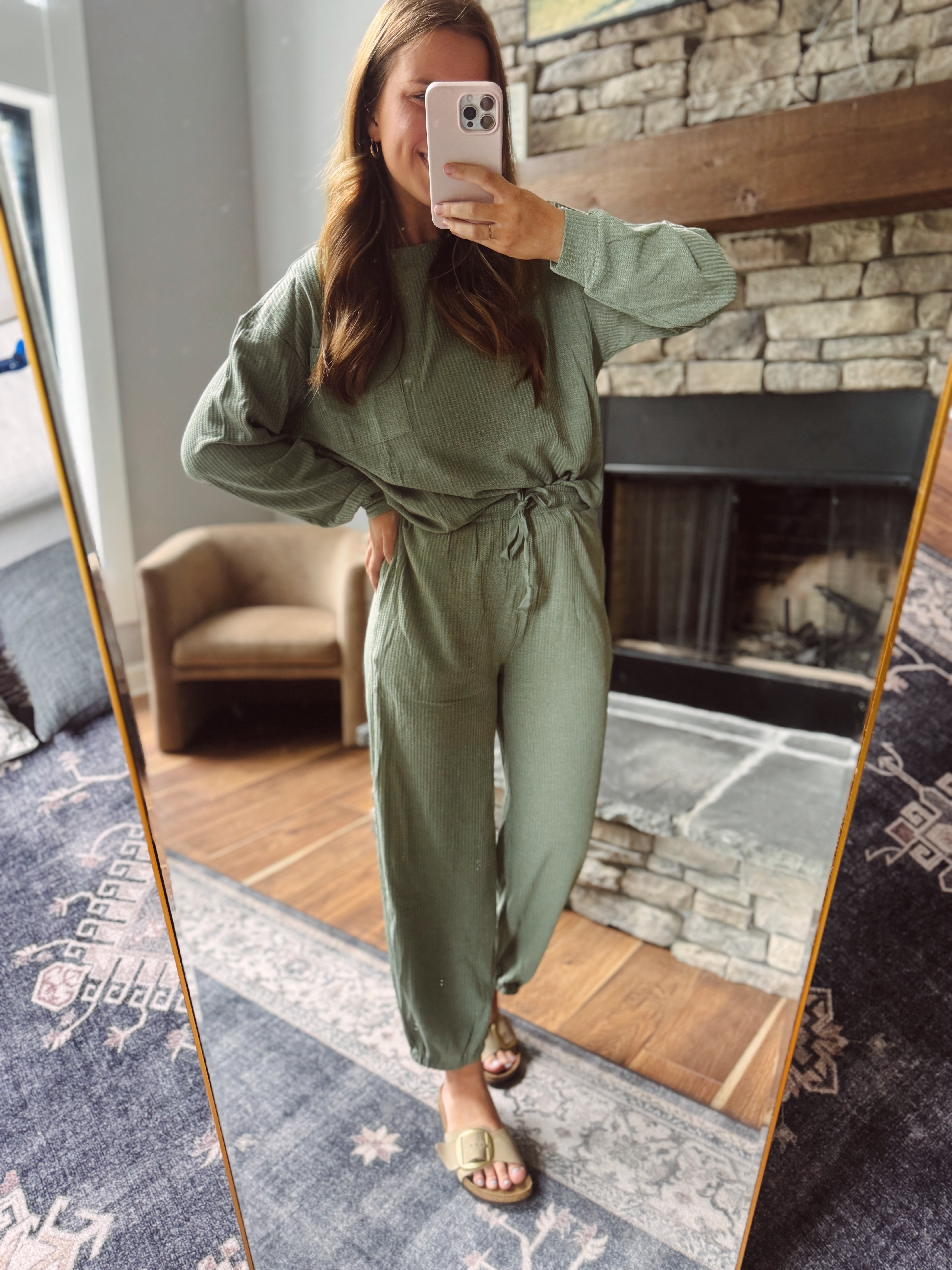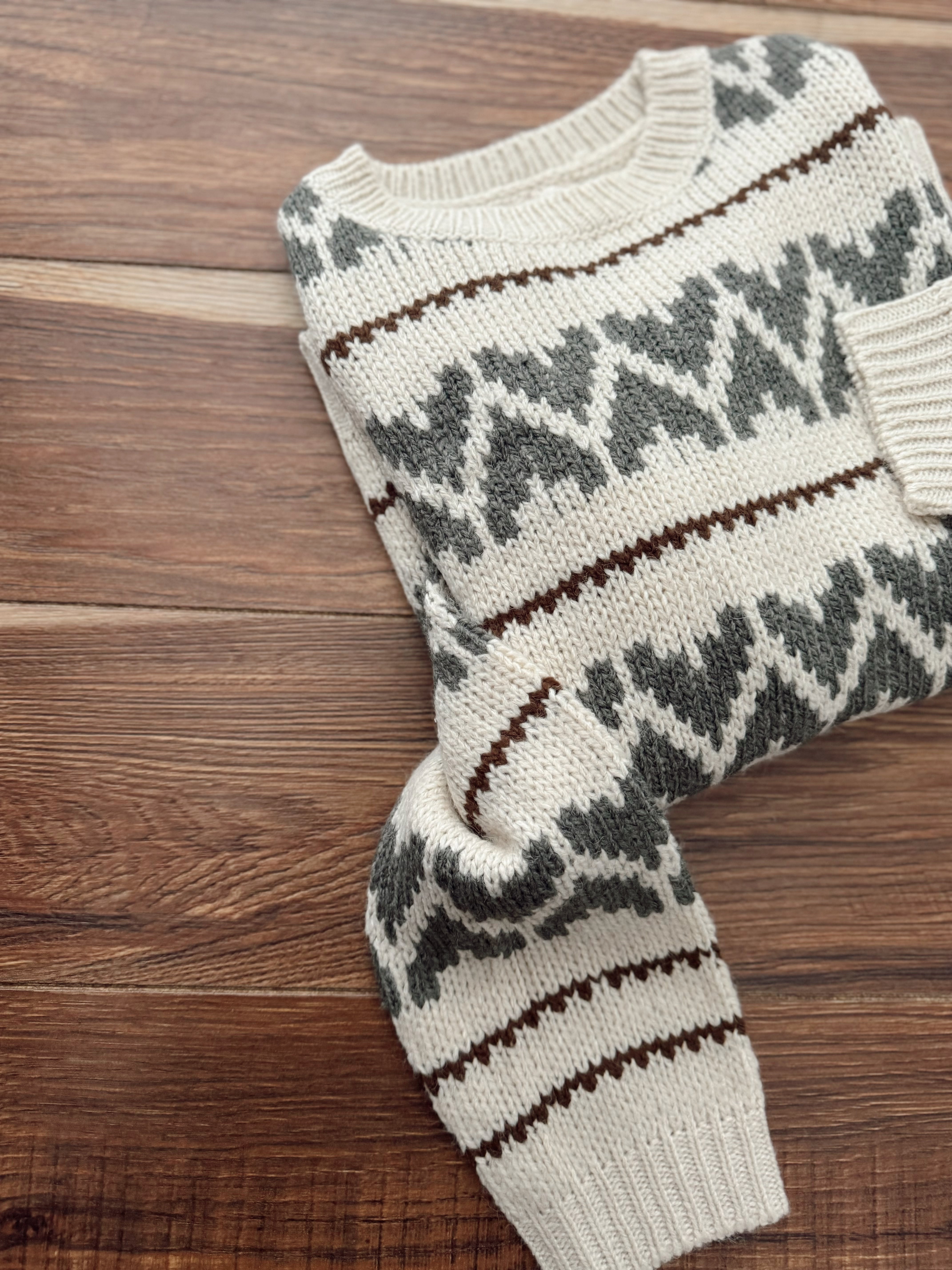 Well Wishes Taupe/Sage Crew Heart Stitch Knit Sweater