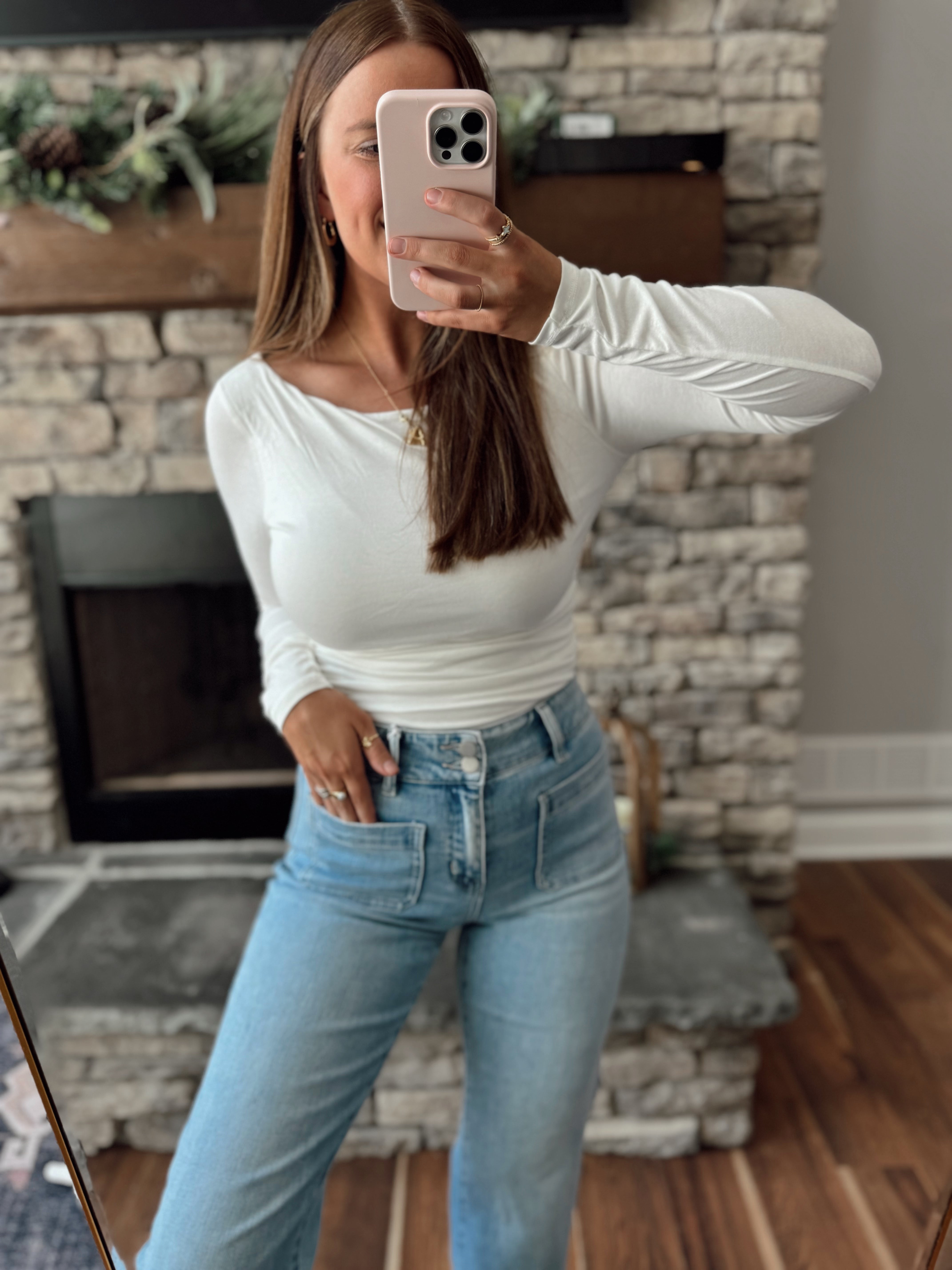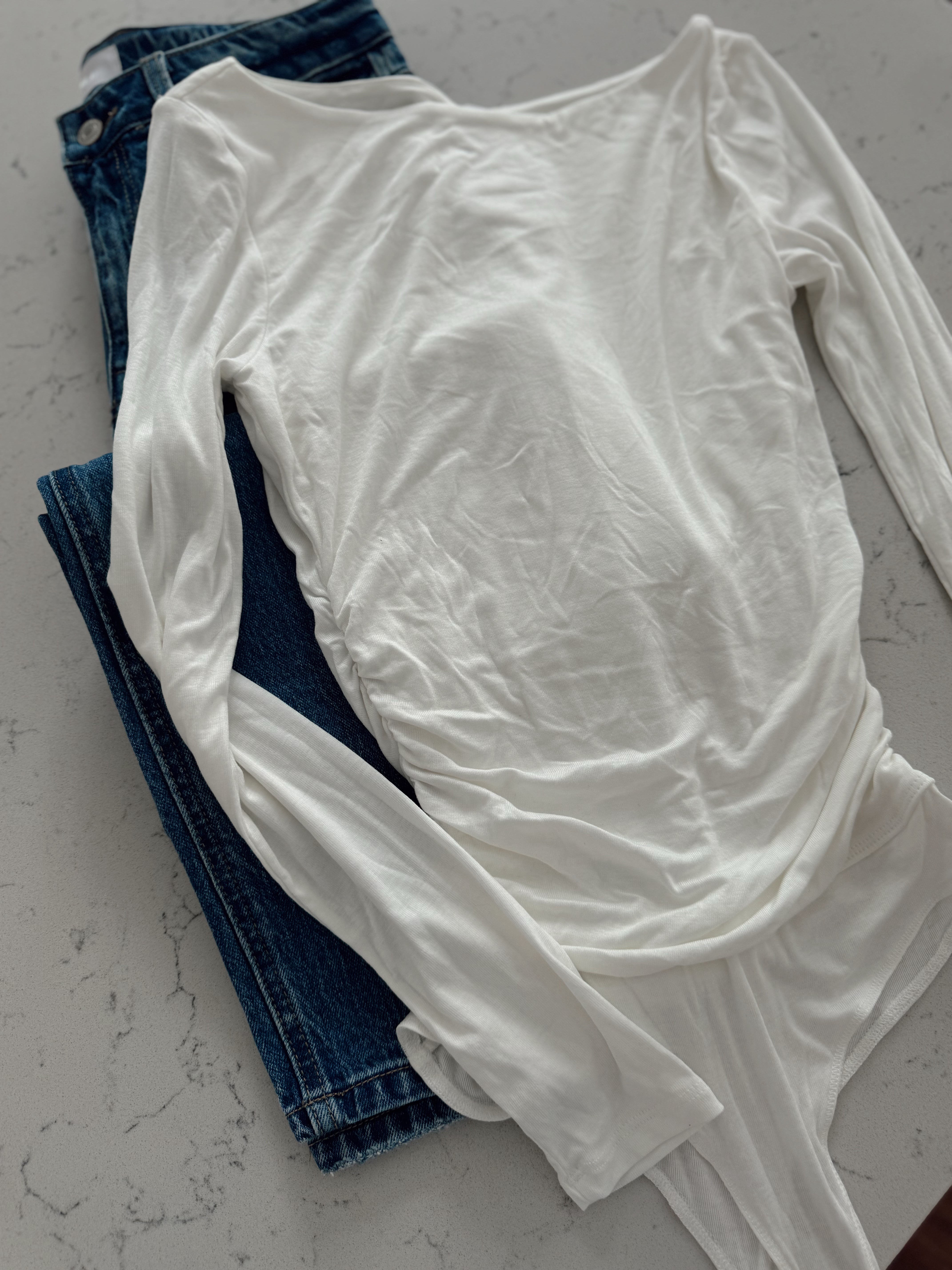 White Soleil Boat Neck Long Sleeve Bodysuit
