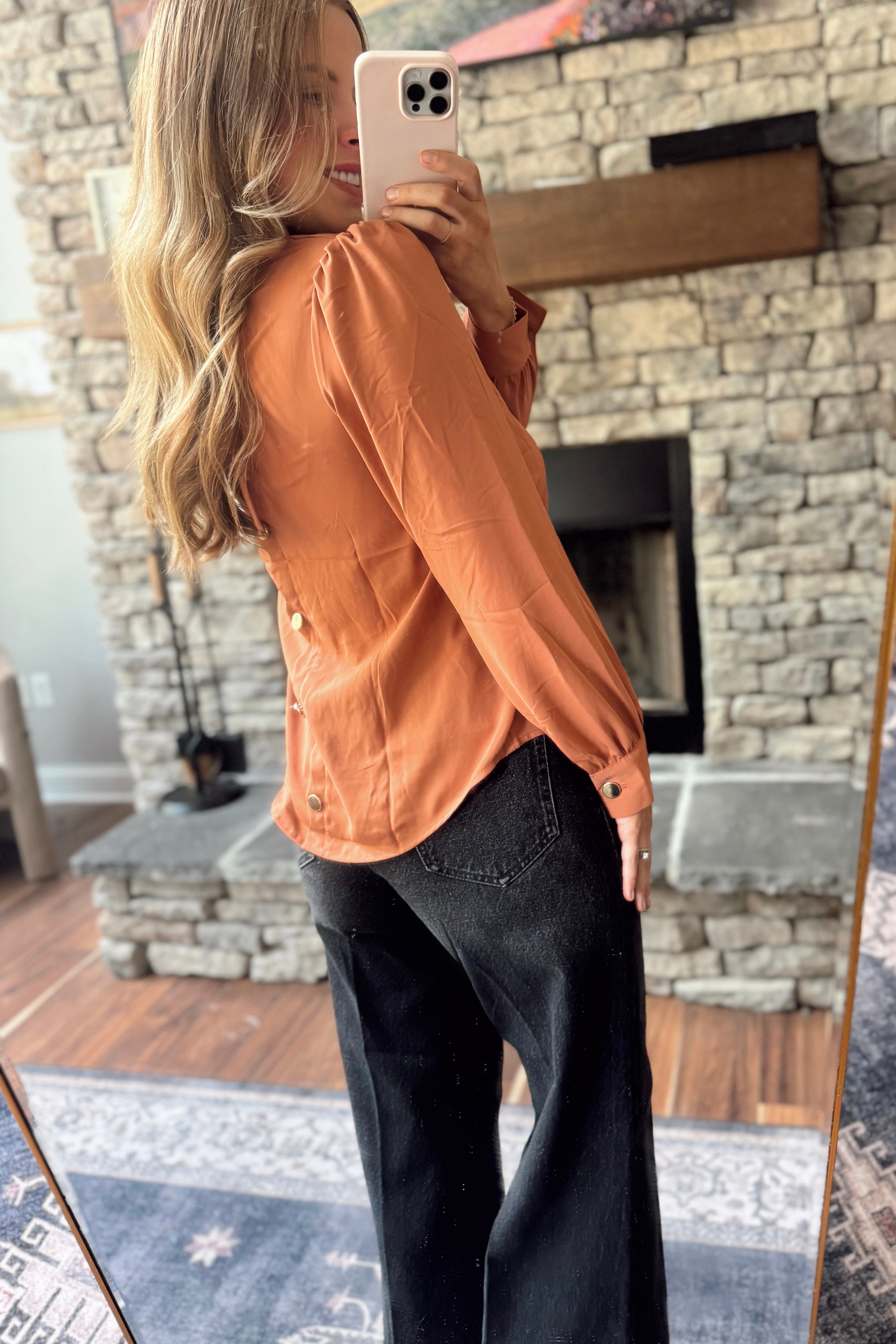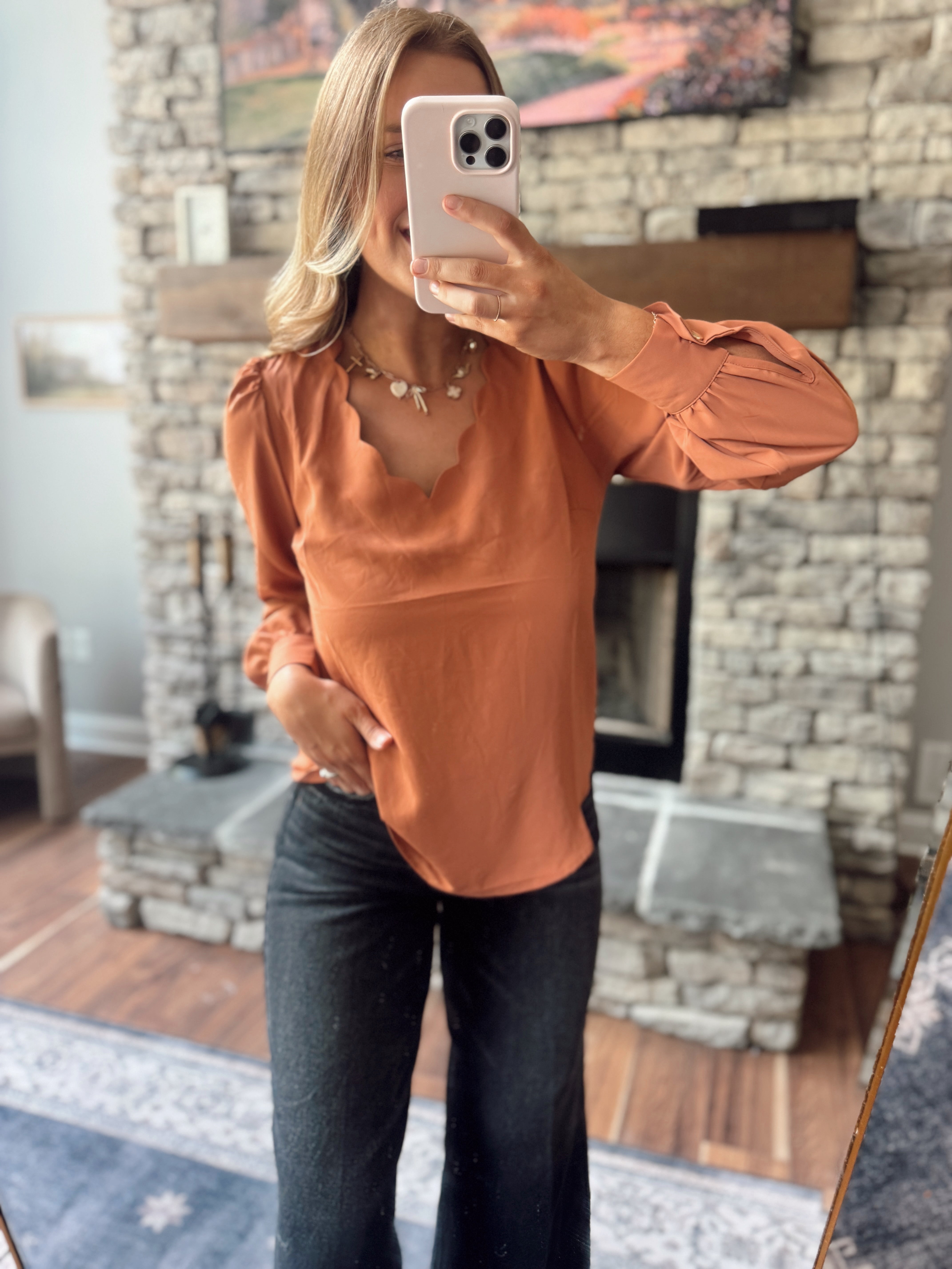 Boss Babe Terracotta Scallop Trim V-Neck Button Down Back Blouse