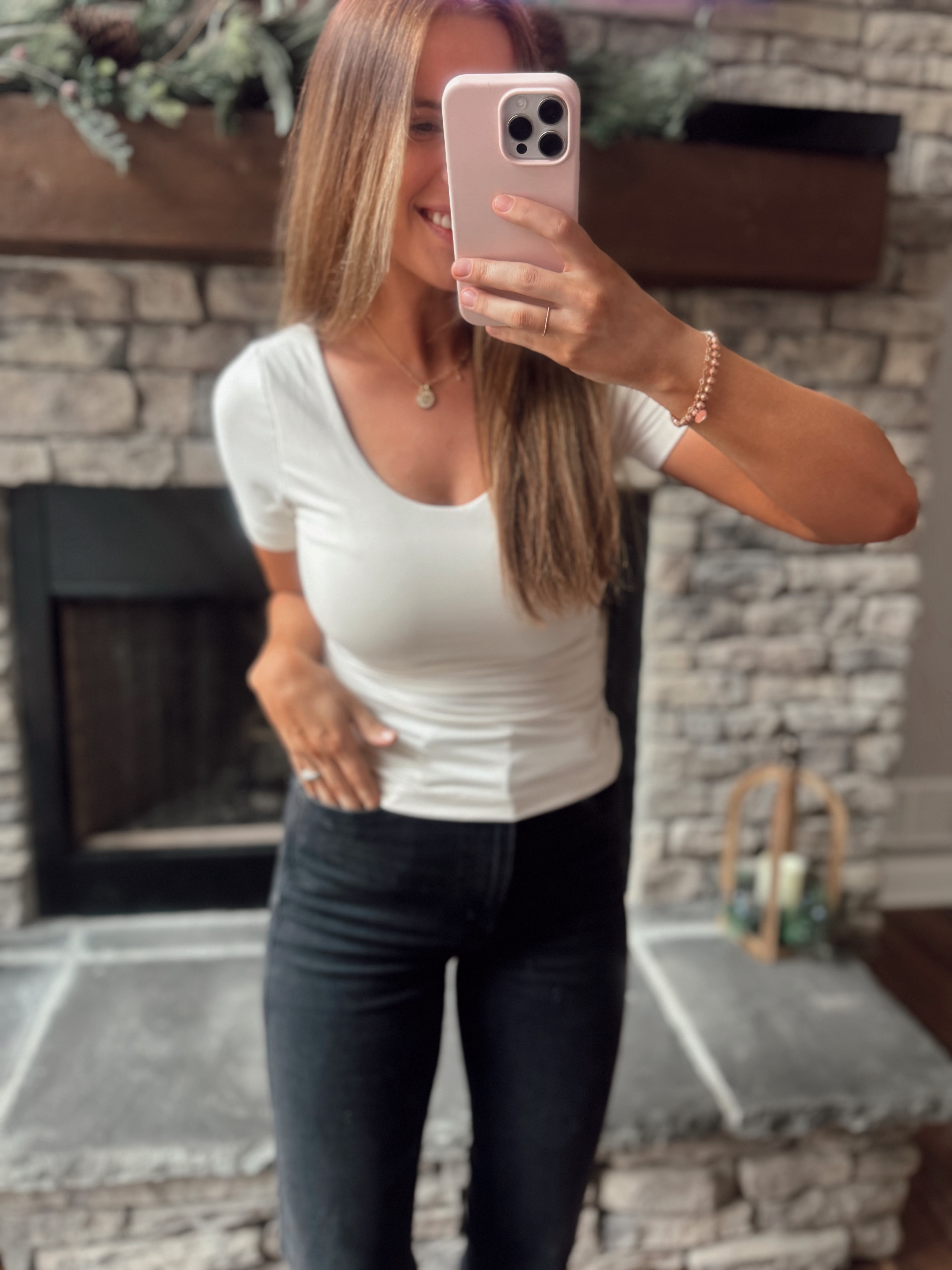 Chey White Pearl Buttery Soft Short Sleeve Top