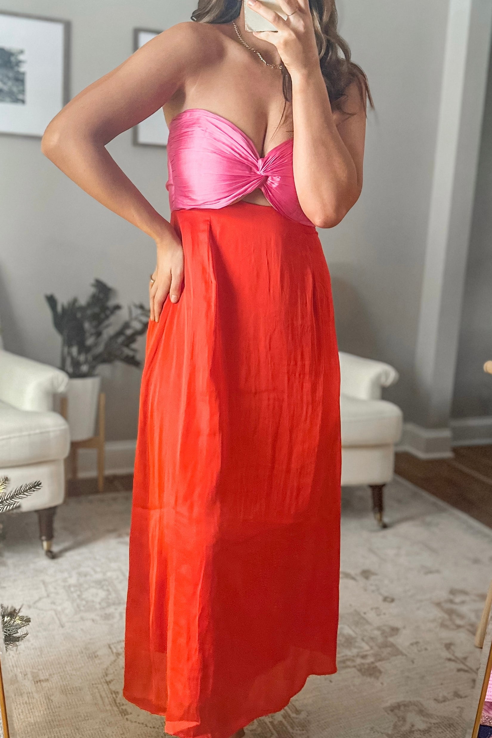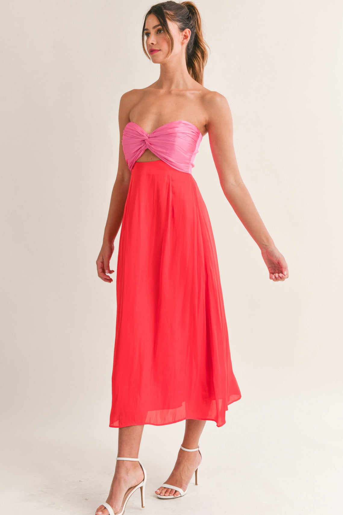 Chic Soiree Red/ Pink Twisted Strapless Midi