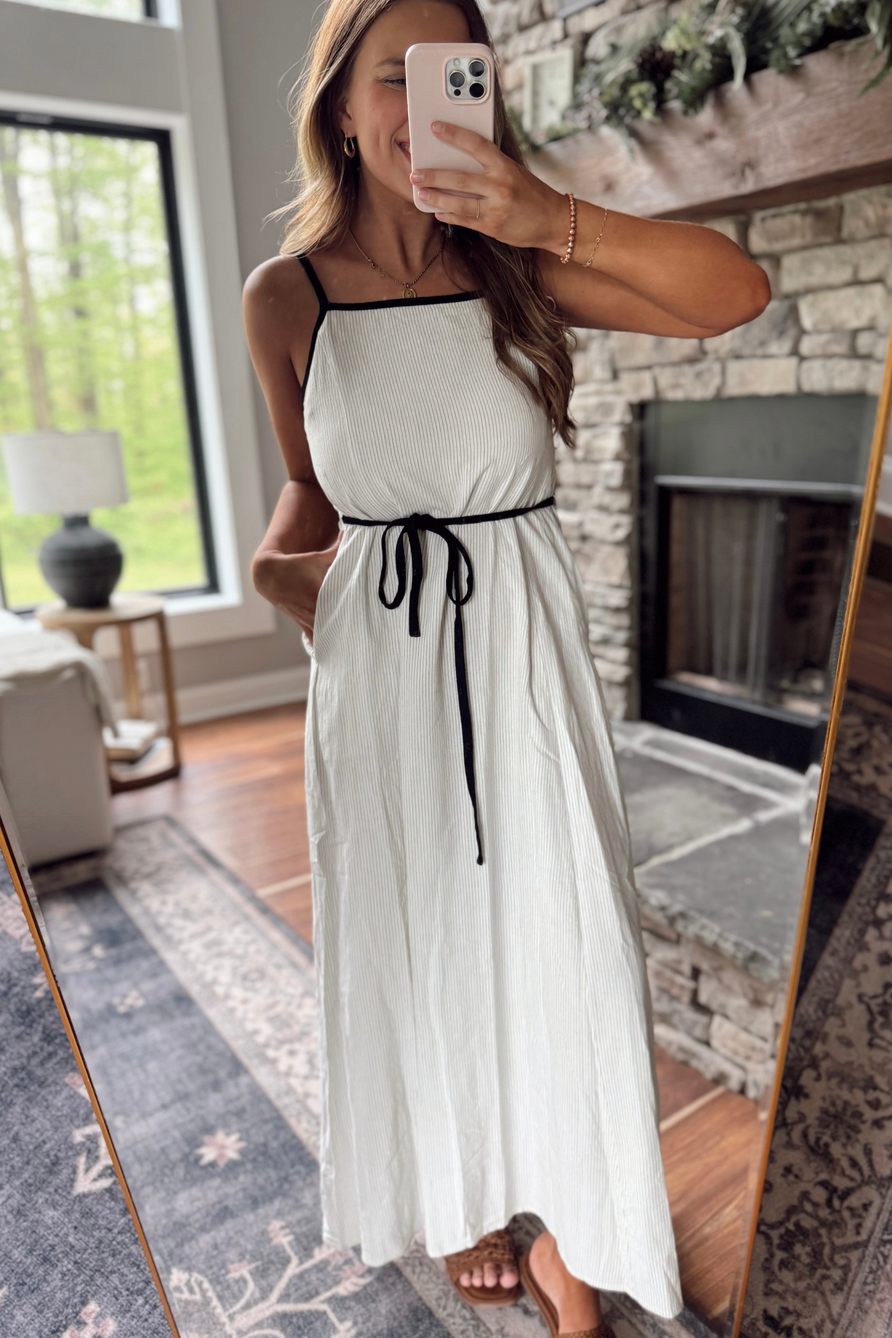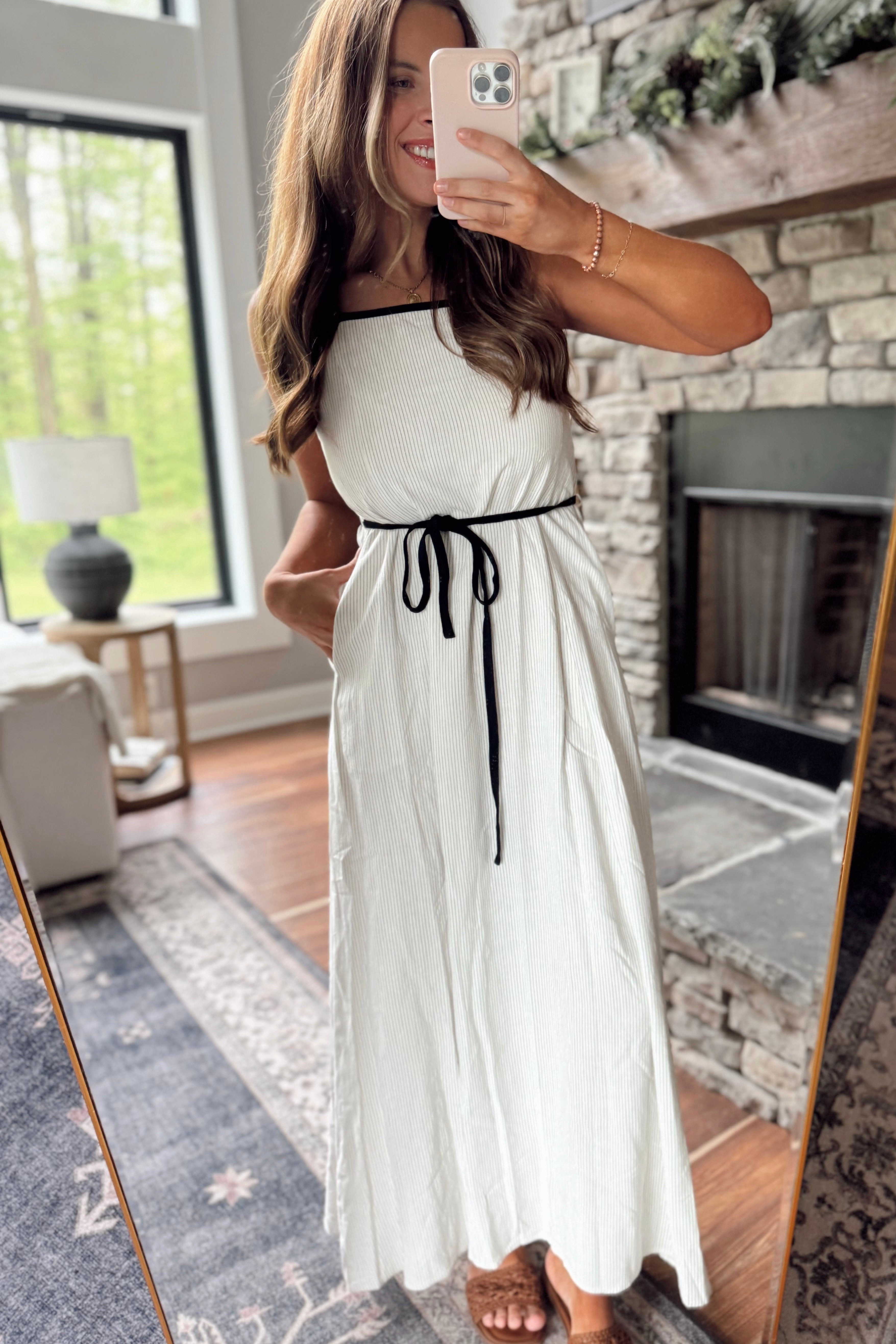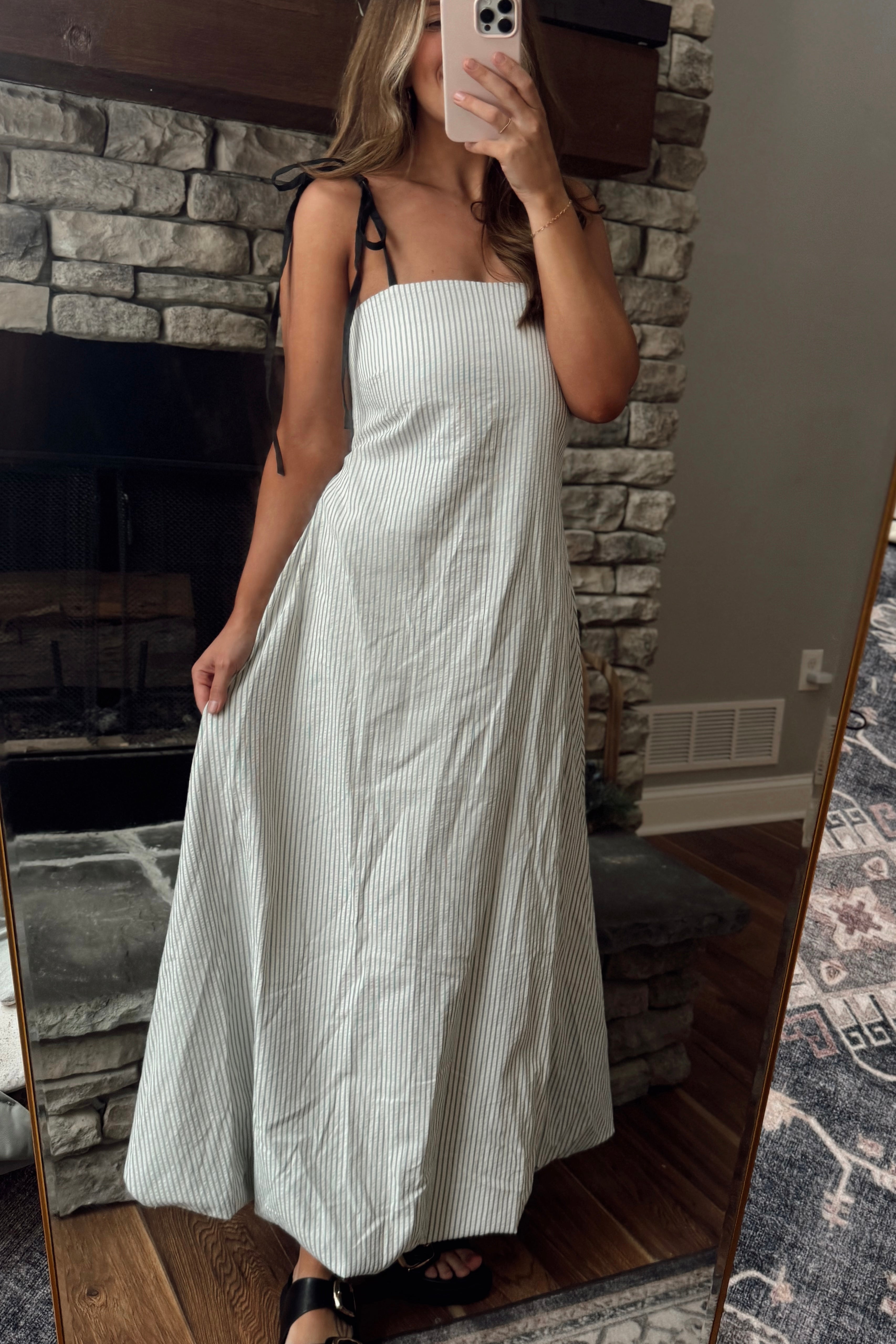 Coastal Breeze Ivory Textured Stripe Bubble Hem Tie Shoulder Midi