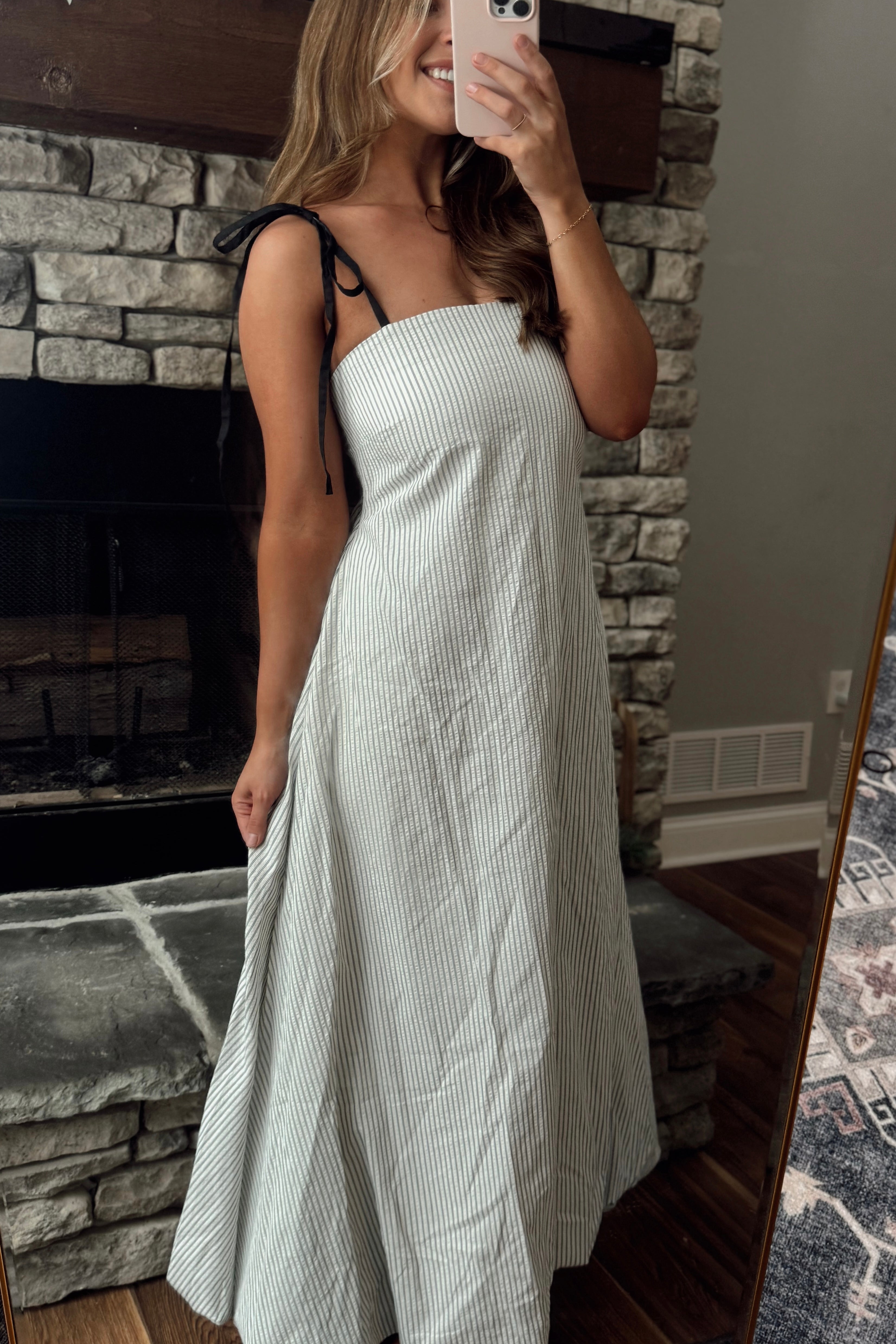 Coastal Breeze Blue Textured Stripe Bubble Hem Tie Shoulder Midi