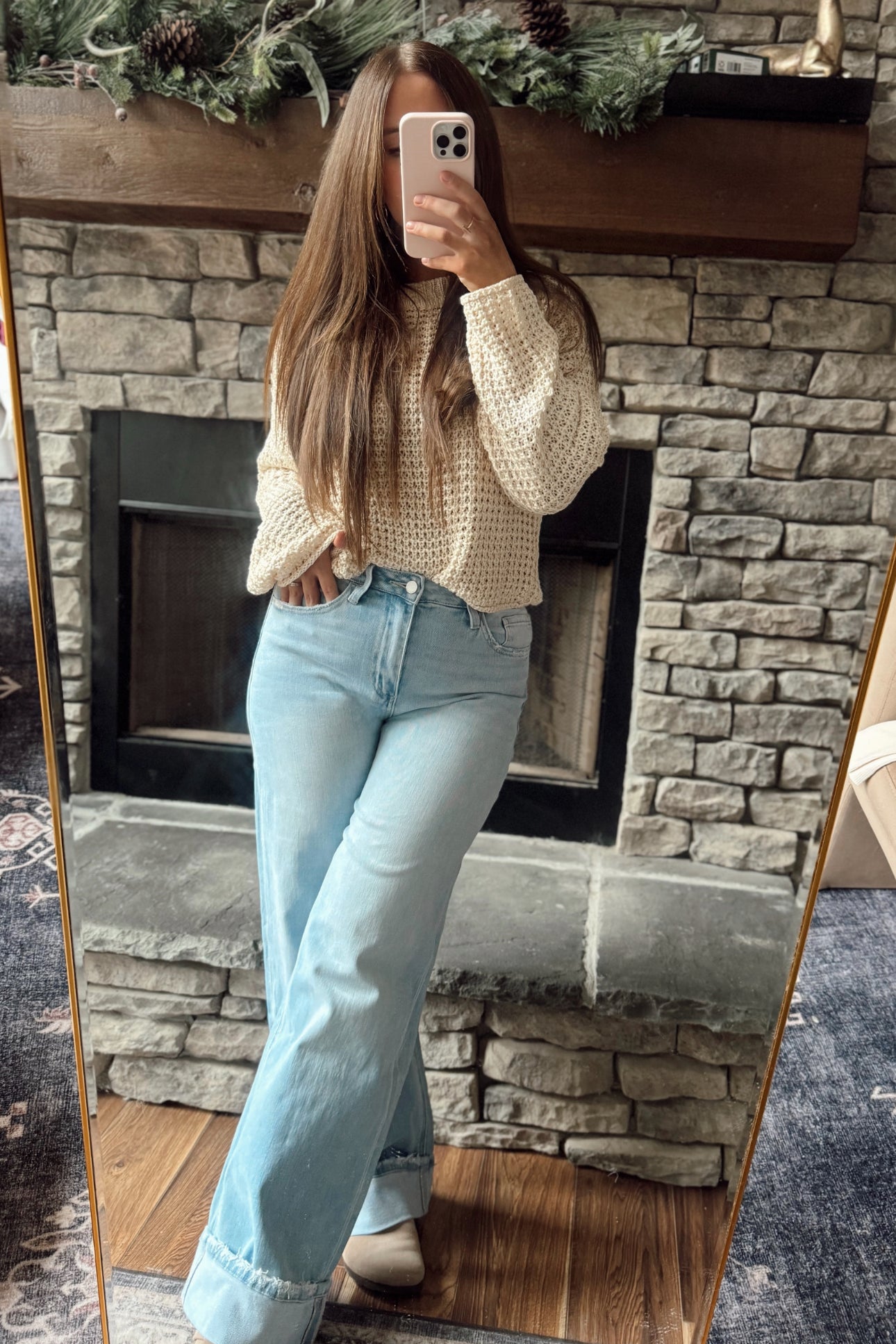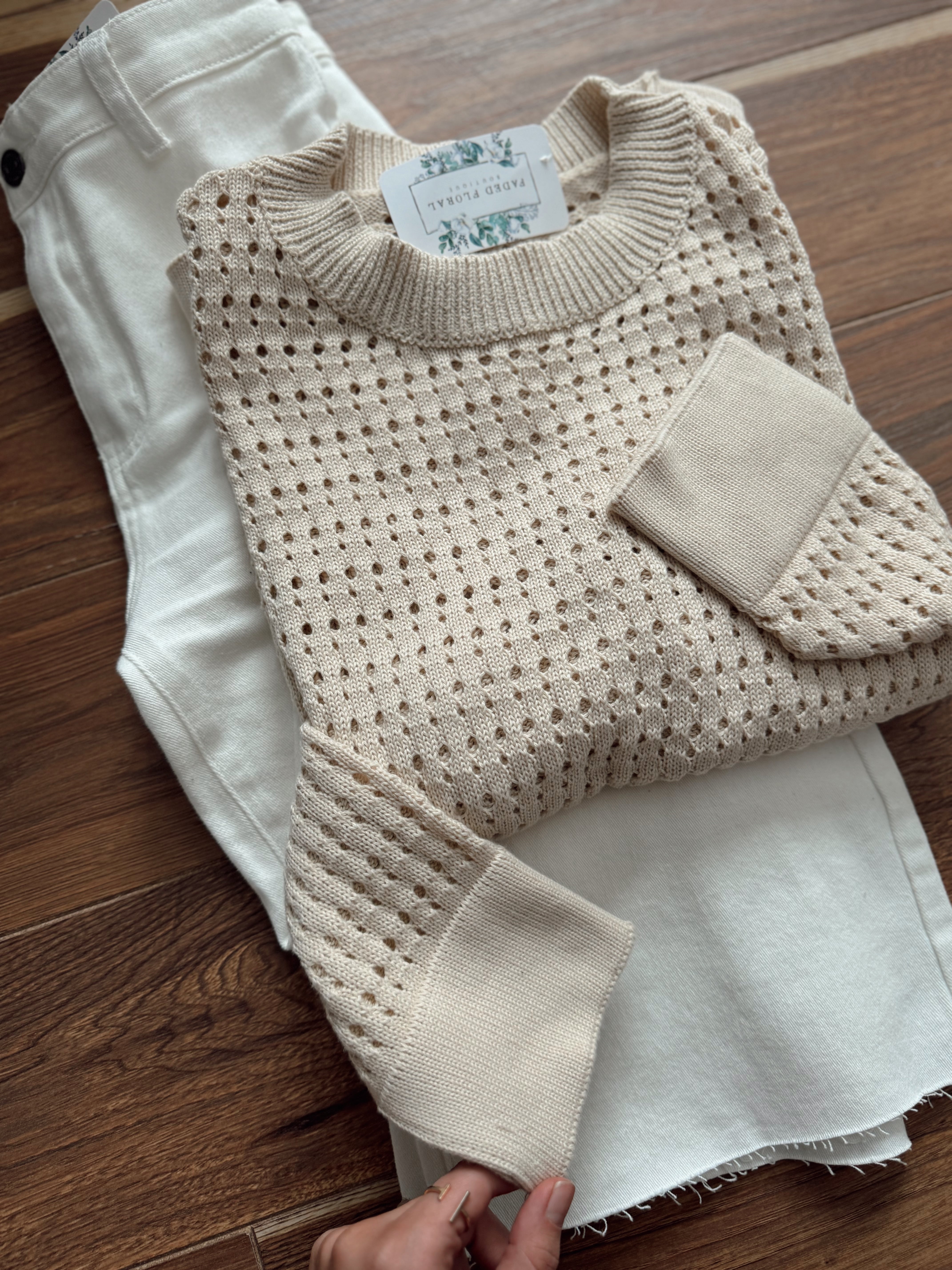 Follow My Lead Ecru Crew Crochet Knit Sweater