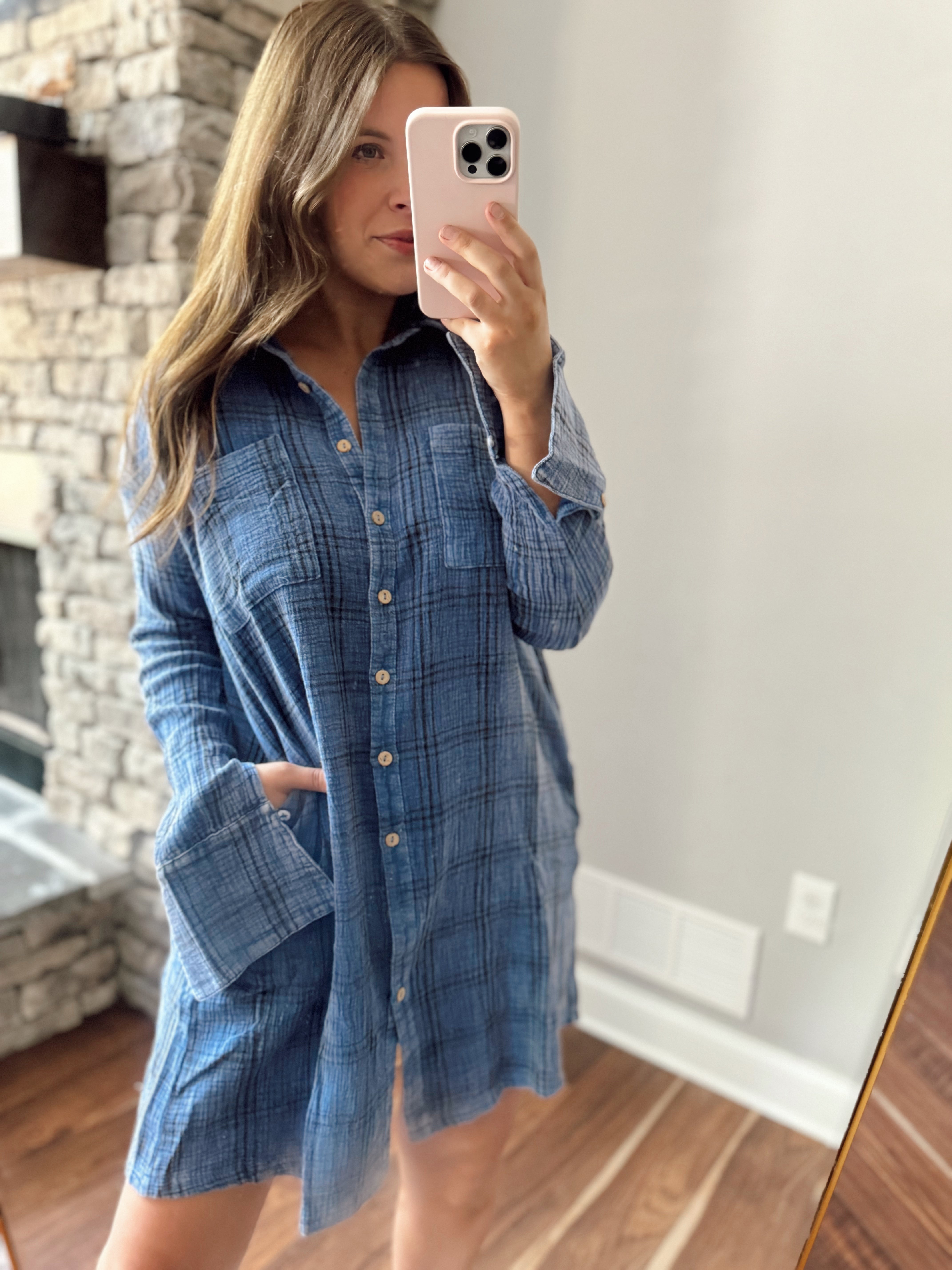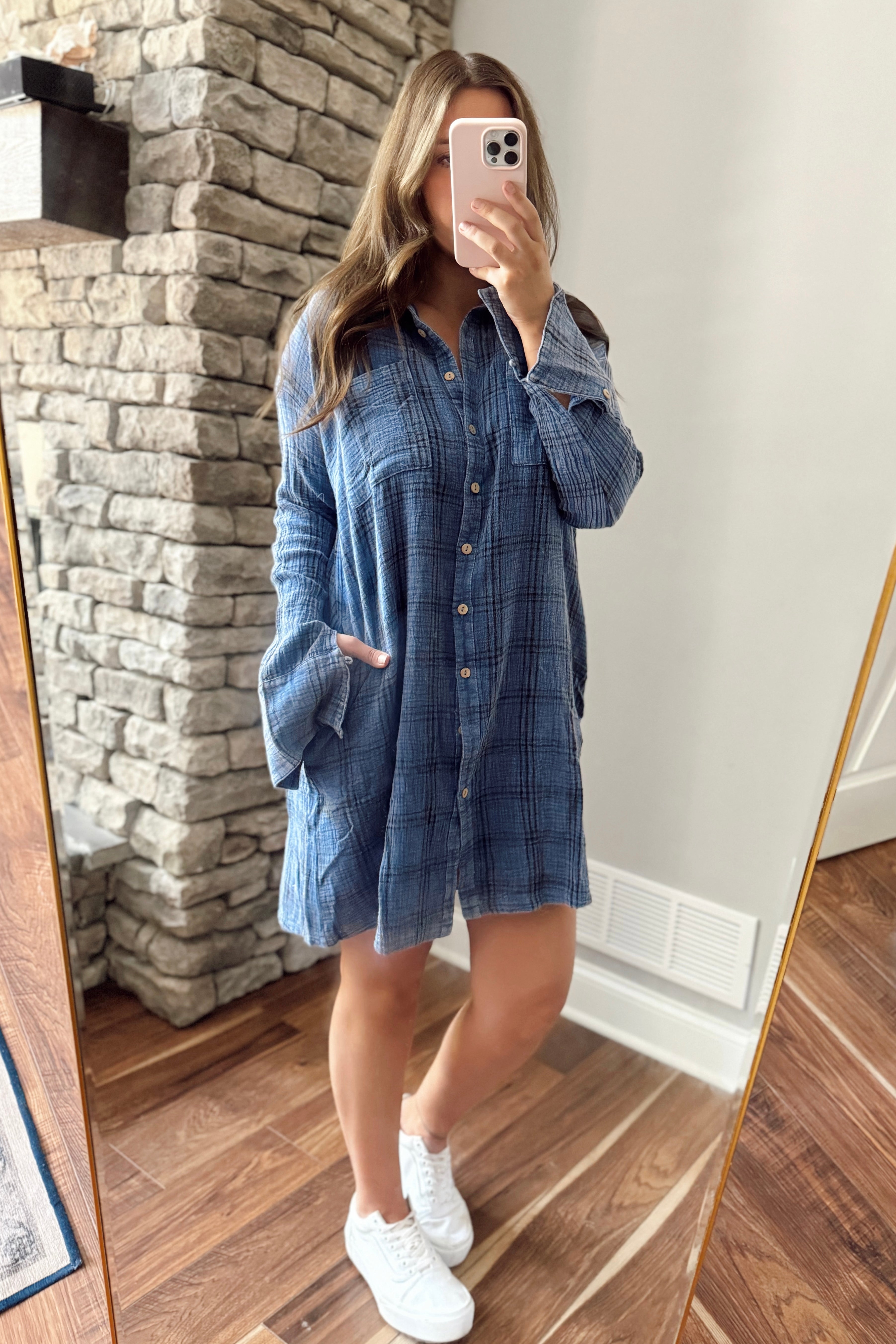 Autumn Days Cosmic Blue Mineral Washed Plaid Long Sleeve Dress
