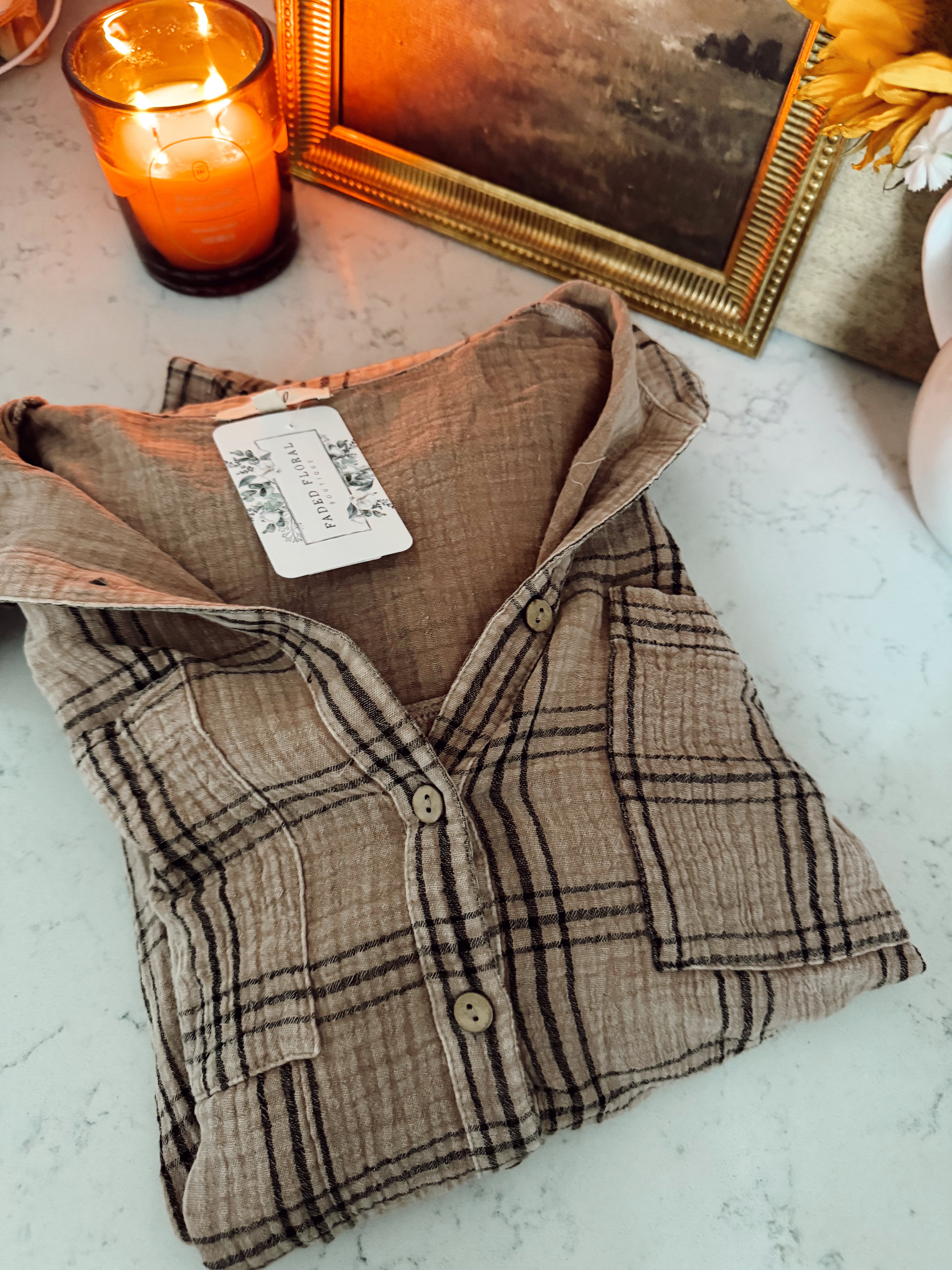 Autumn Days Mocha Mineral Washed Plaid Long Sleeve Dress