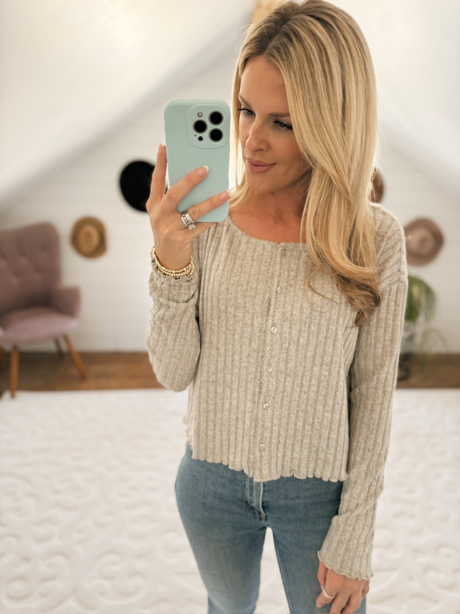 Baby I'm Yours Grey Brushed Ribbed Lettuce Hem Cropped Button Up Top