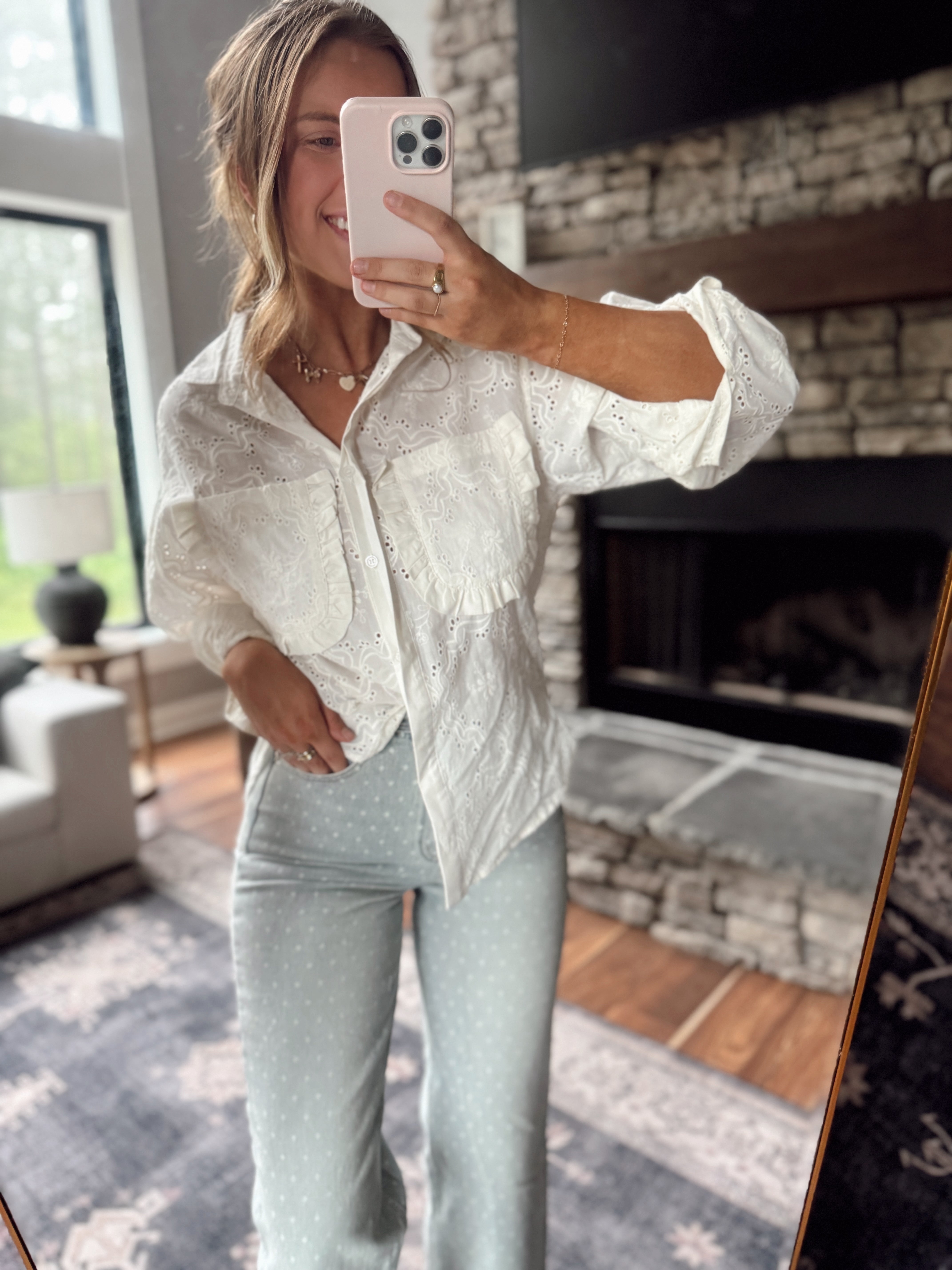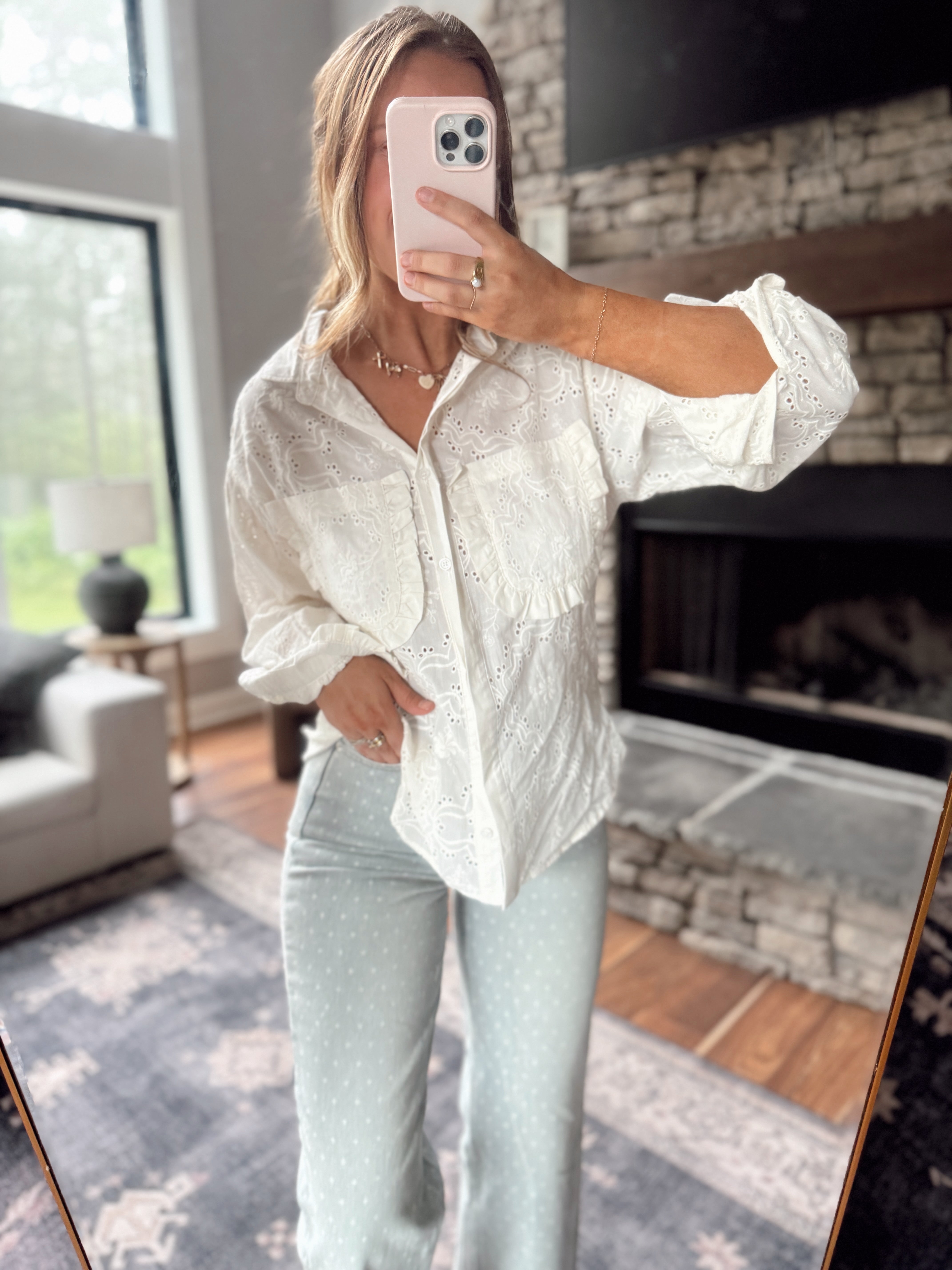 Going West Off White Flower Eyelet Ruffle Pocket Button Down