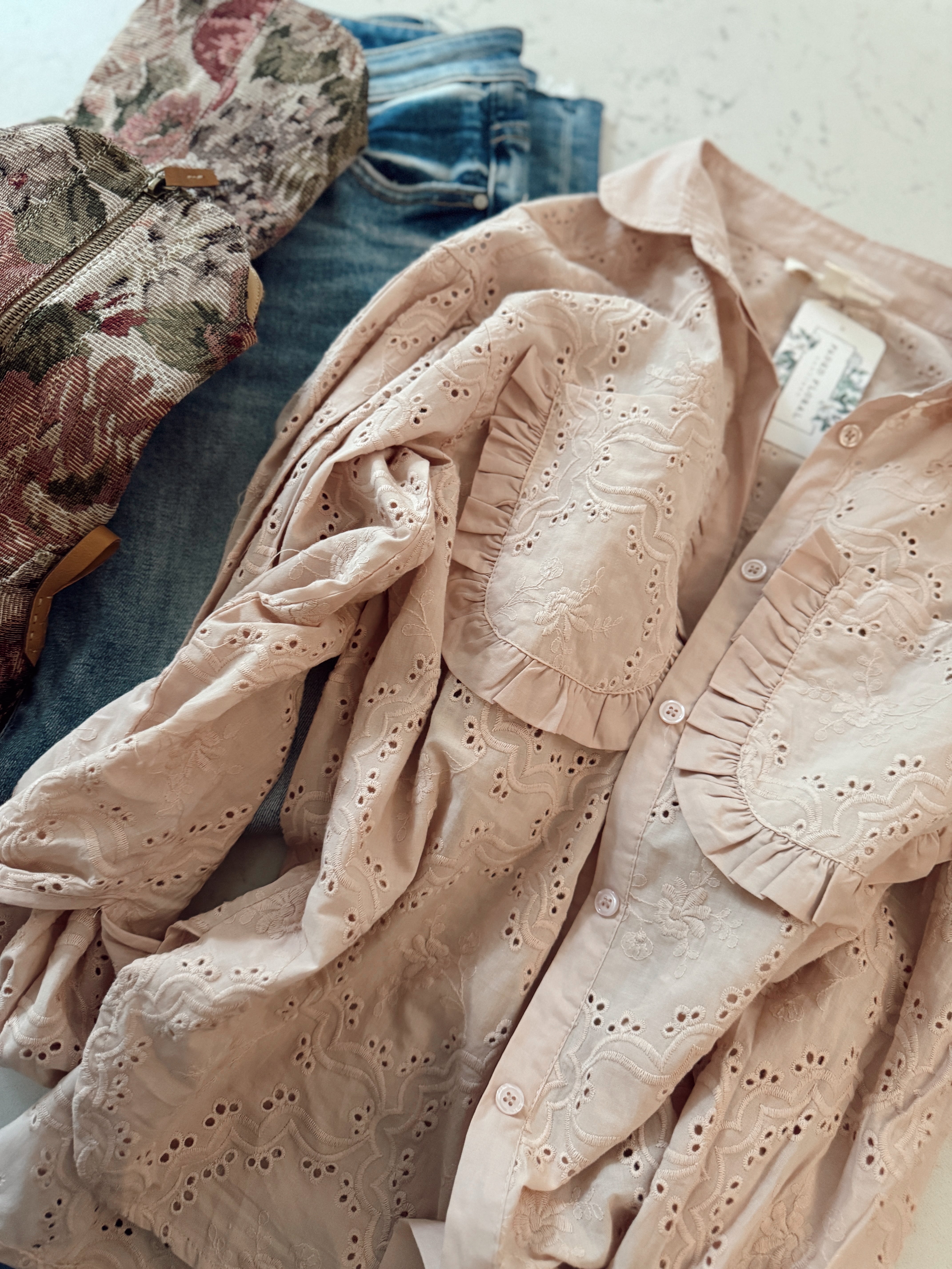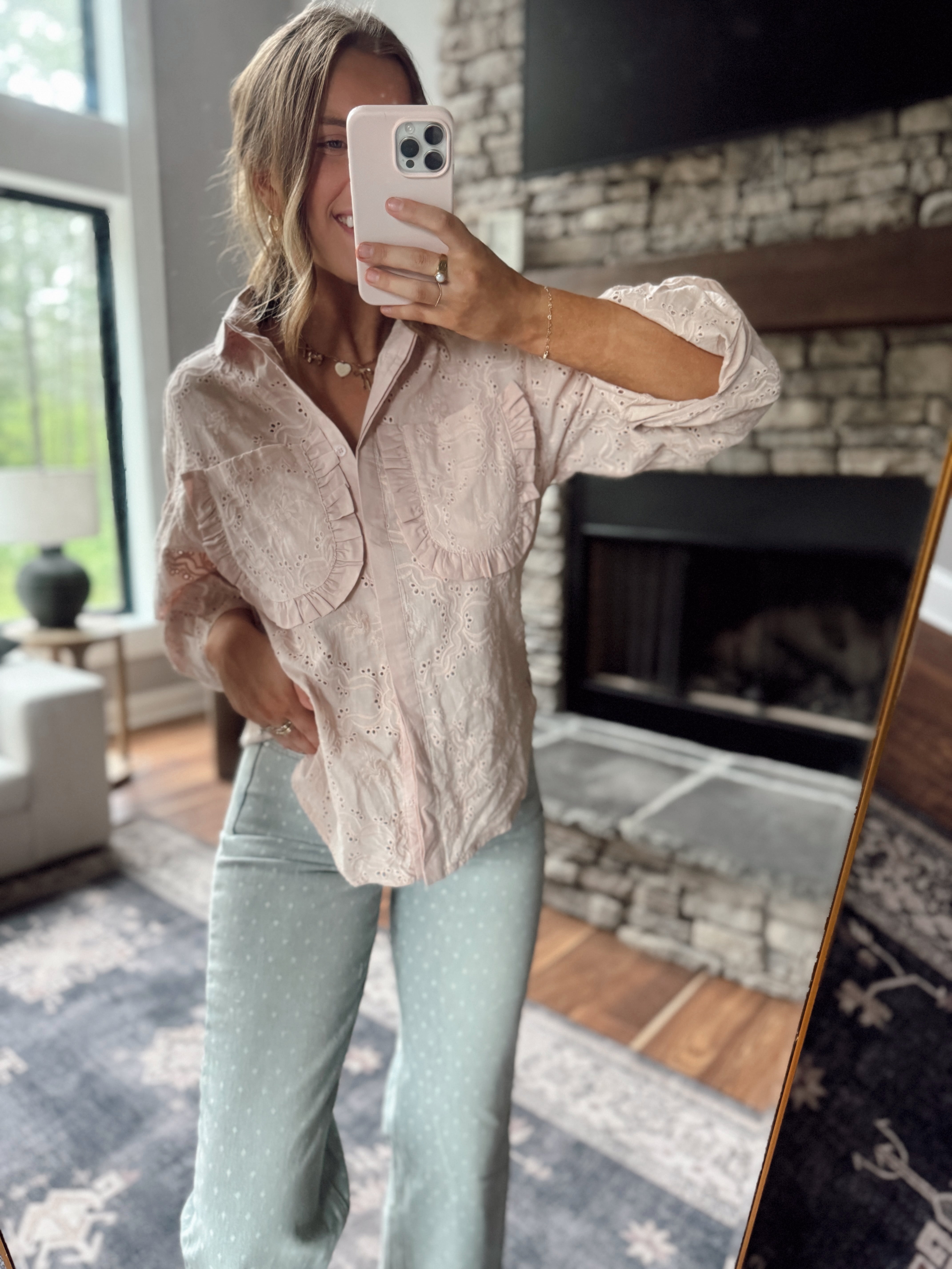 Going West Blush Flower Eyelet Ruffle Pocket Button Down