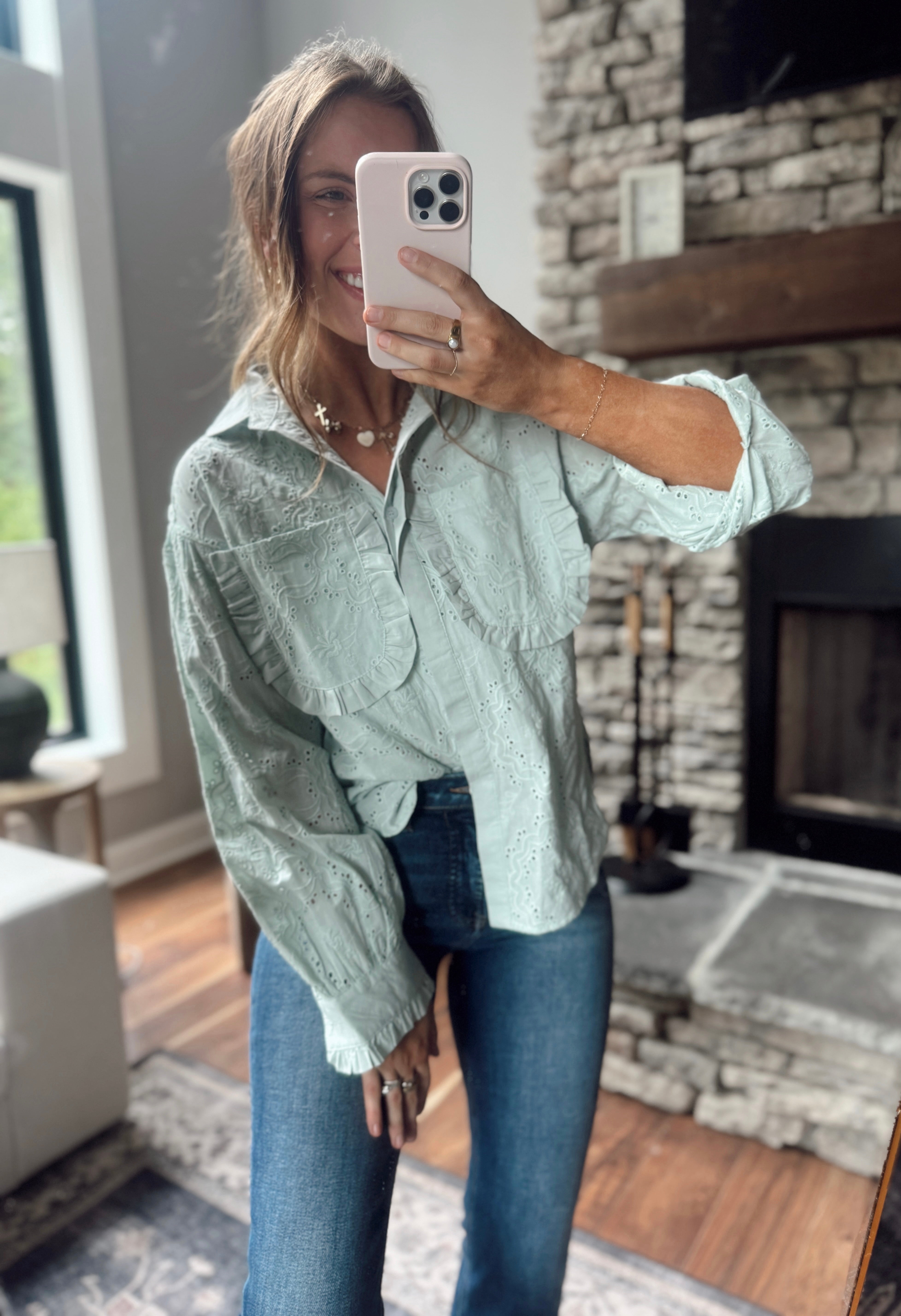 Going West Sage Flower Eyelet Ruffle Pocket Button Down