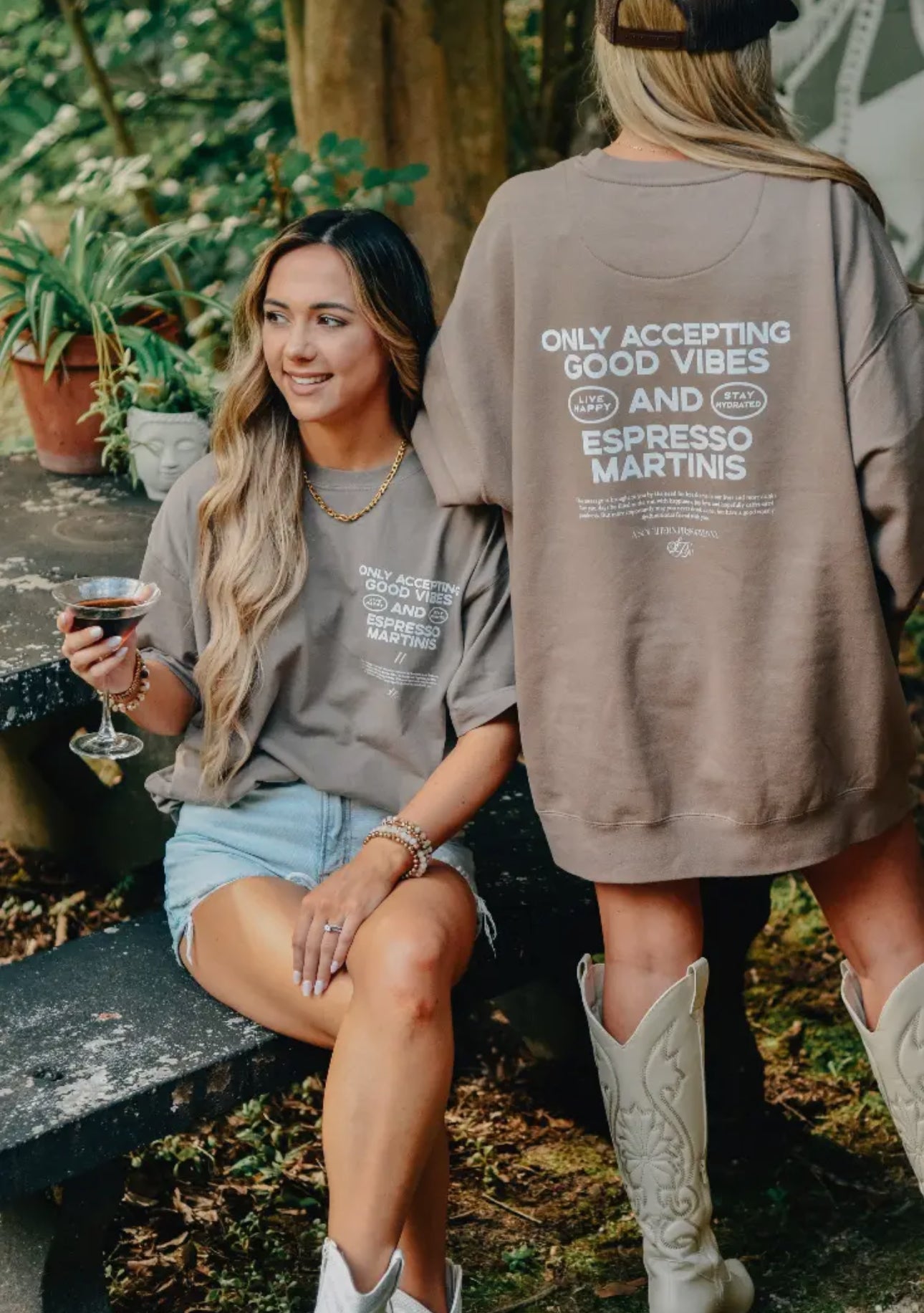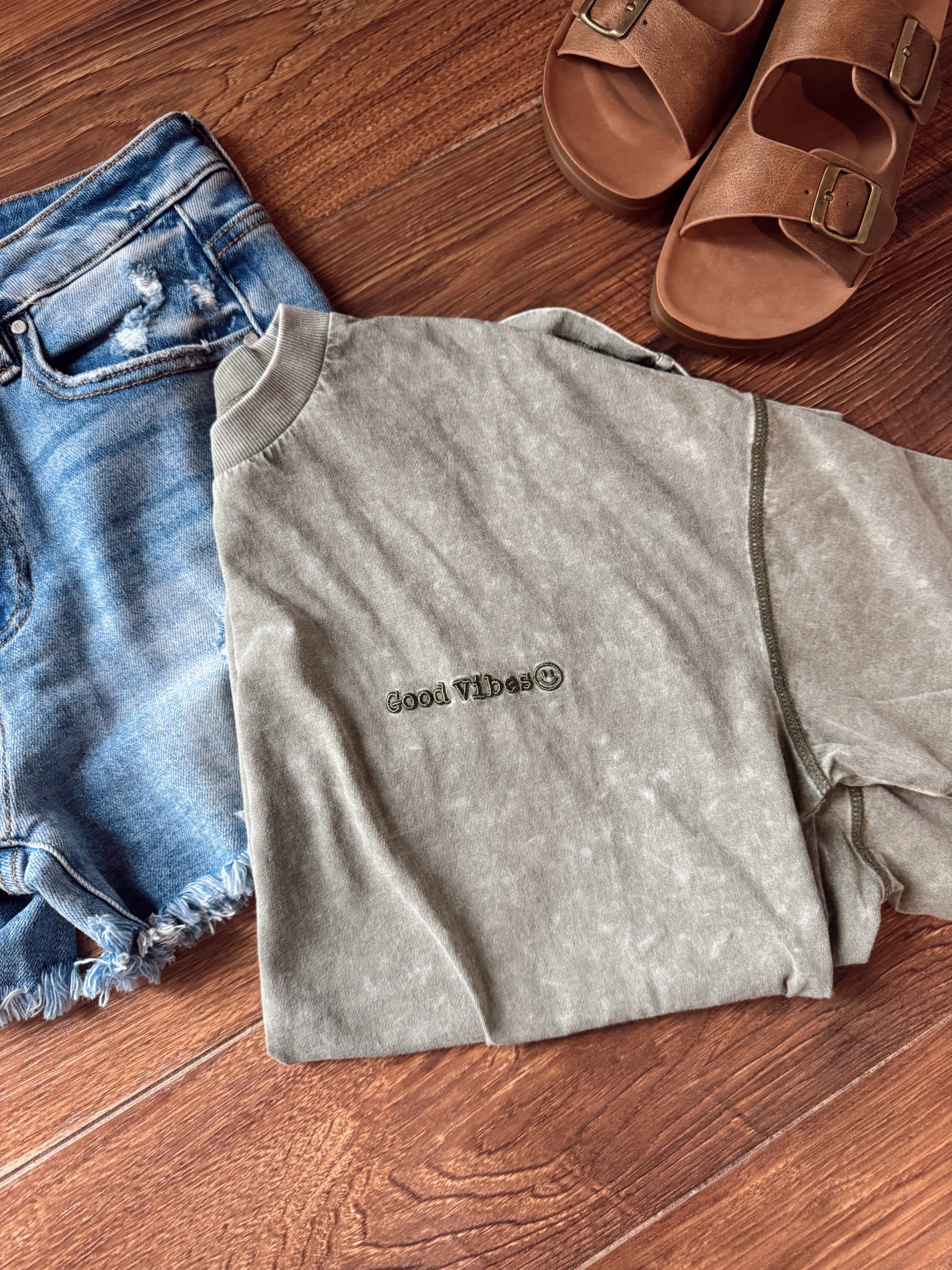 Good Vibes Olive Mineral-Washed Embroidered Tee