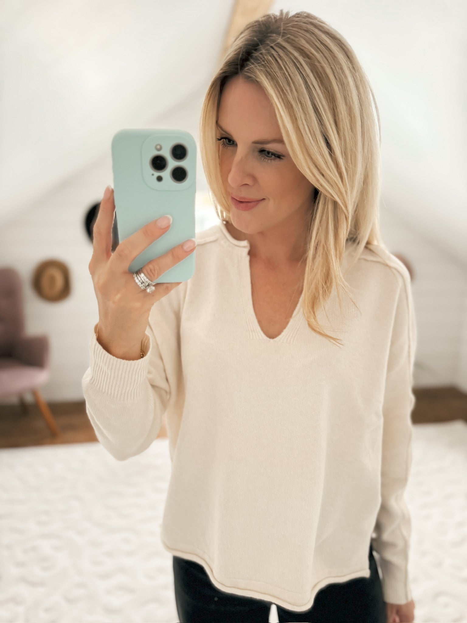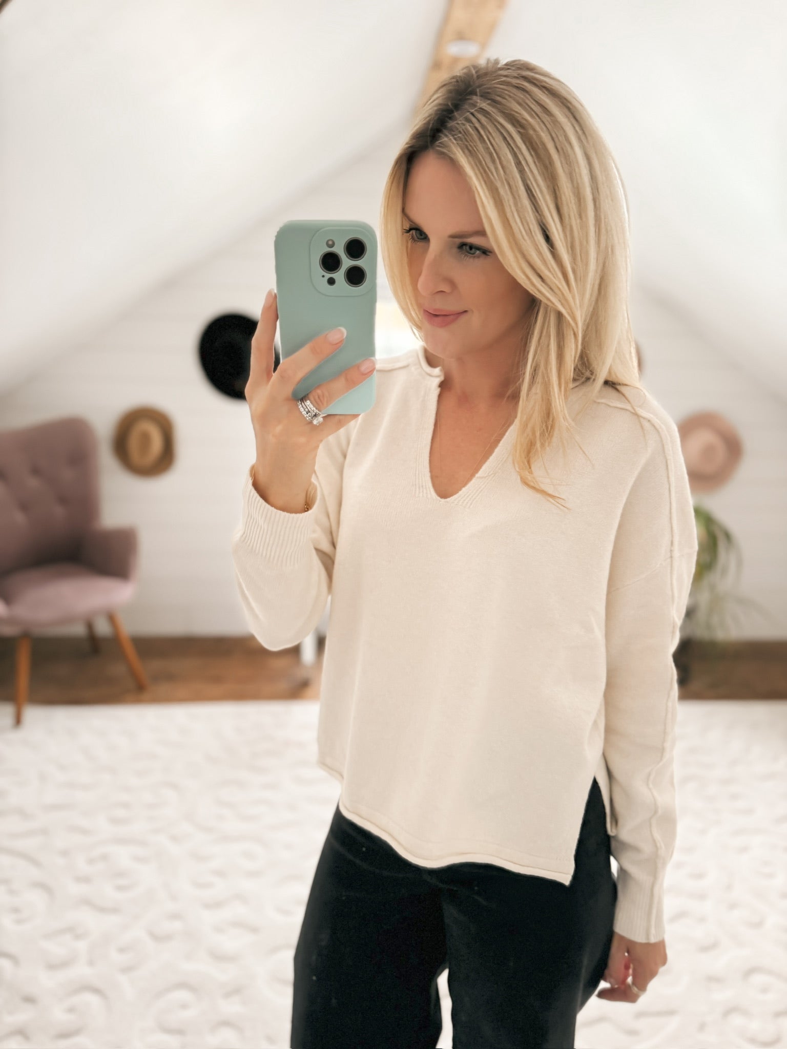 Grateful Cream Exposed Seam Split Neck Knit Sweater