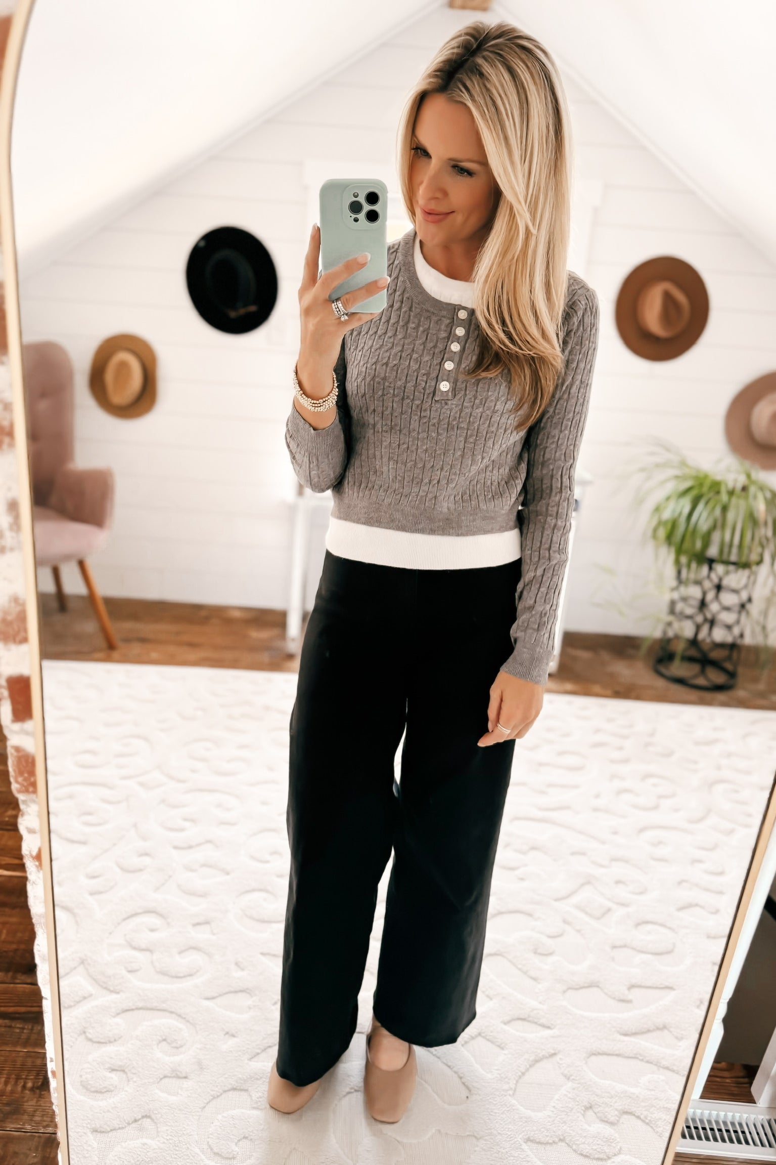 Grey Smarty Pants Cable Knit Henley layered Sweater