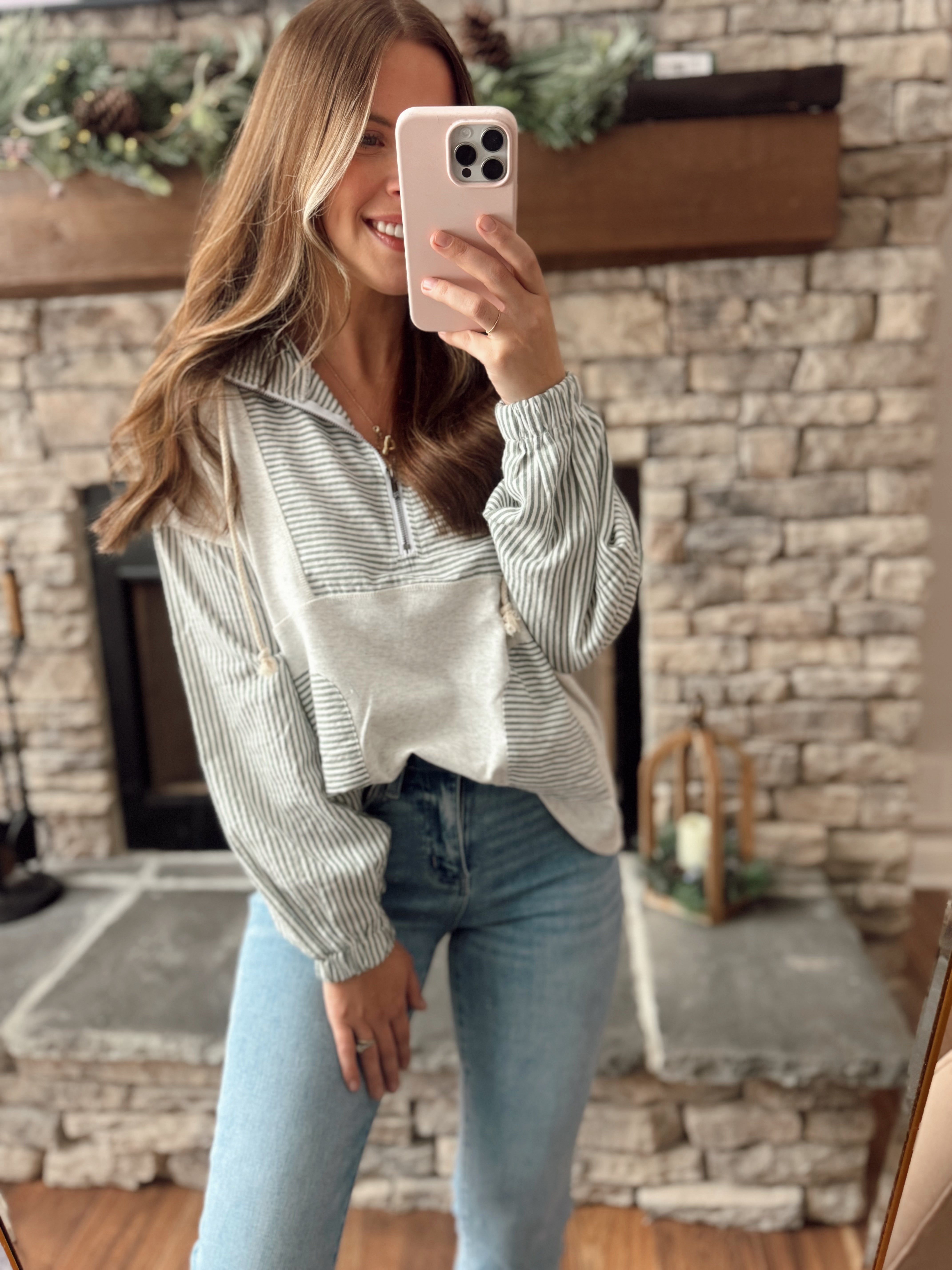 Green/Grey Coast Line Stripe Mix French Terry Half Zip