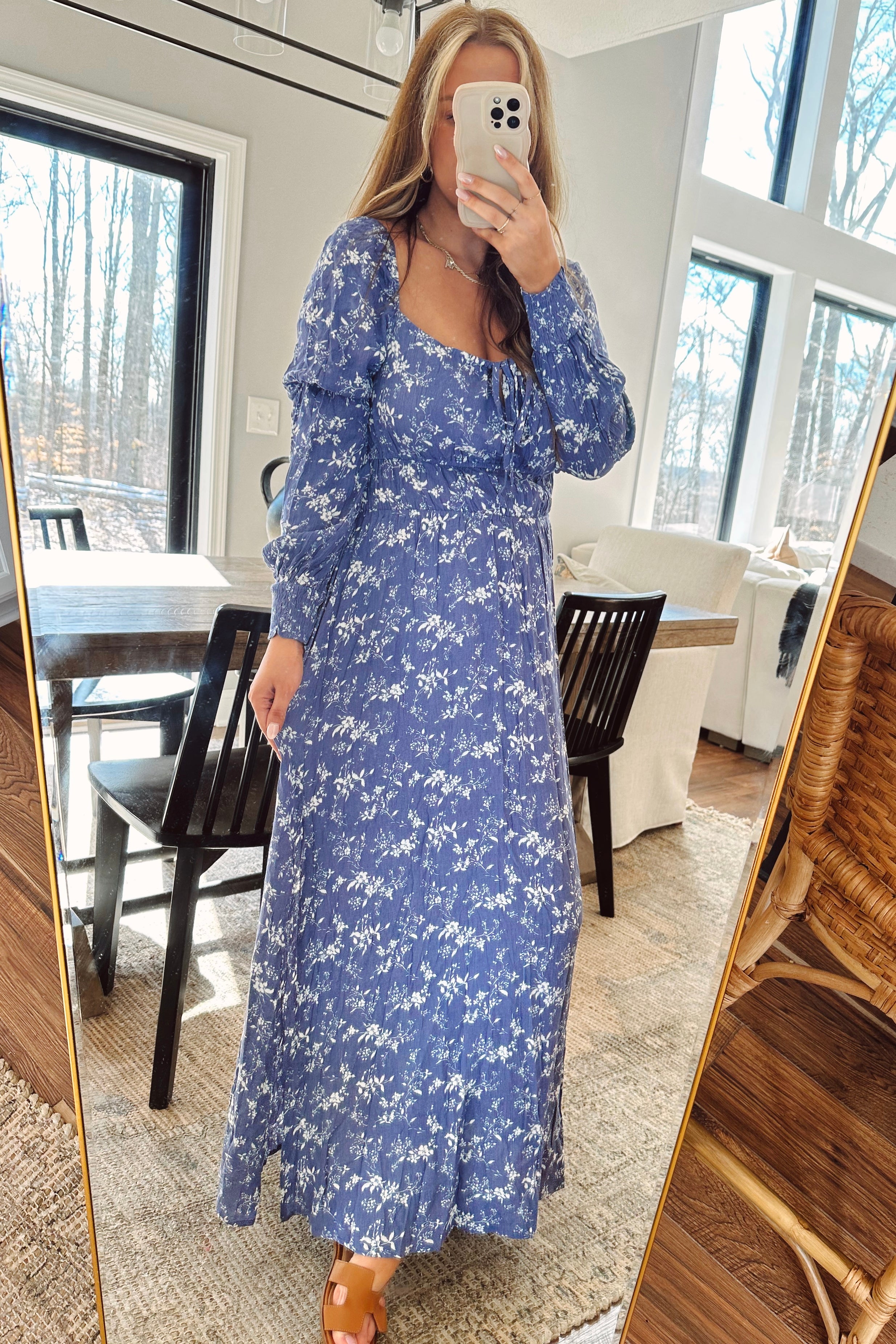 Harmony White/Blue Floral Embroidered Front Tie Maxi