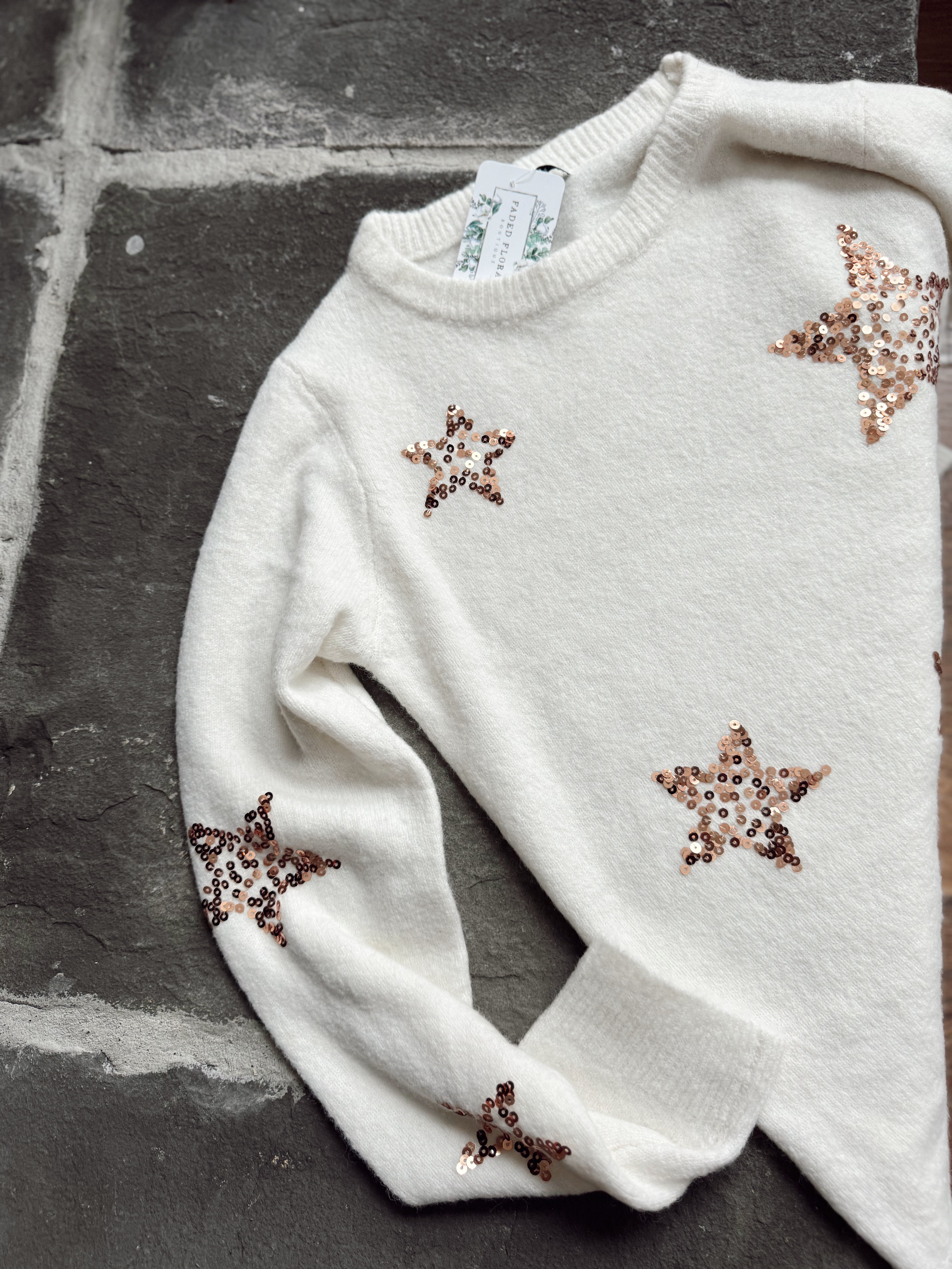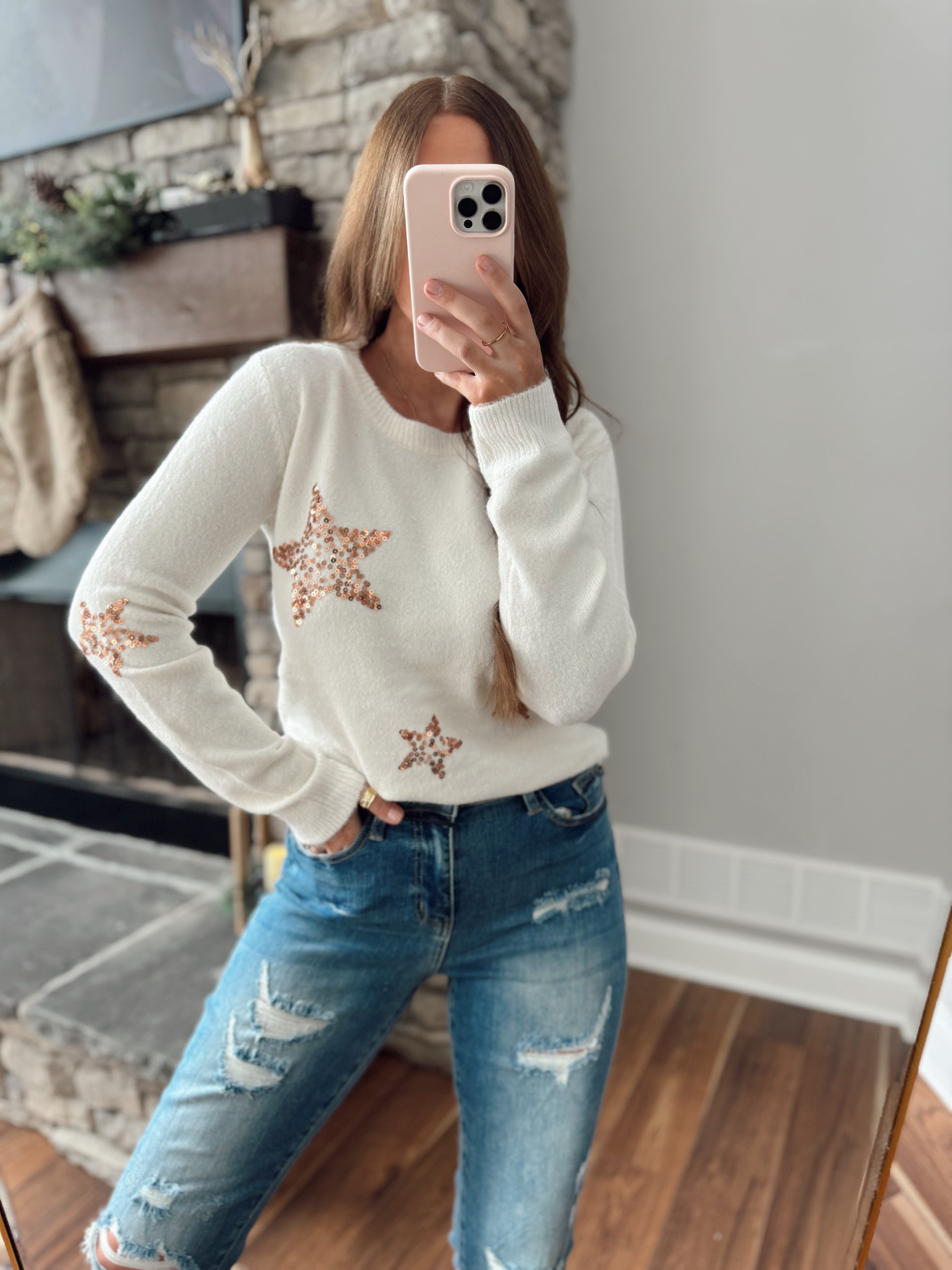Ivory Wishing On A Star Sequins Crew Knit Sweater