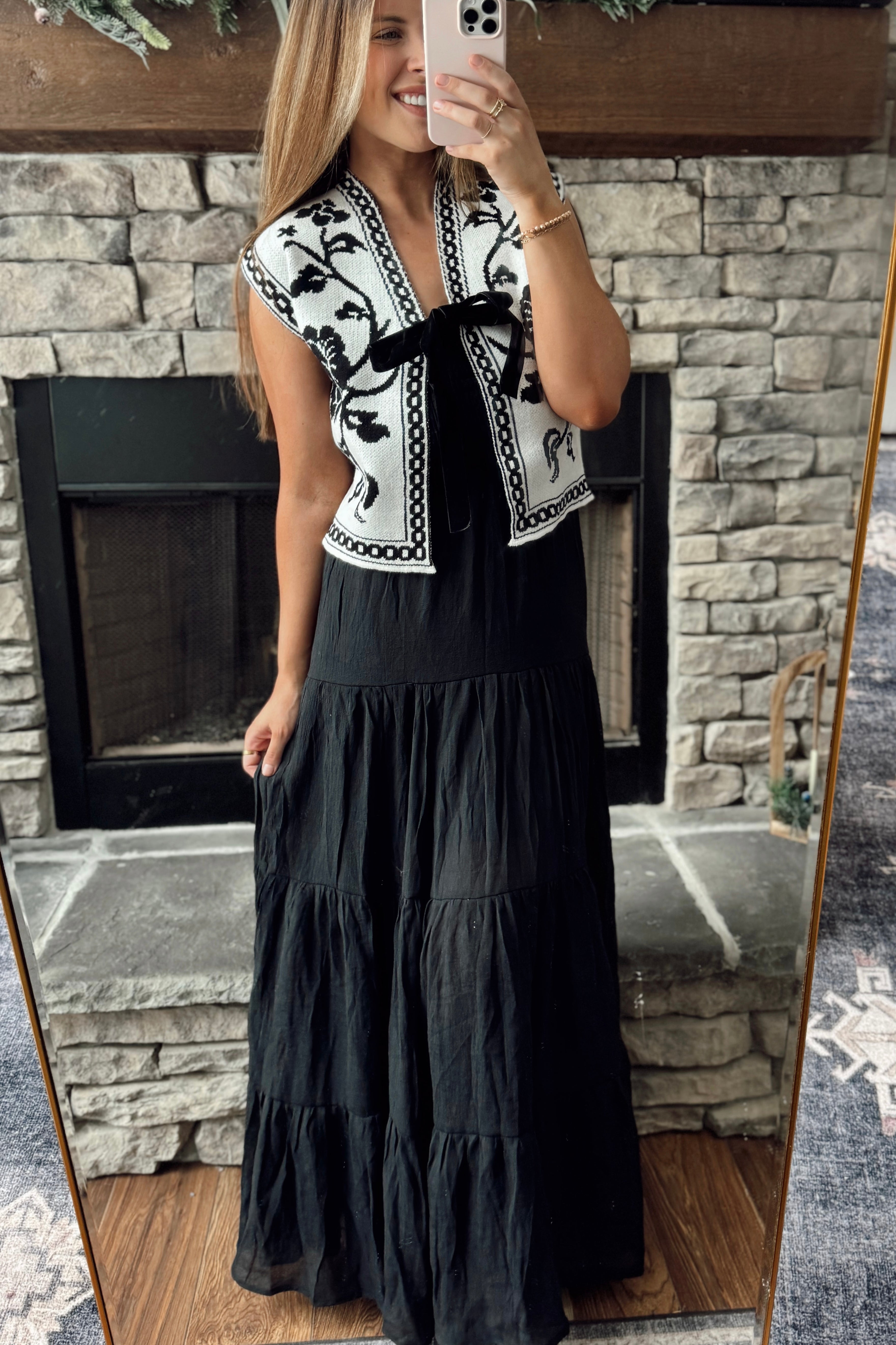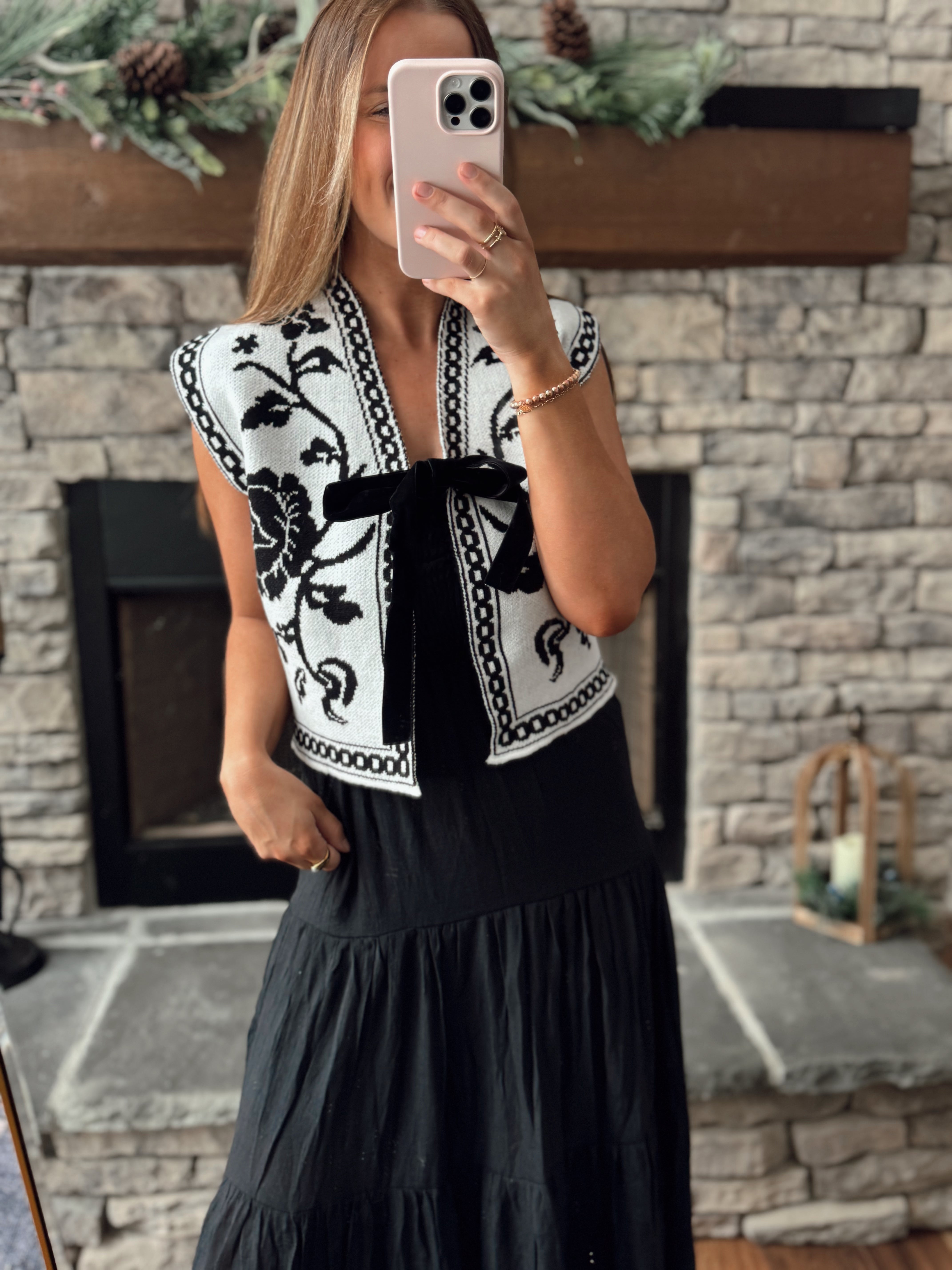 Jackie Black Rose Print Sweater Vest with Velvet Front Tie