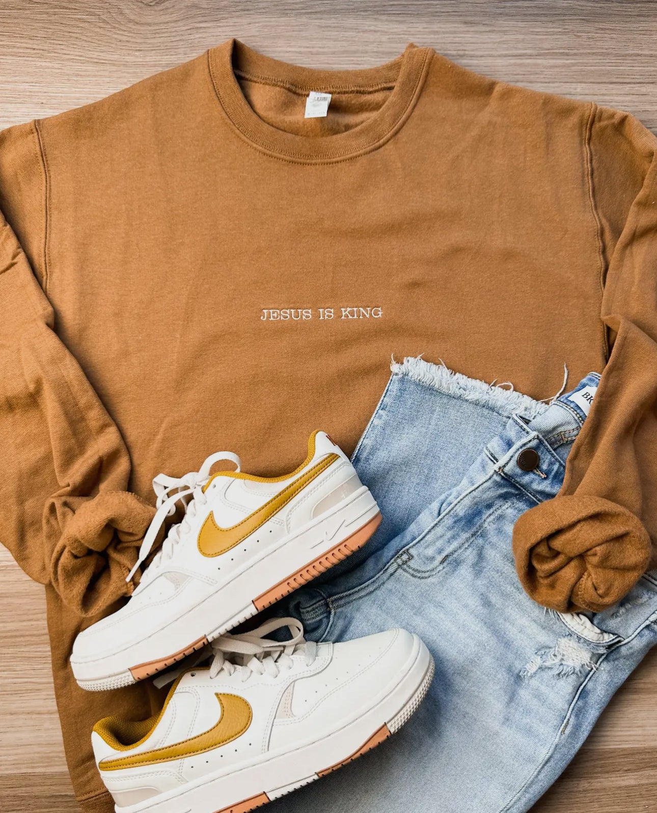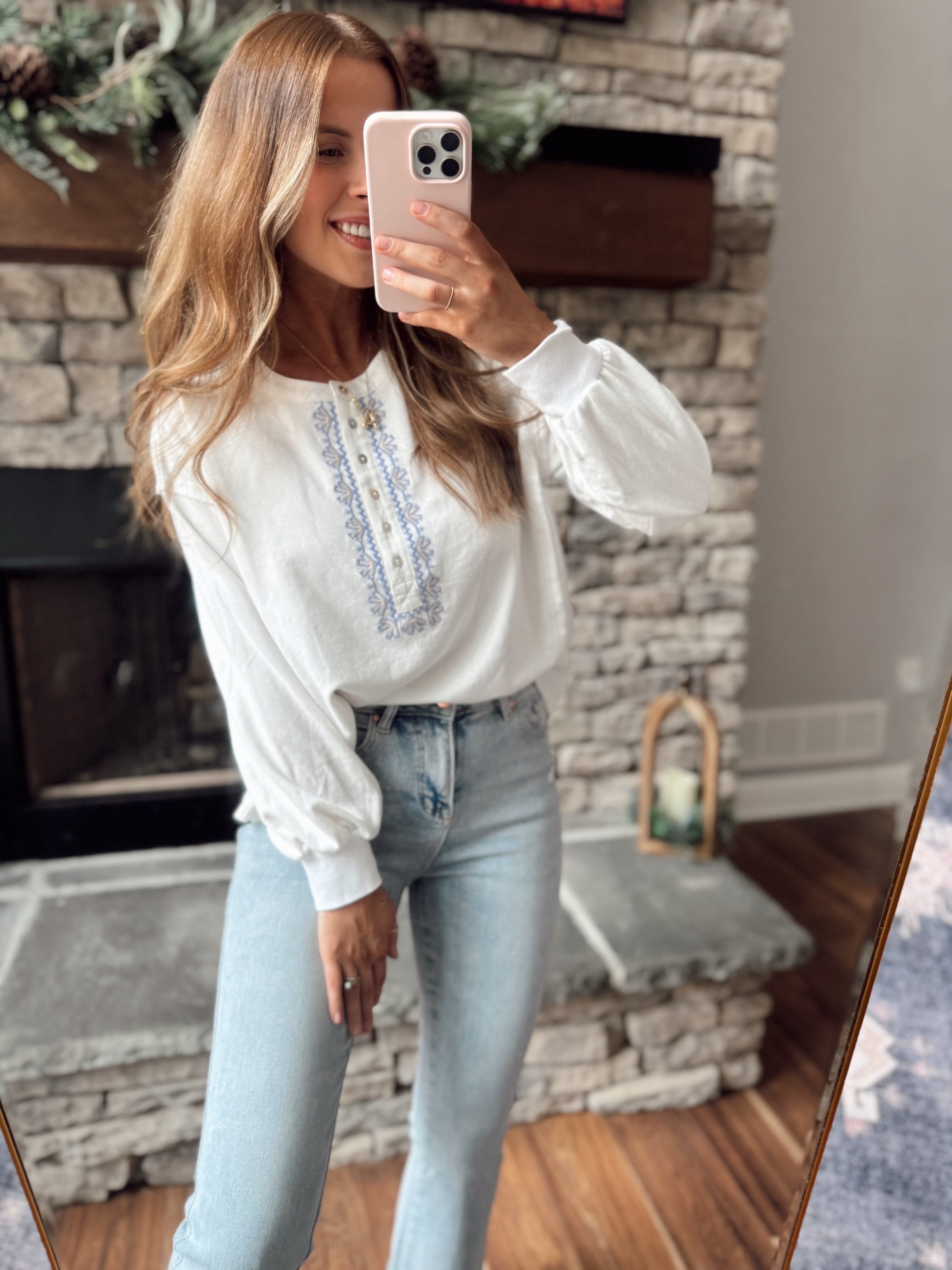 Jazzy Ivory Embroidered French Terry Long Sleeve Henley