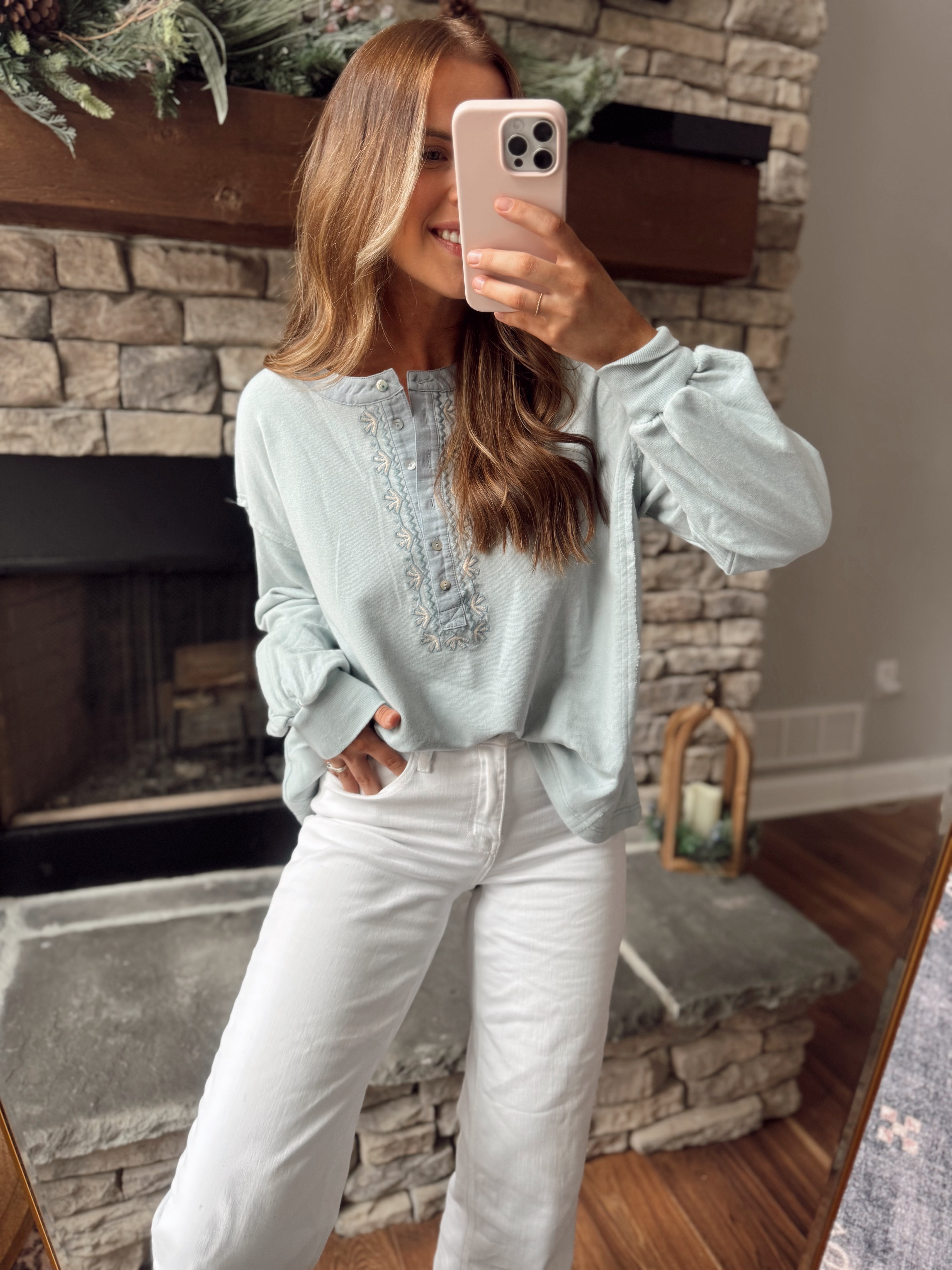 Jazzy Dusty Blue Embroidered French Terry Long Sleeve Henley