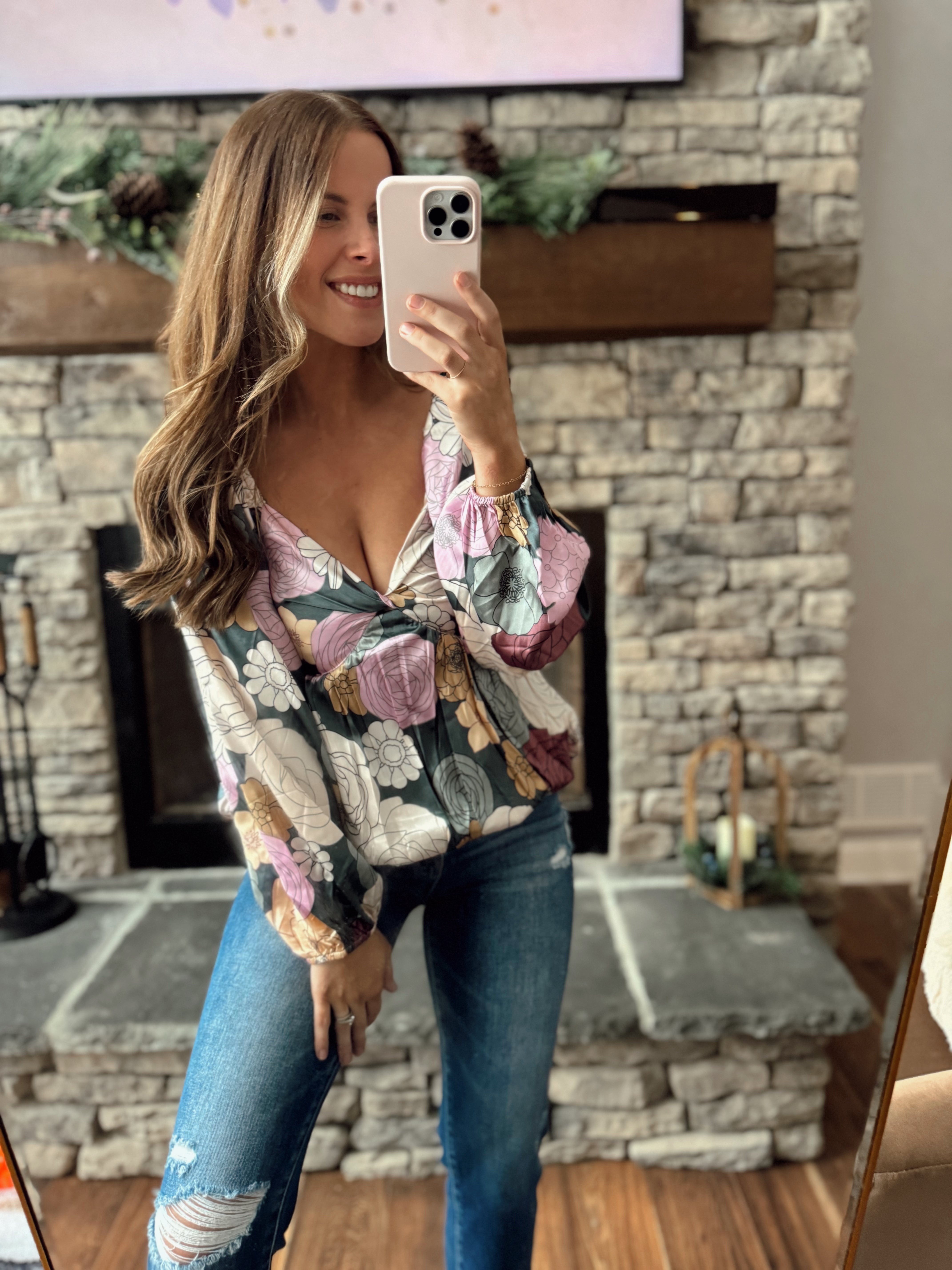 Jasmine Teal Floral Print Front Twist Babydoll Blouse