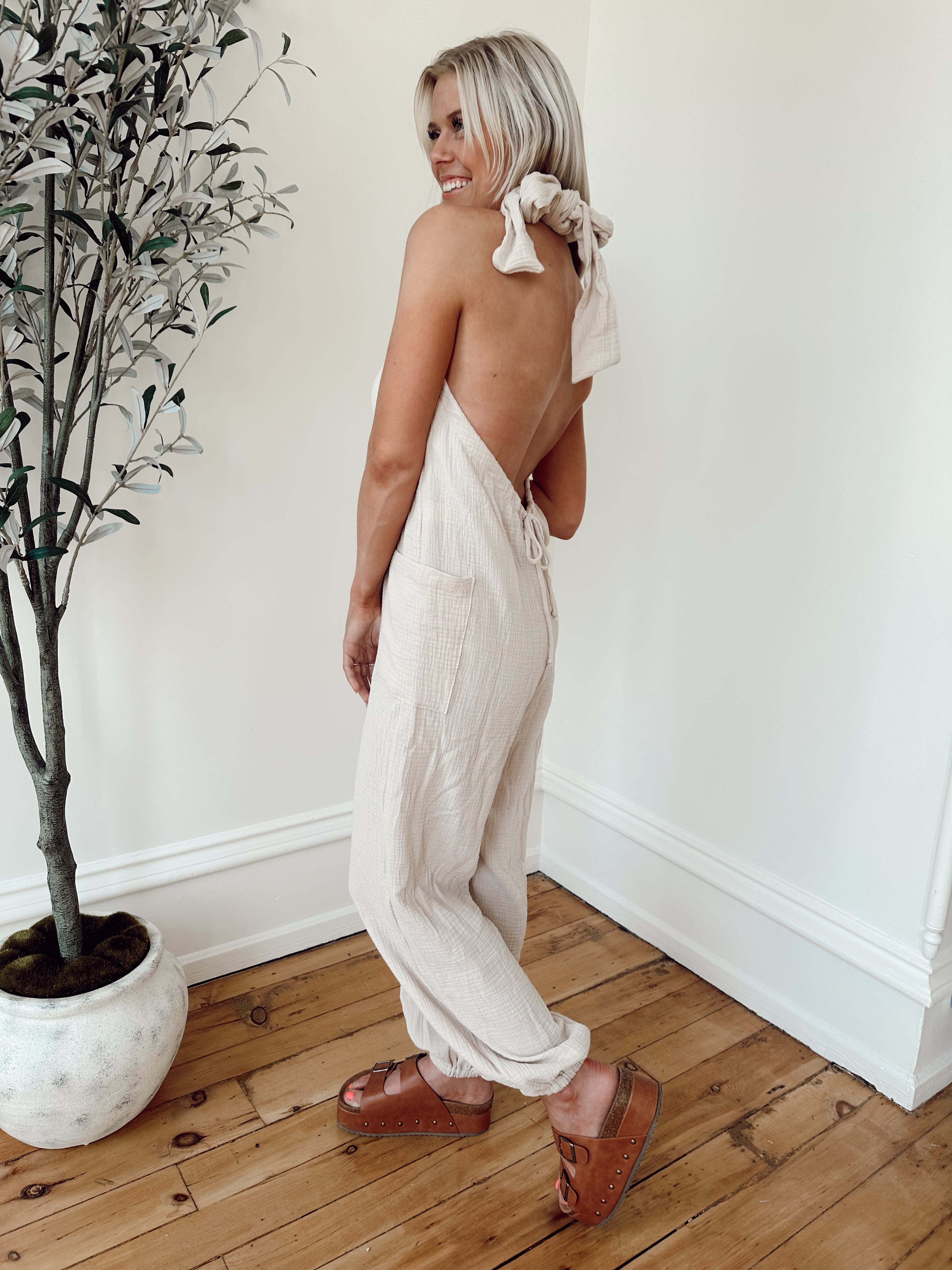 Kara Cream Gauze Halter Jumpuit