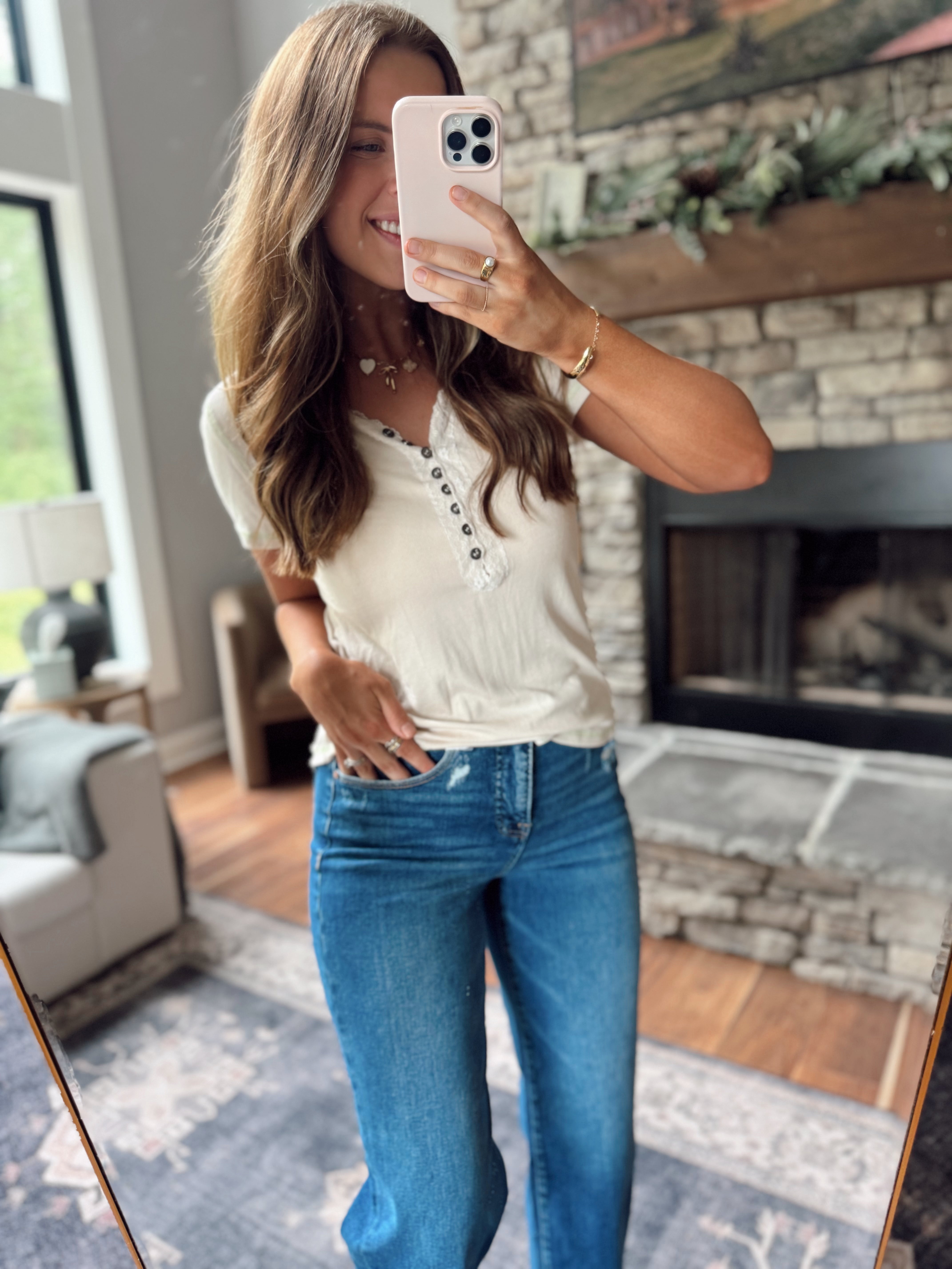 Just a Hint Butter Milk V Neck Lace Detailing Short Sleeve