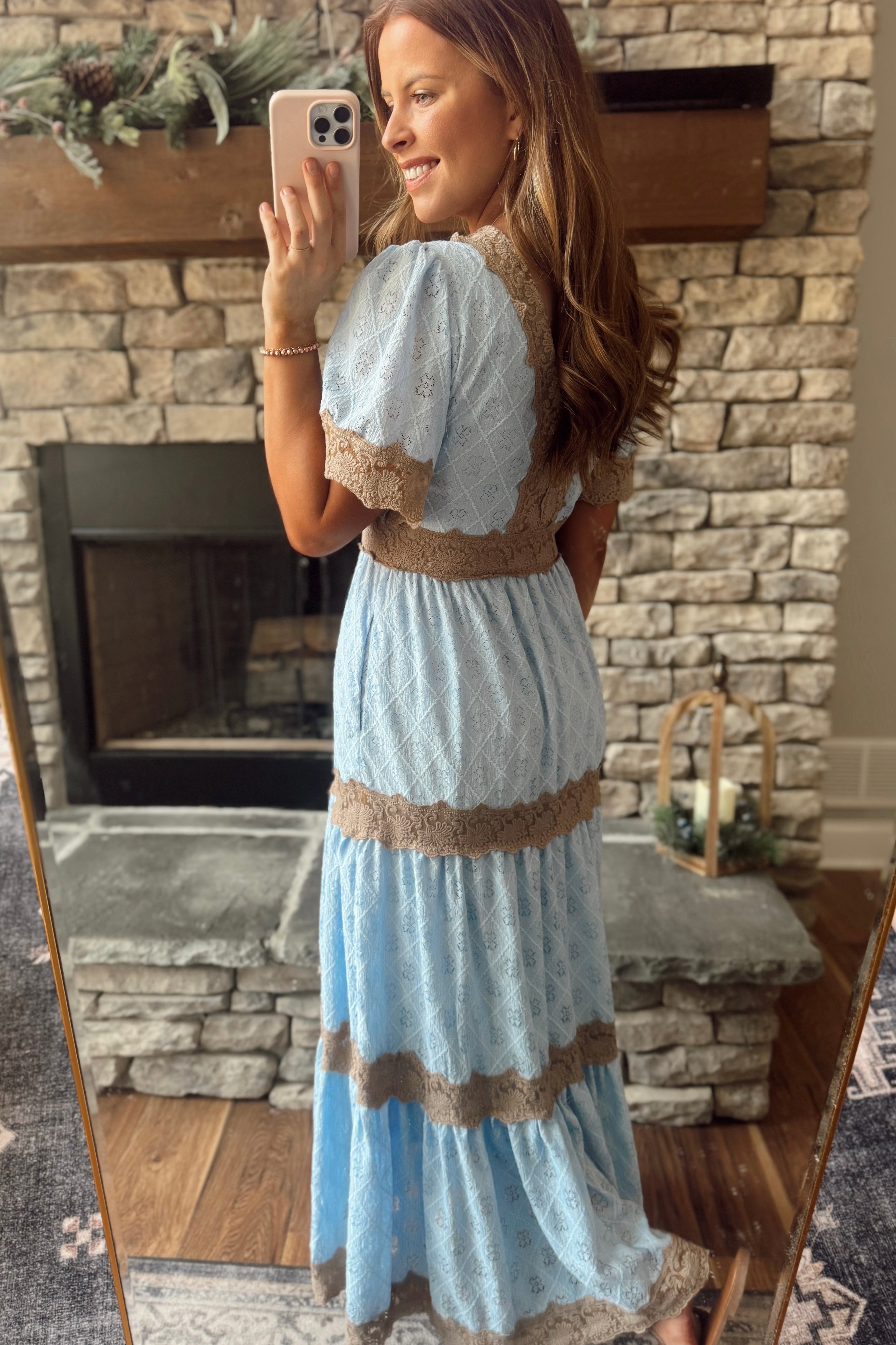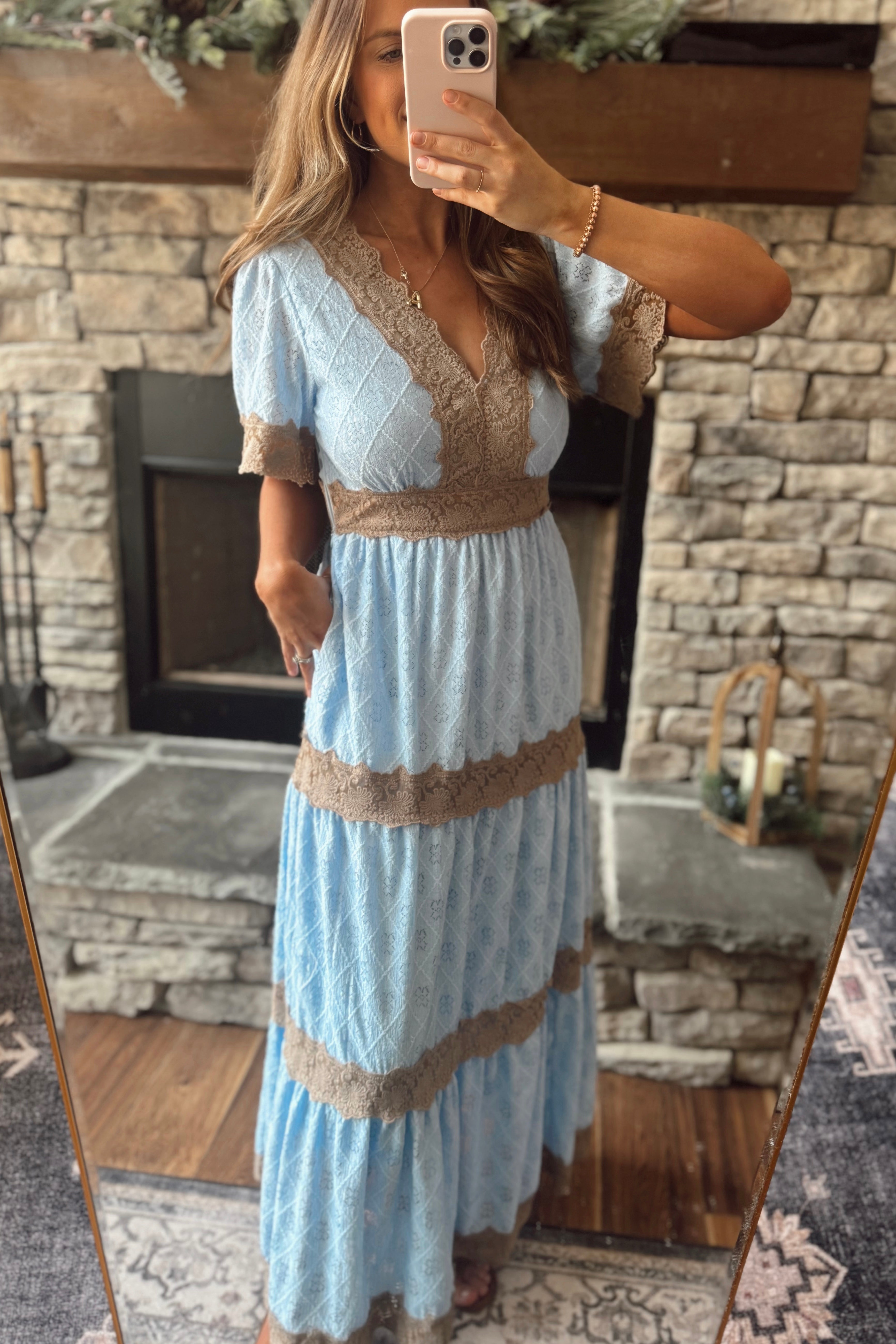 Lace Love Blue/Mocha V-Neck Short Sleeve Lace Maxi