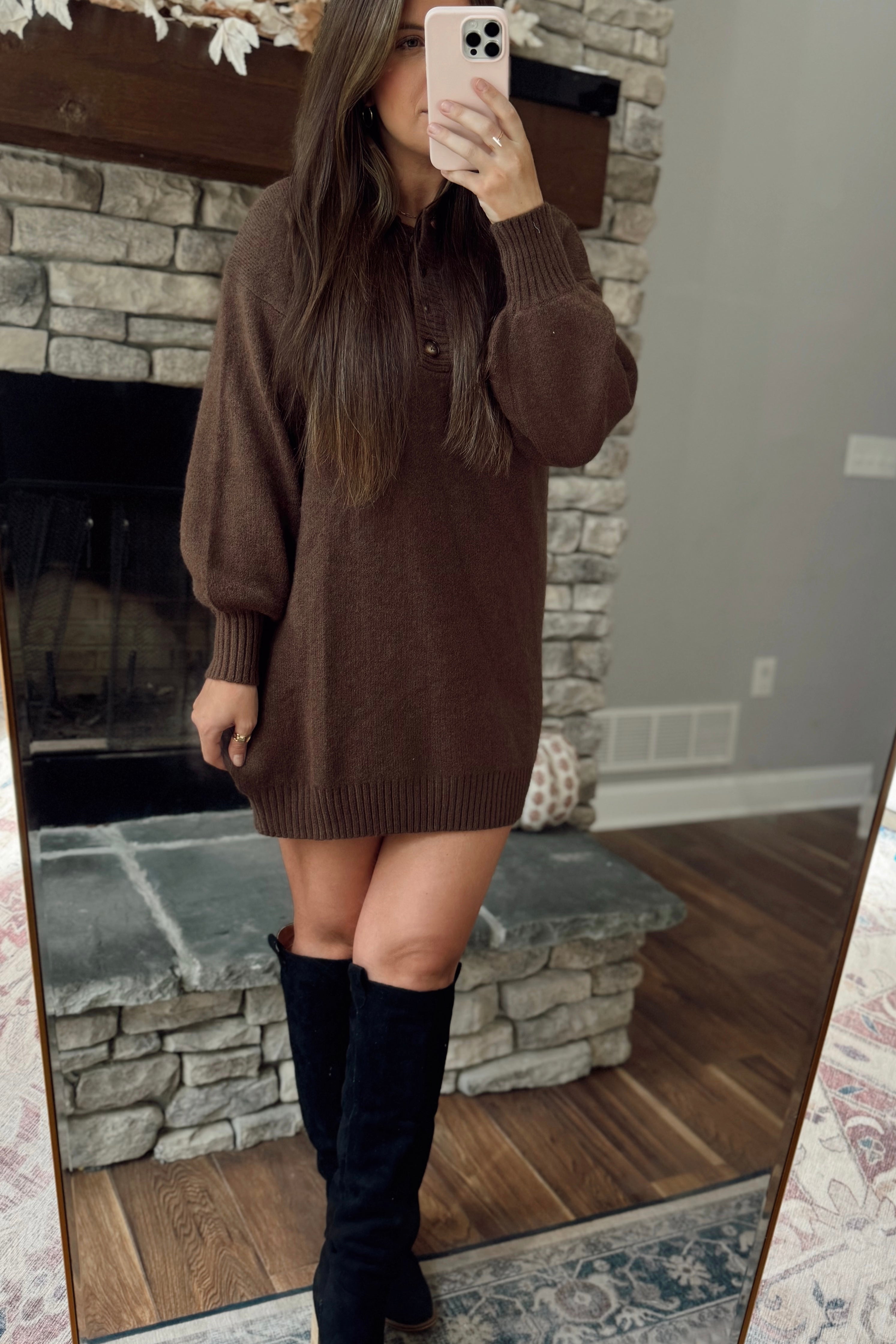 Lakelyn Coco Brown Half Button Long Sleeve Sweater Knit Mini