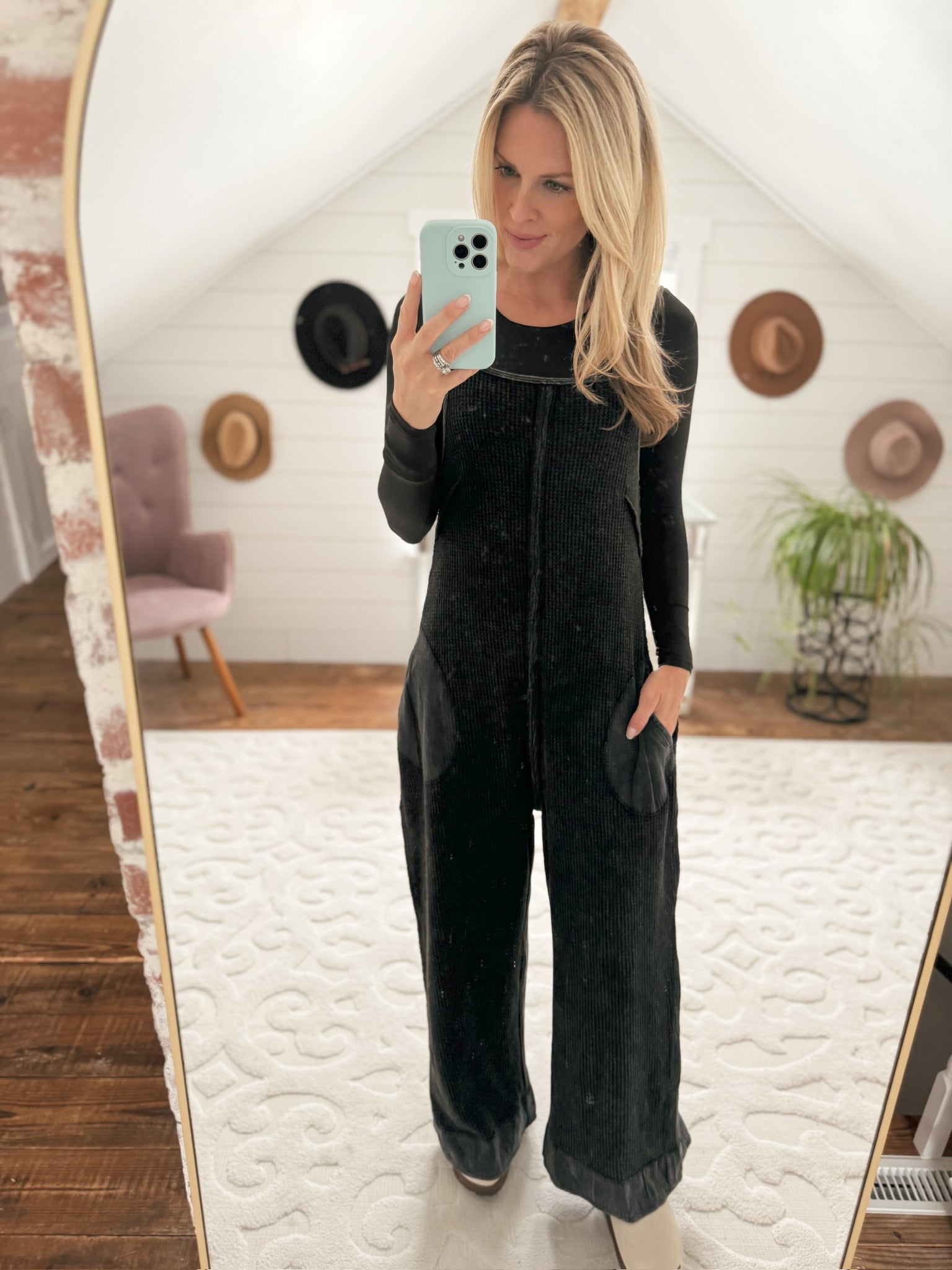Kickin It Back Black Mineral Washed Waffle Knit Jumpsuit