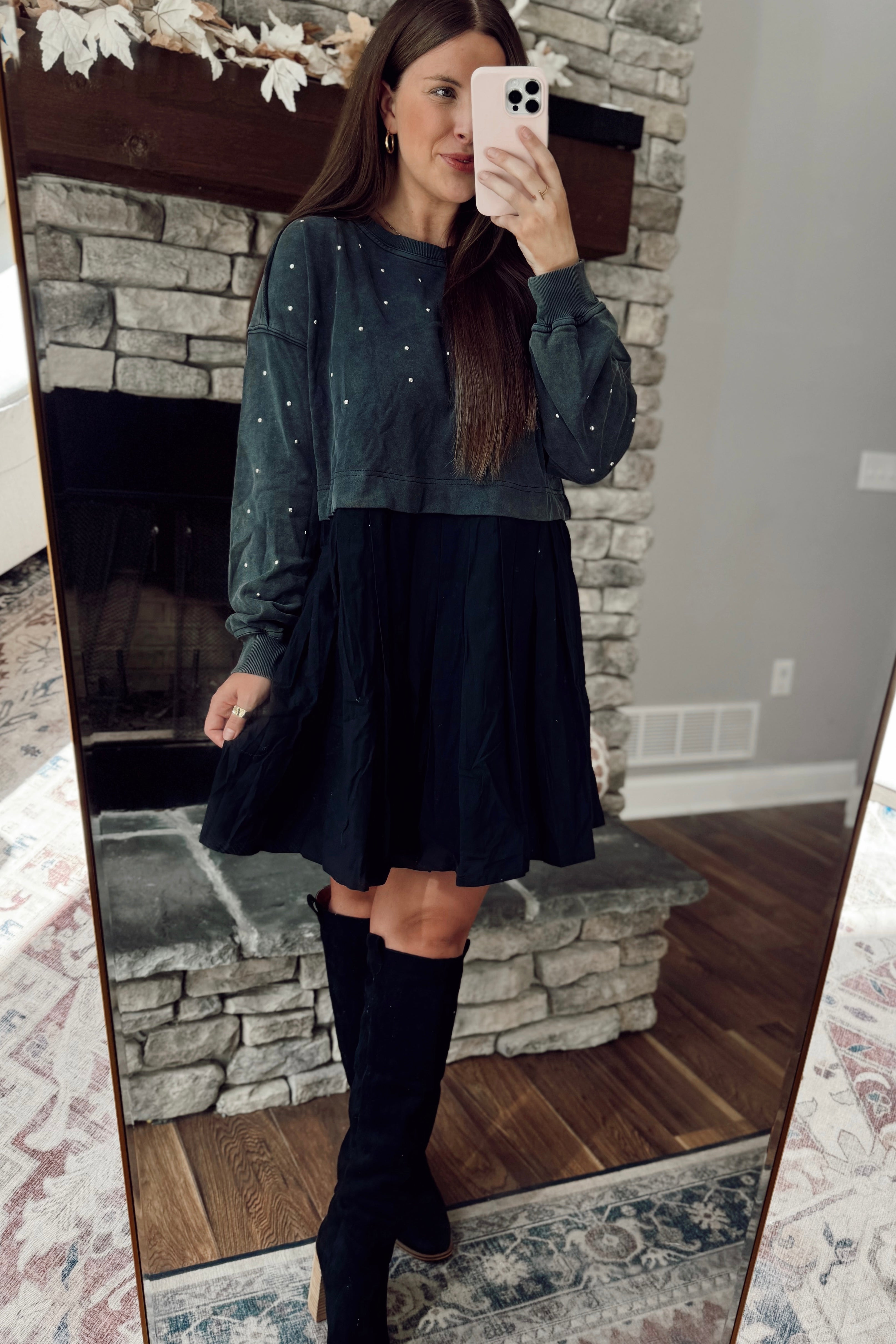 Leave Them Guessing Black Studded French Terry Sweatshirt Dress