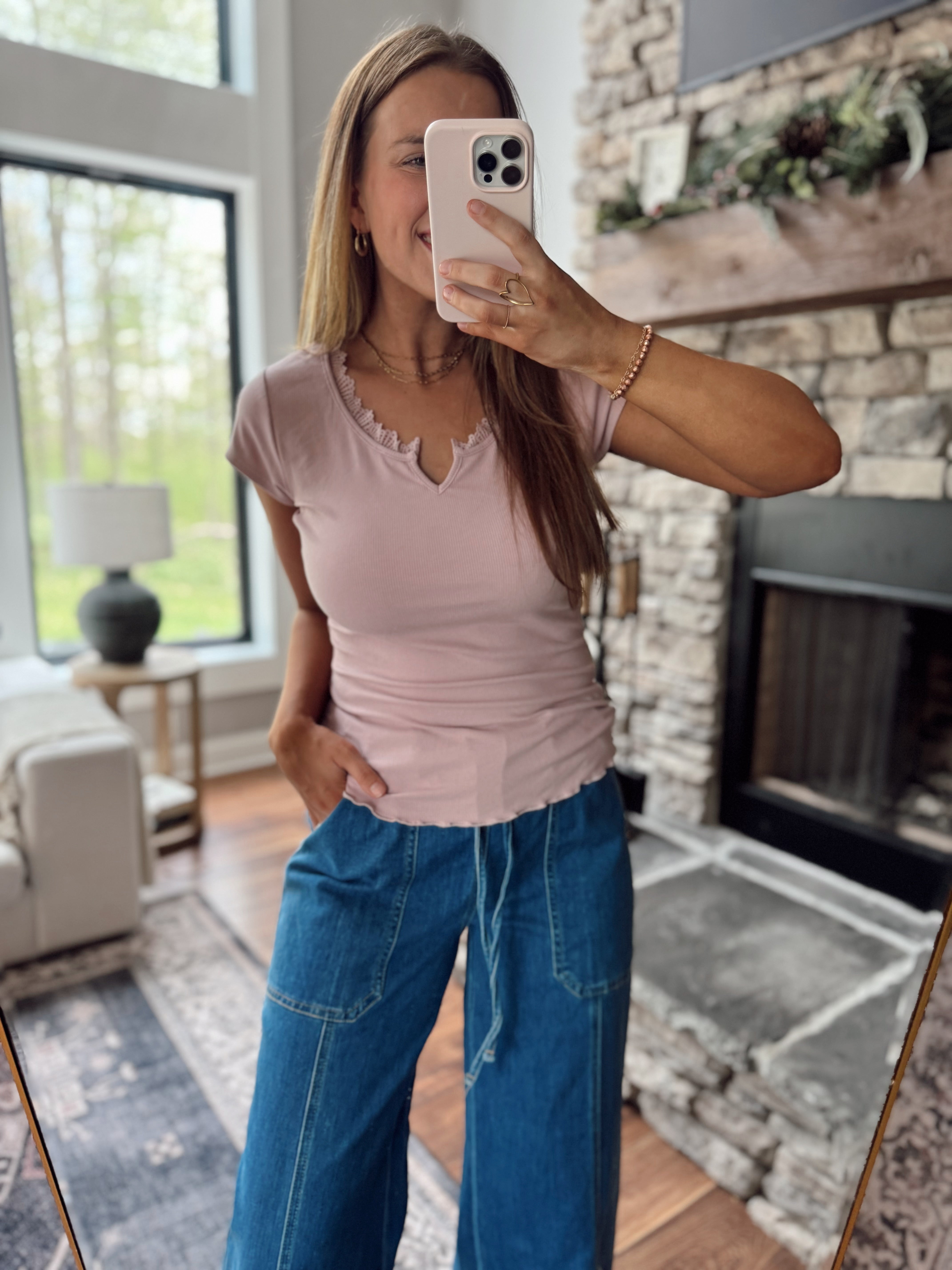 Light Mauve Short Sleeve Lace Trim Top