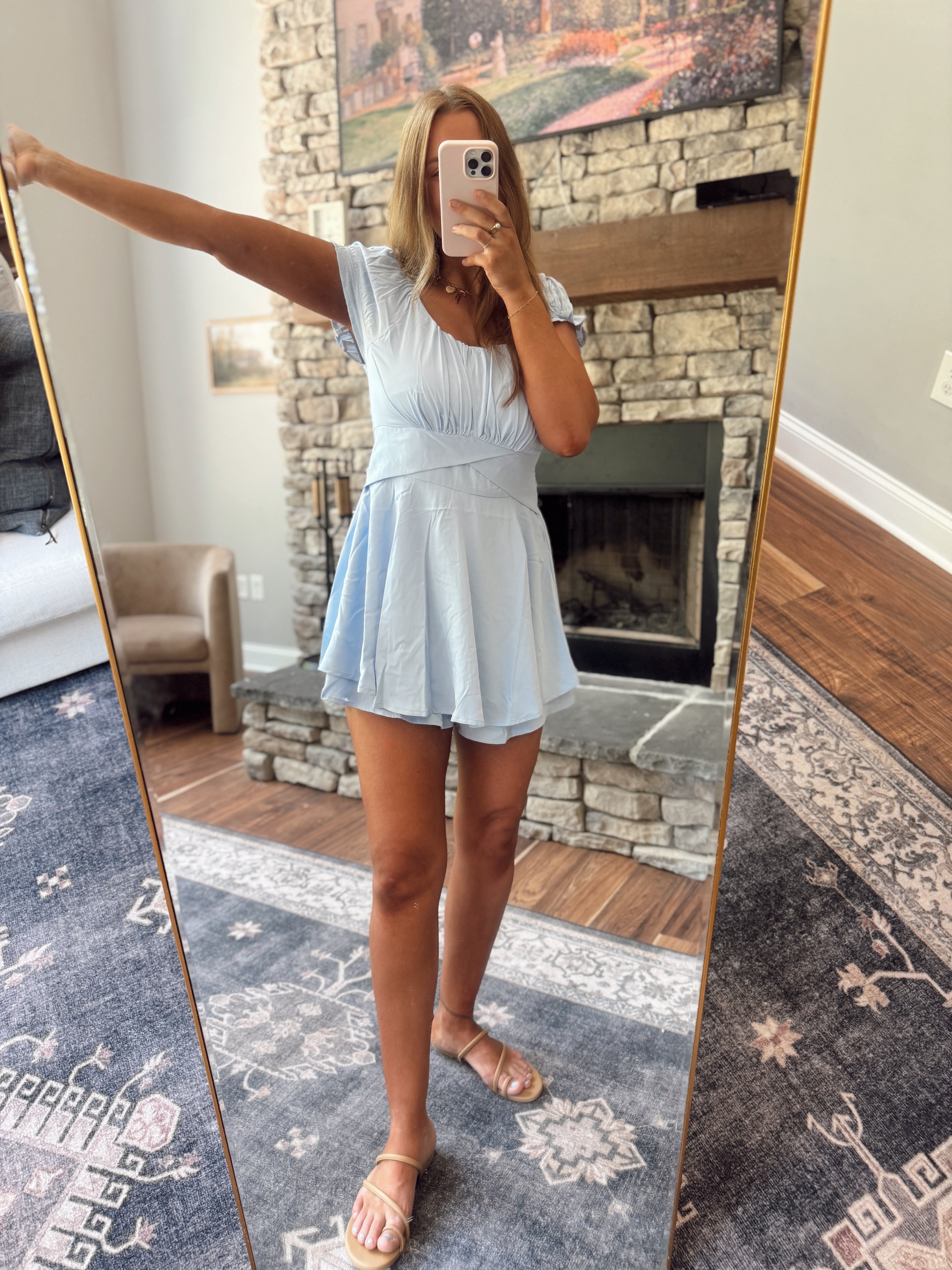 Light Blue Puff Sleeve Tie Waist Romper