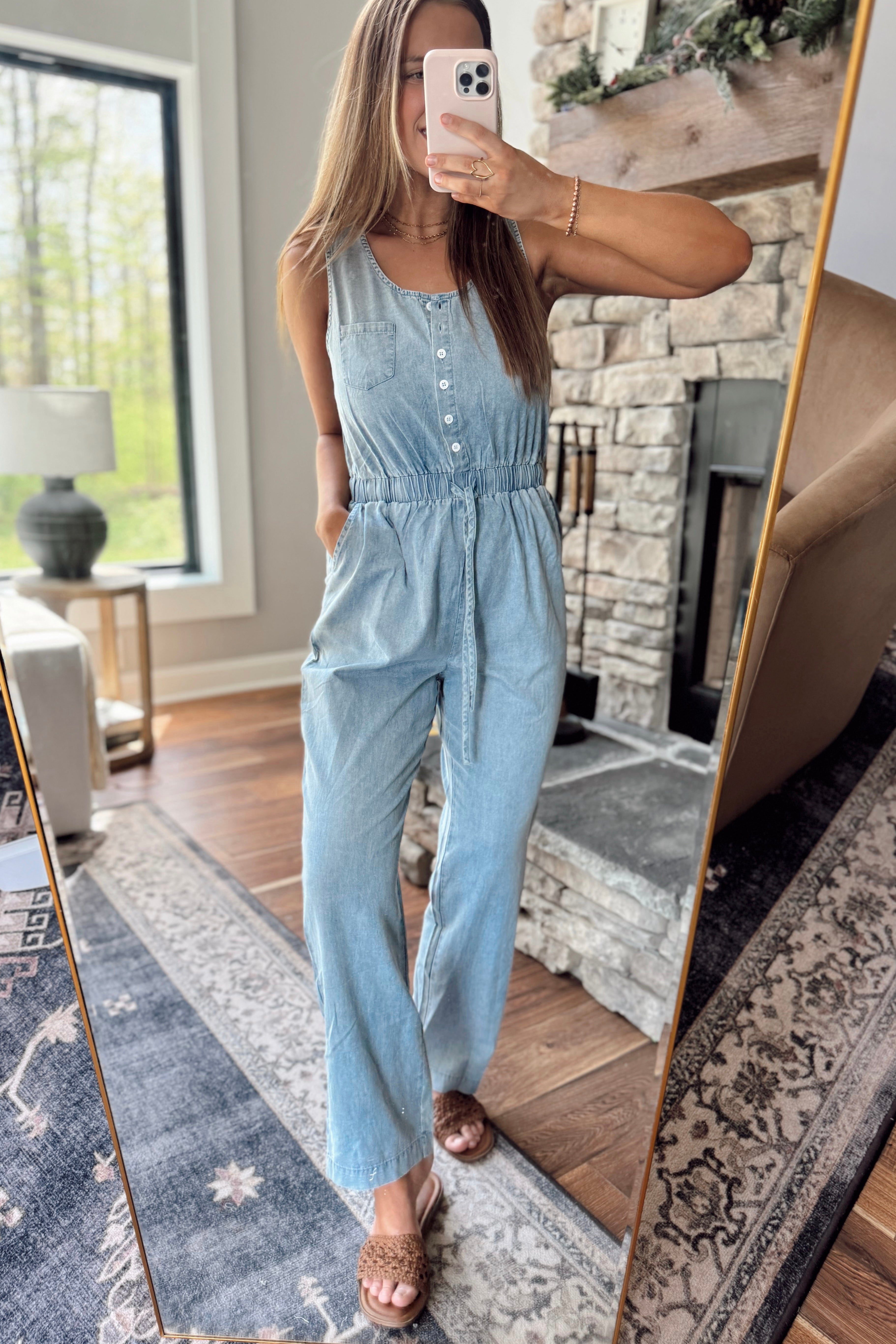 Light Denim Sleeveless Drawstring Waist Henley Jumpsuit
